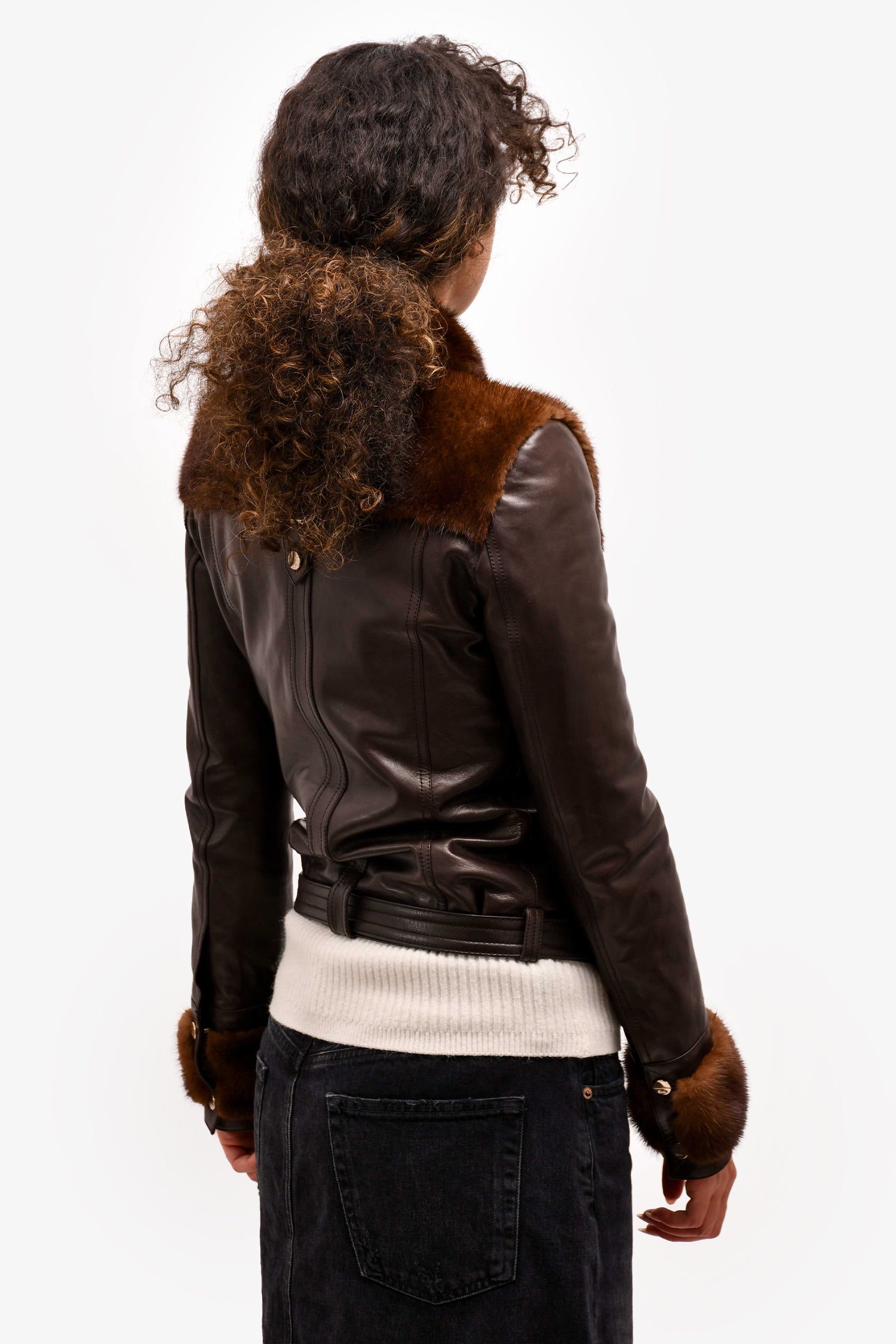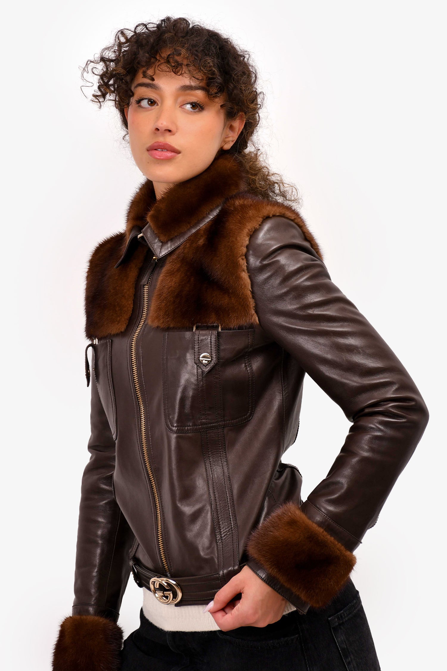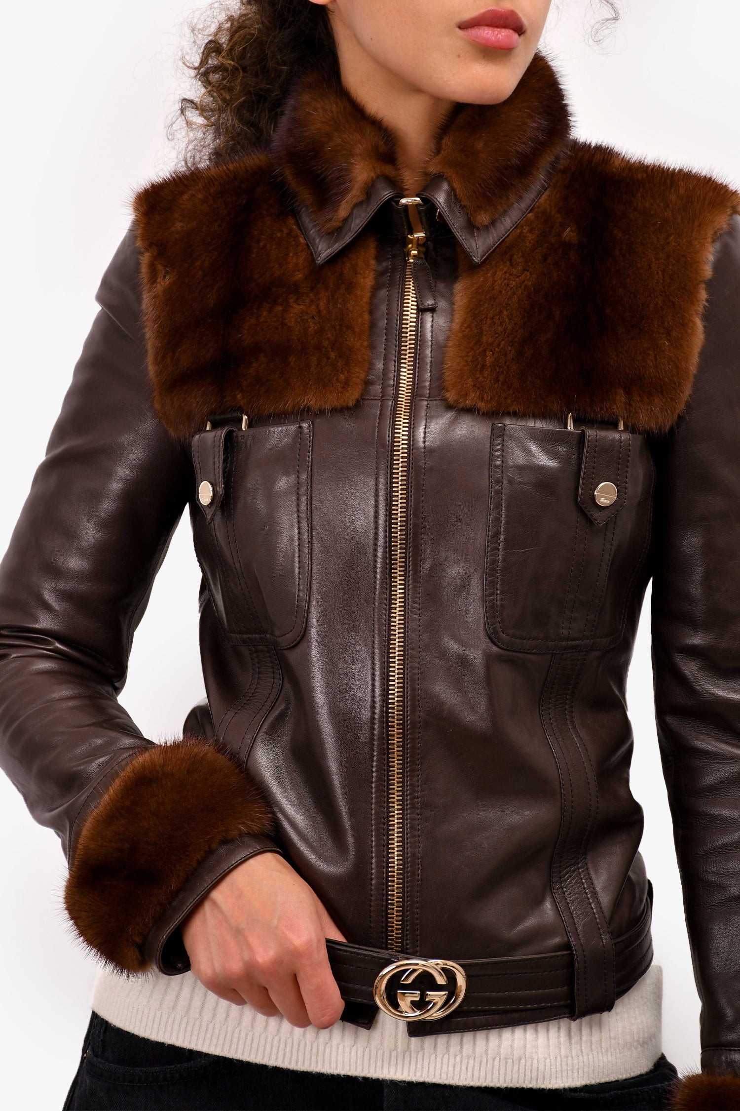 Refresh availabilityGucci Brown Leather/Fur Detail 'GG' Belt Jacket. Lined interior. Gold-tone hardware. Zip-up closure.