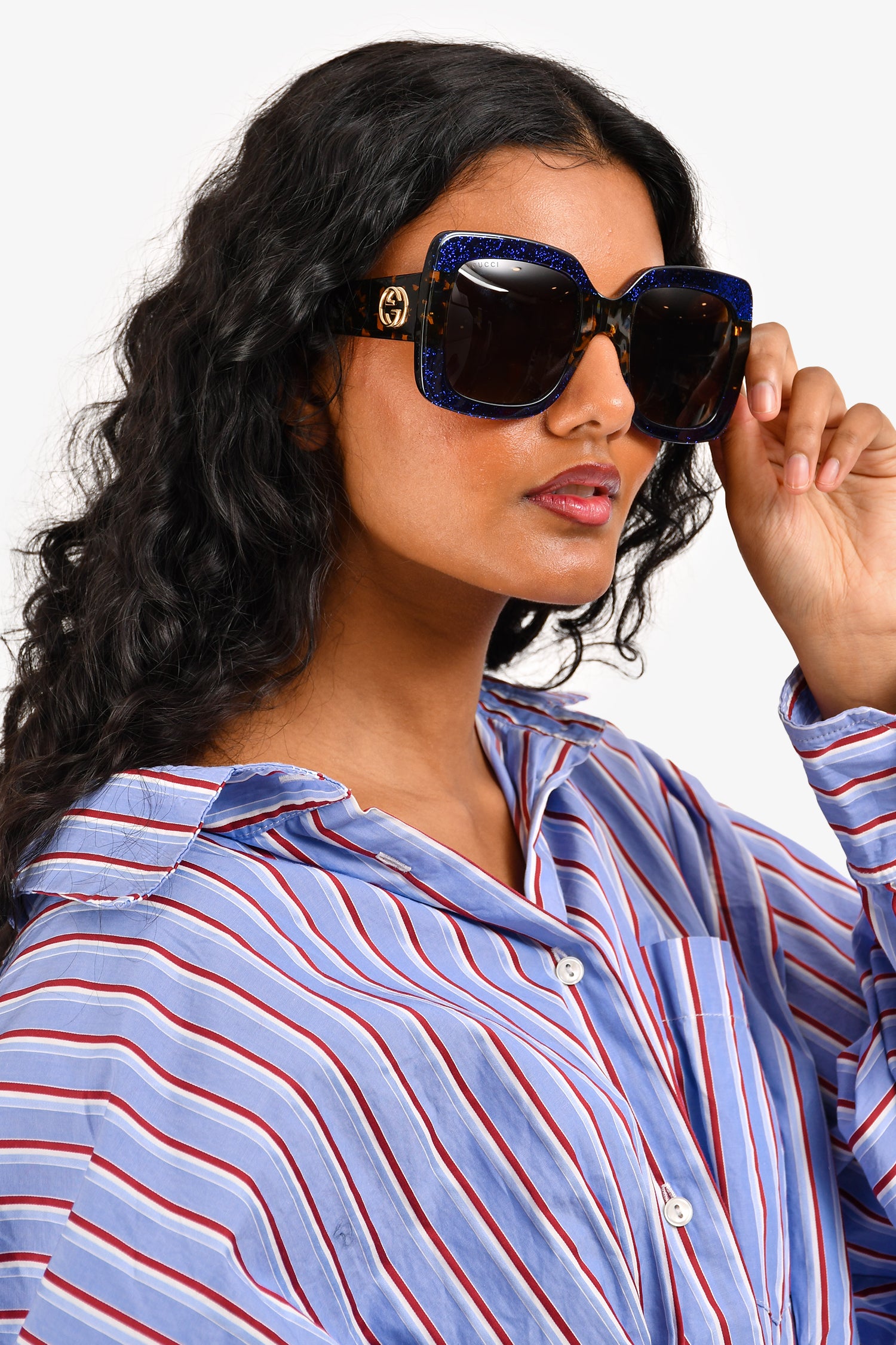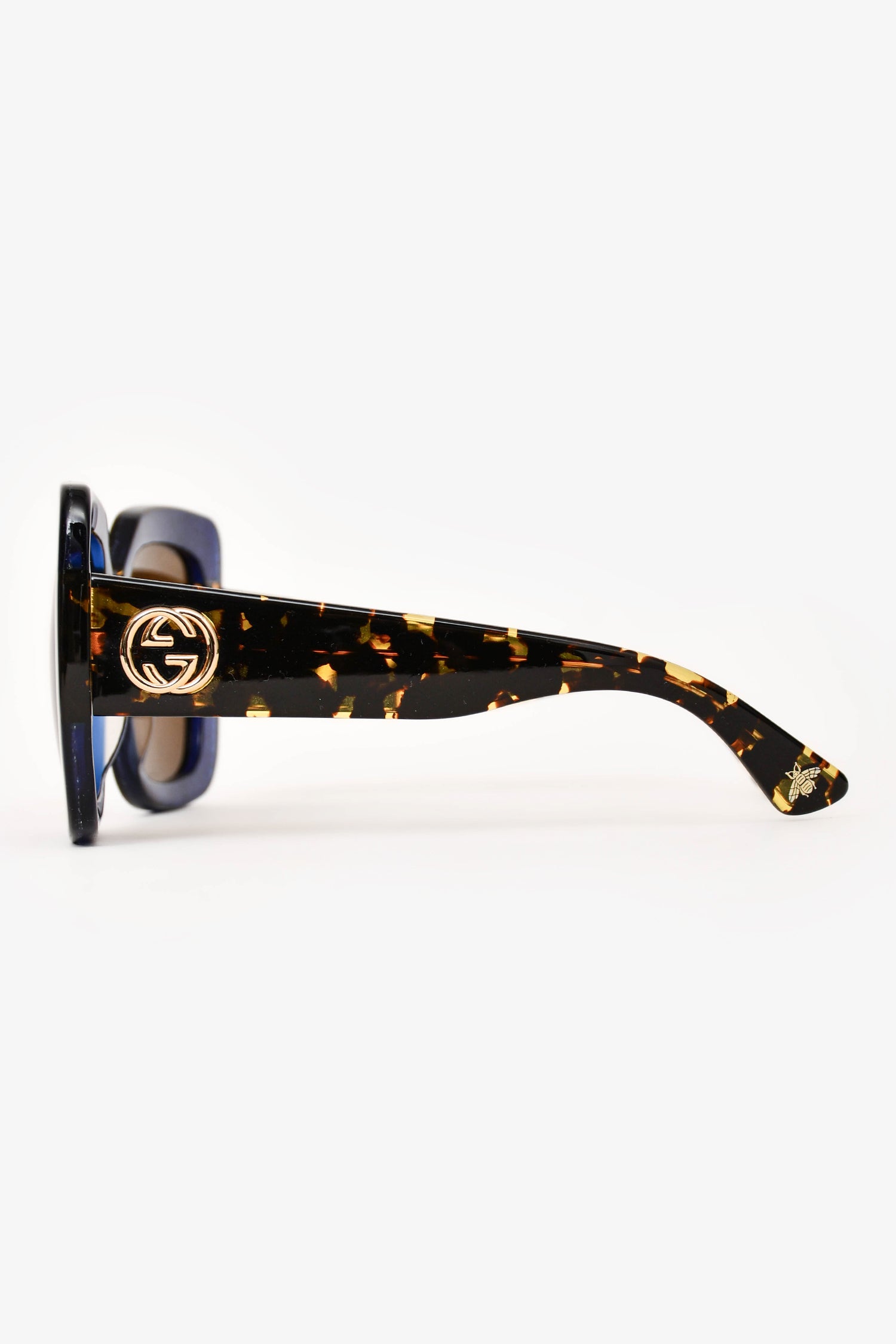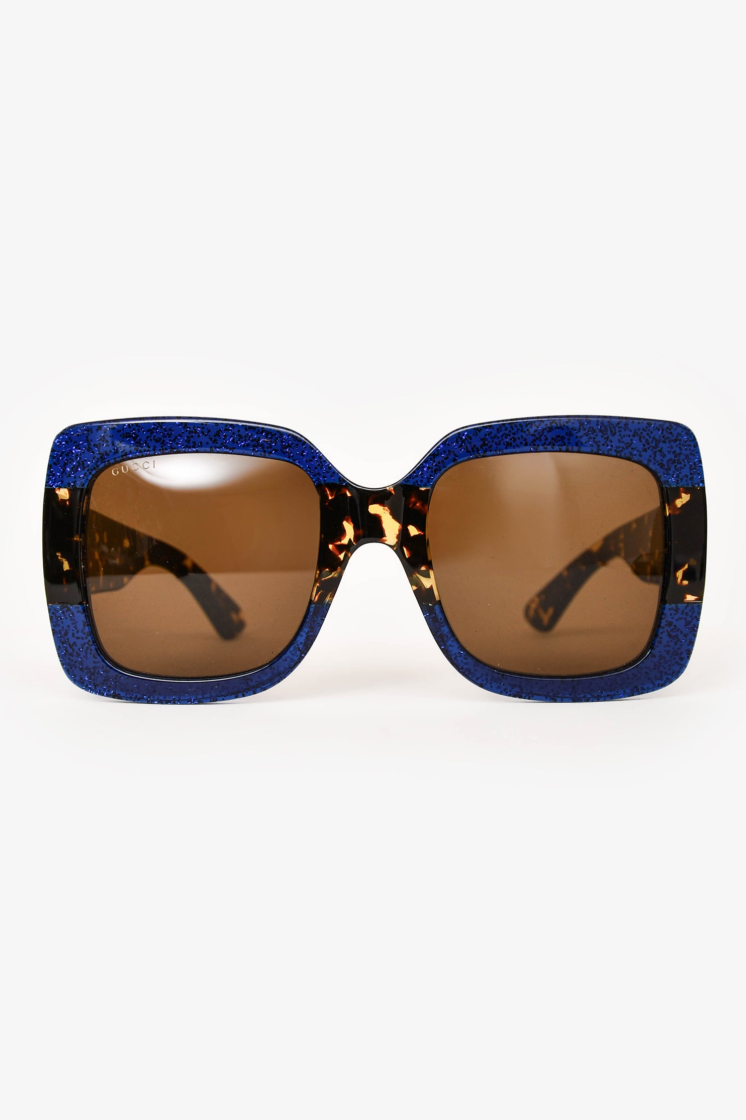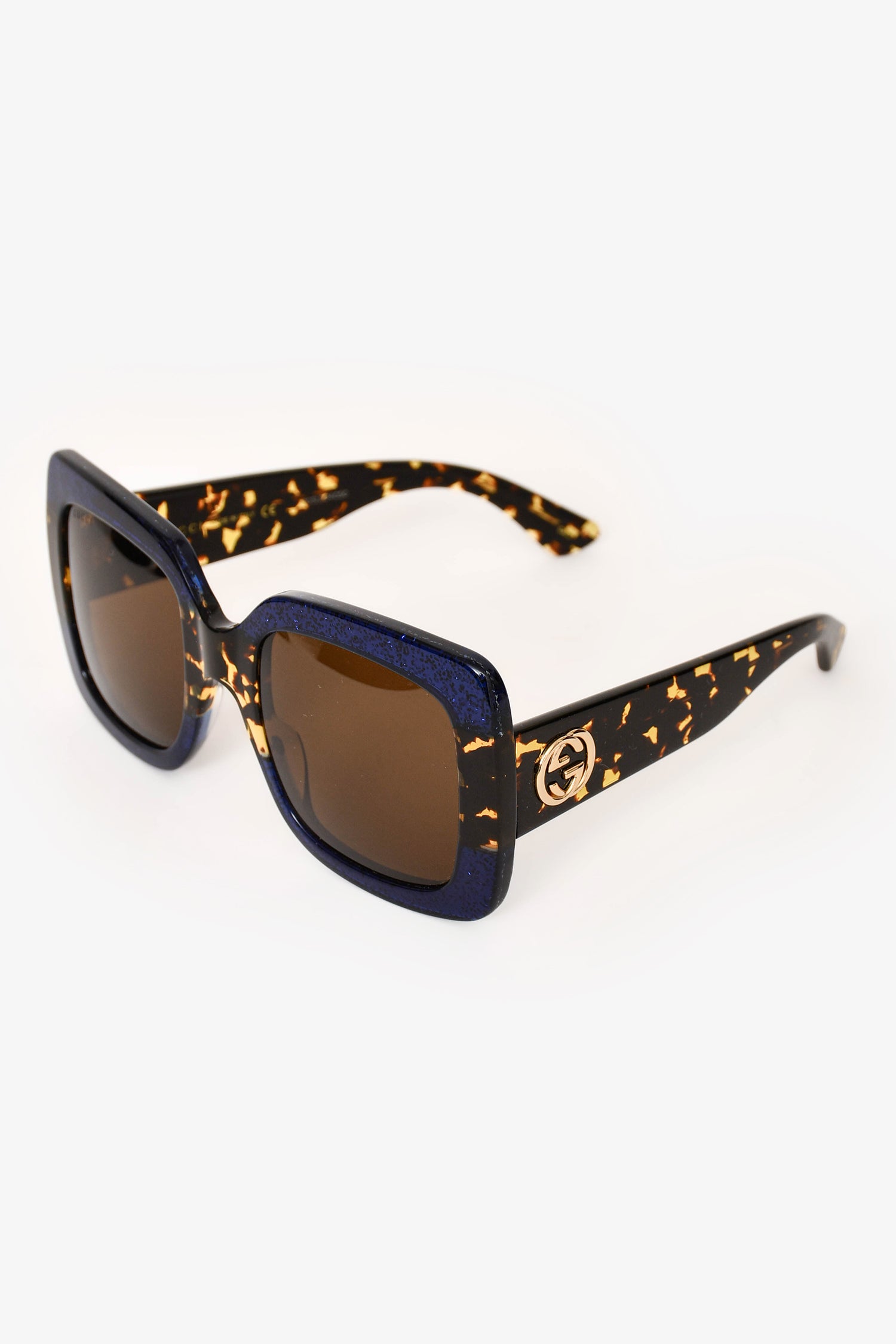 Refresh availabilityGucci Brown/Navy Tortoise Shell/Sparkled Square Framed Sunglasses. Oversized square frame. Gucci logo at temples.