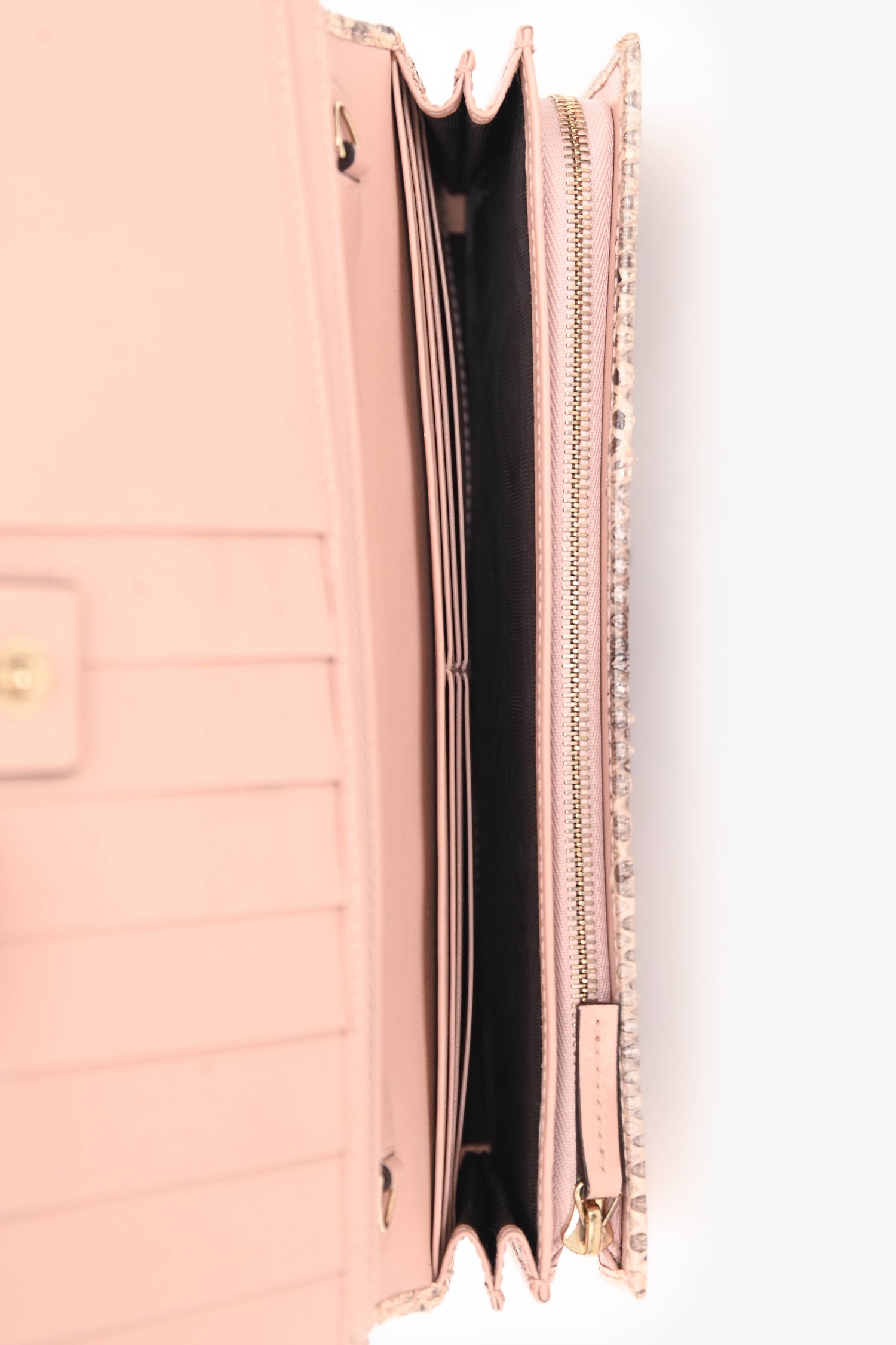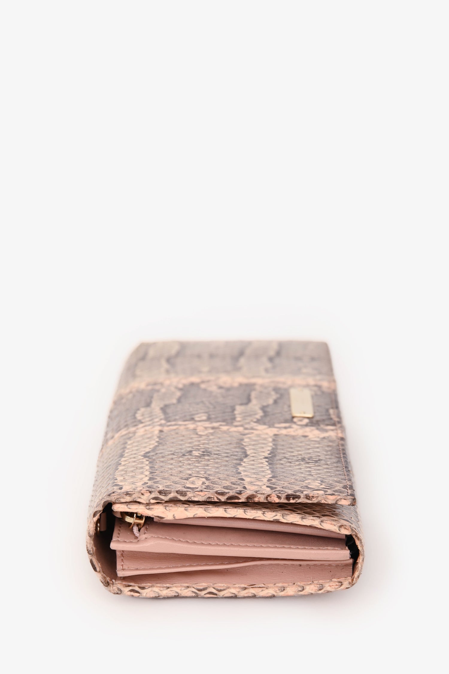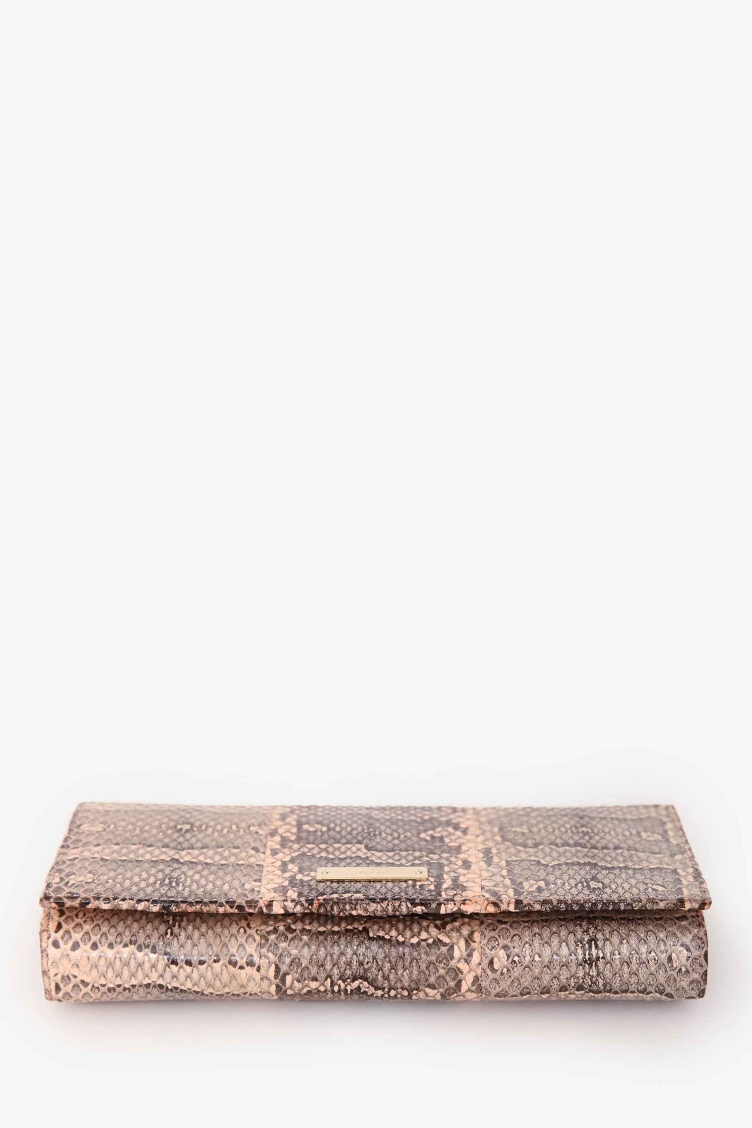 Refresh availabilityGucci Brown Snakeskin Long Wallet. Front fold-over flap with snap-button closure. Leather-lined interior. 13 card slots. 3 billfold compartments. 1 zippered compartment. Gold-tone hardware. Tonal stitching.