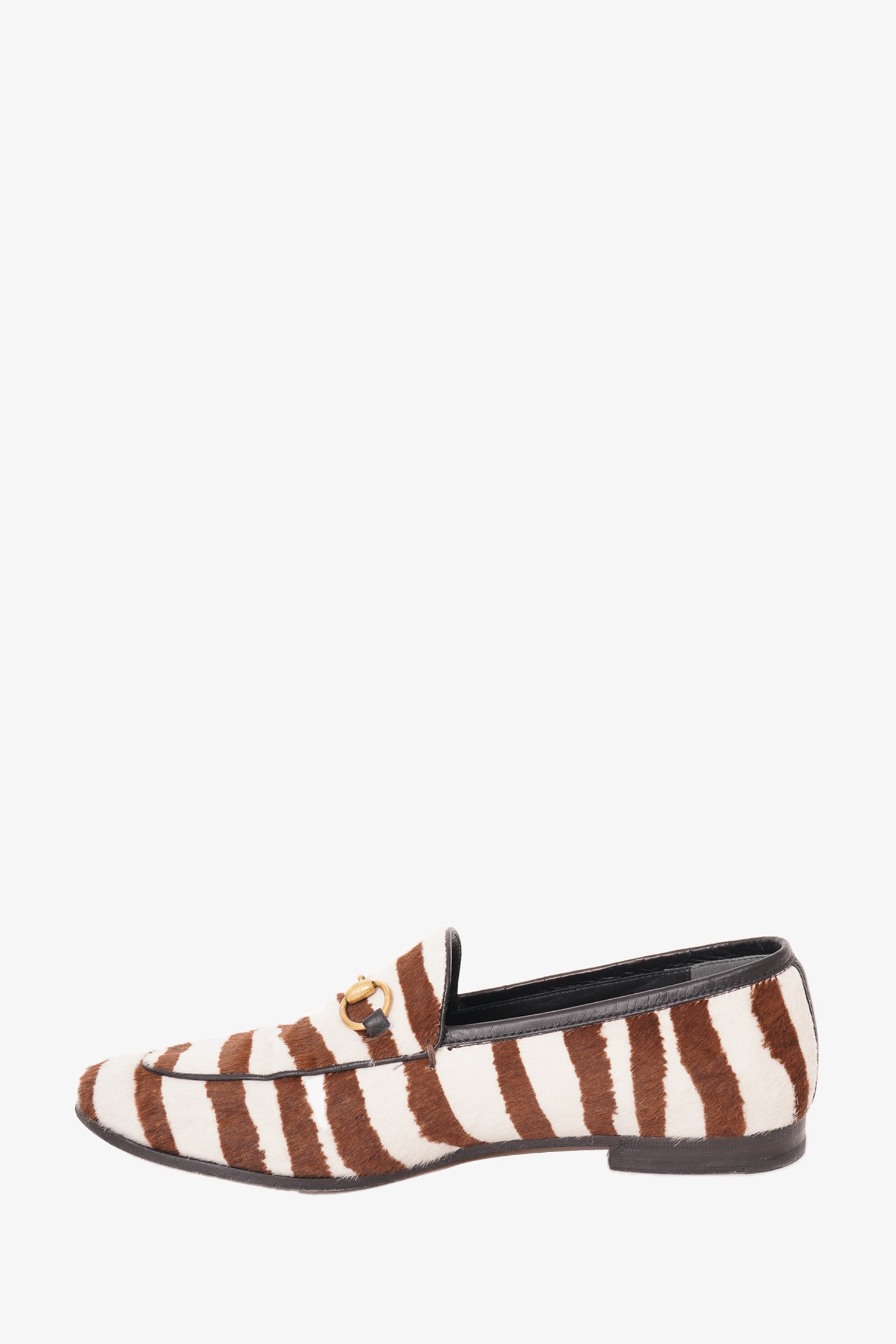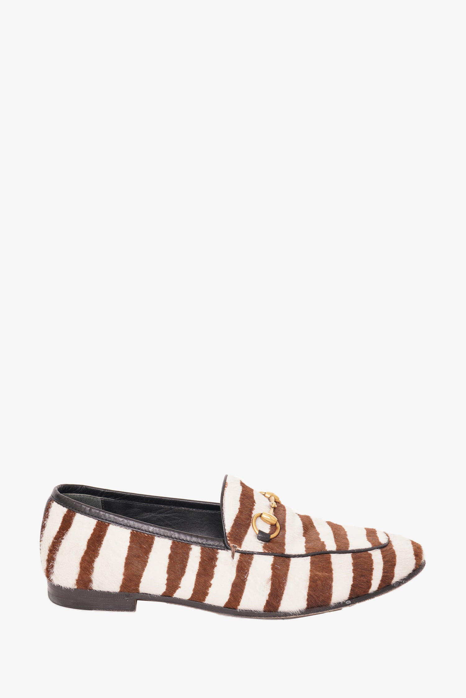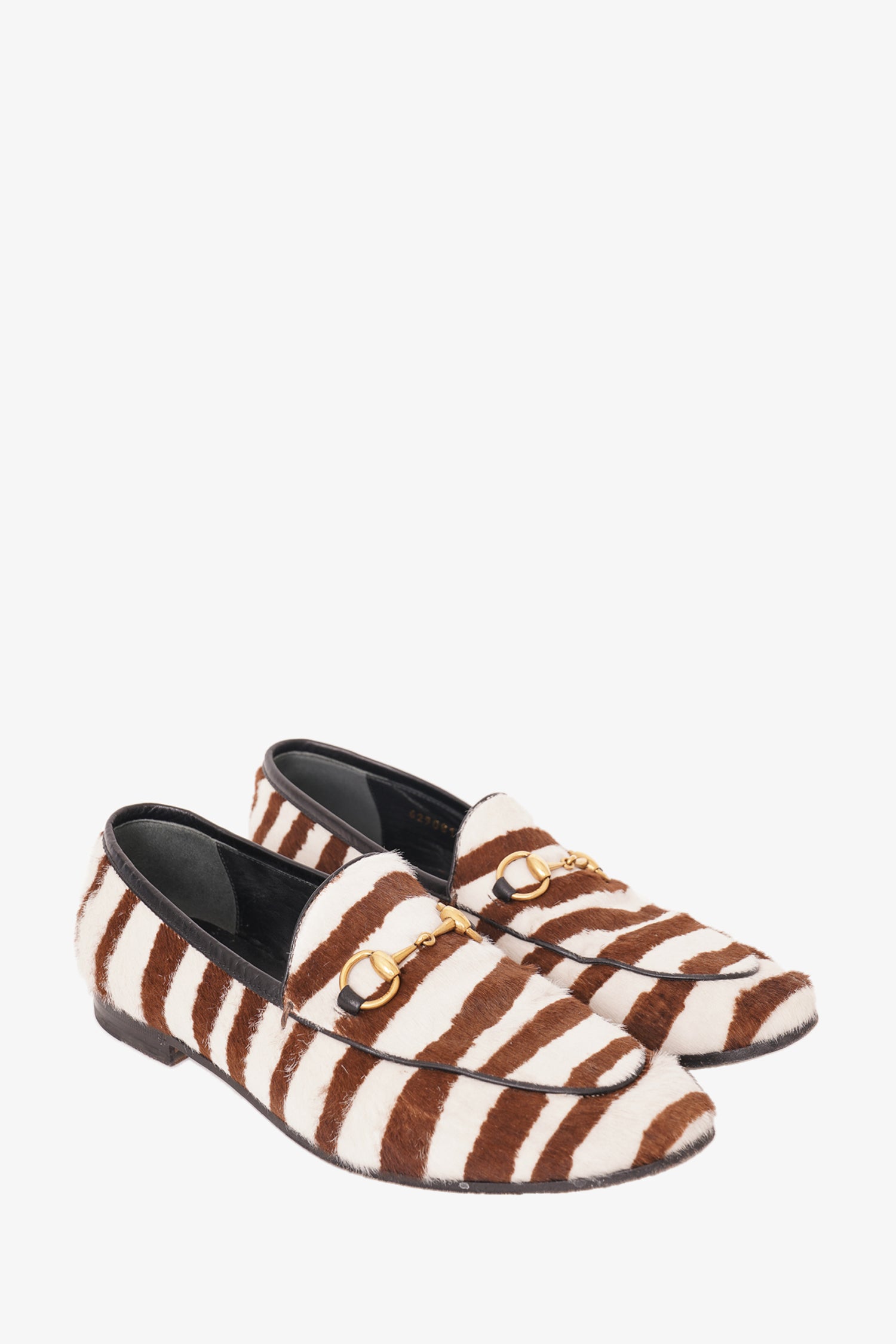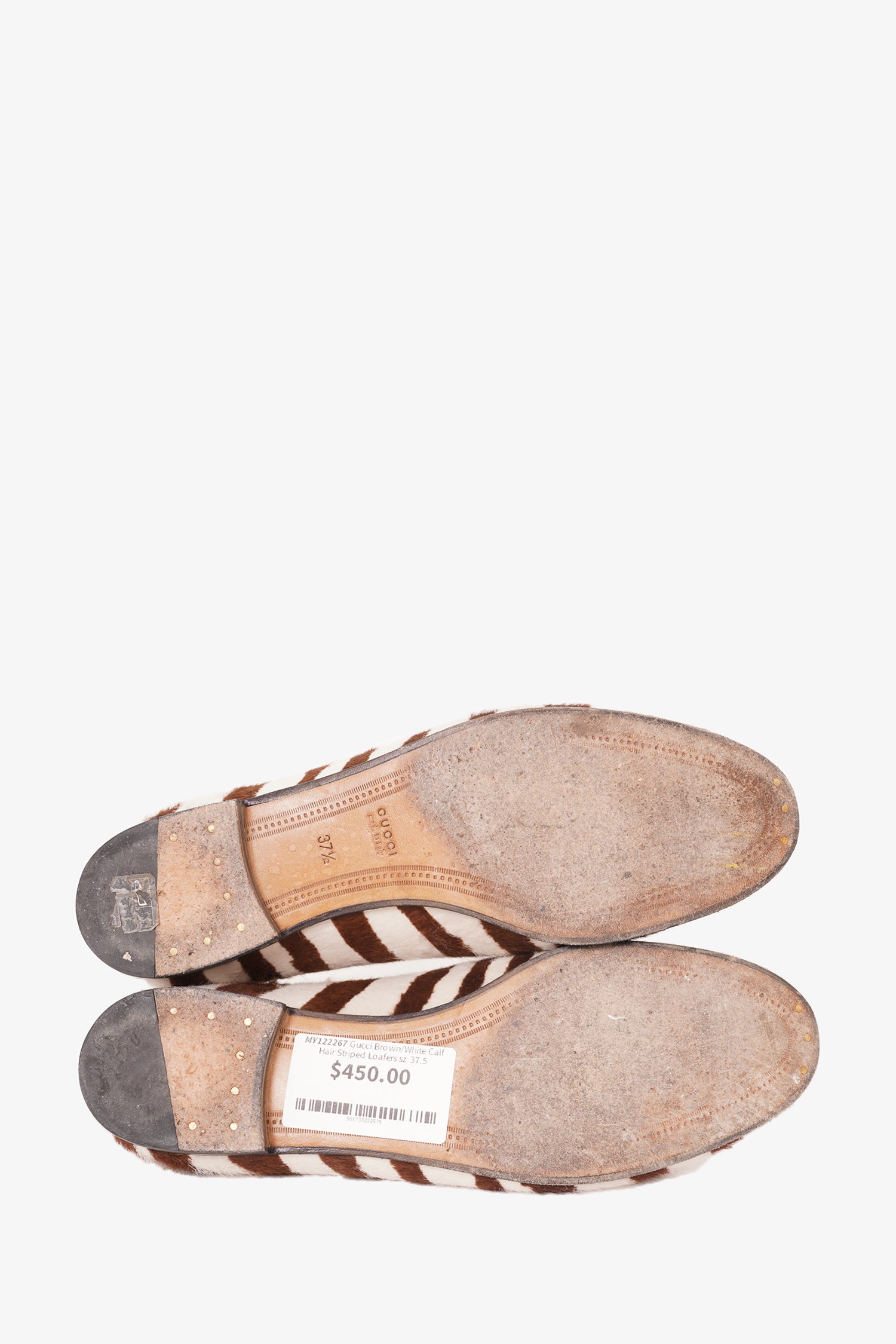 Refresh availabilityGucci Brown/White Calf Hair Striped Loafers. Round toe. Slip on. Gold-toned hardware. Tonal stitching.