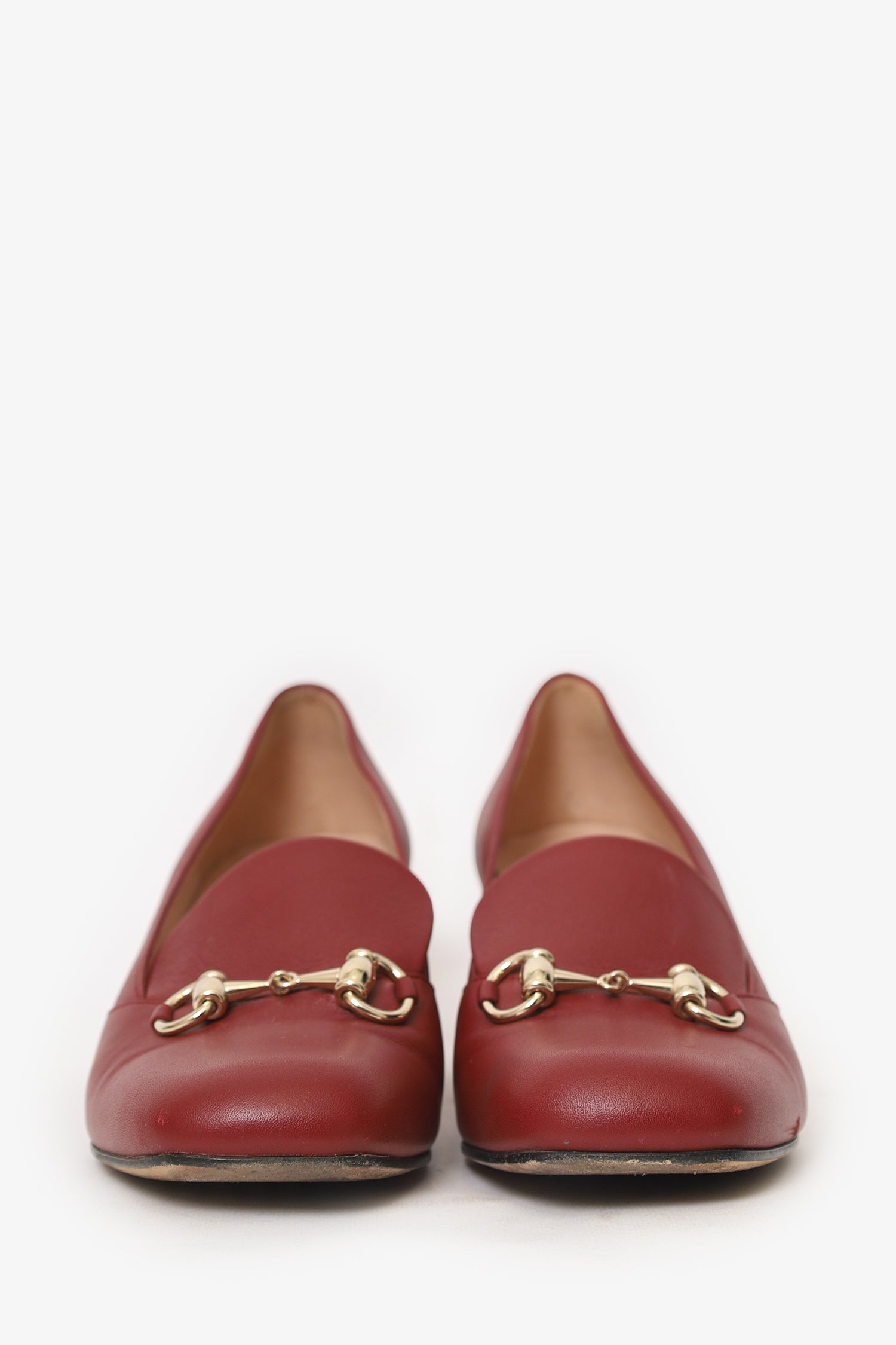 Refresh availabilityGucci Burgundy Leather Horsebit Block Heels. Slip-on. Squared-toe. Horse-bit detail at vamp. Tonal stitching.
