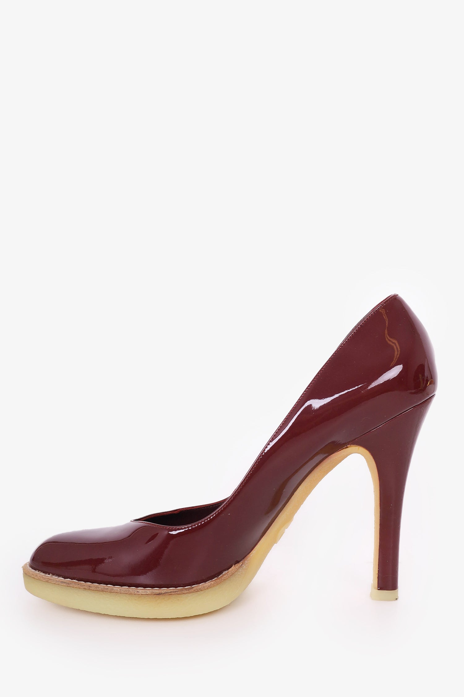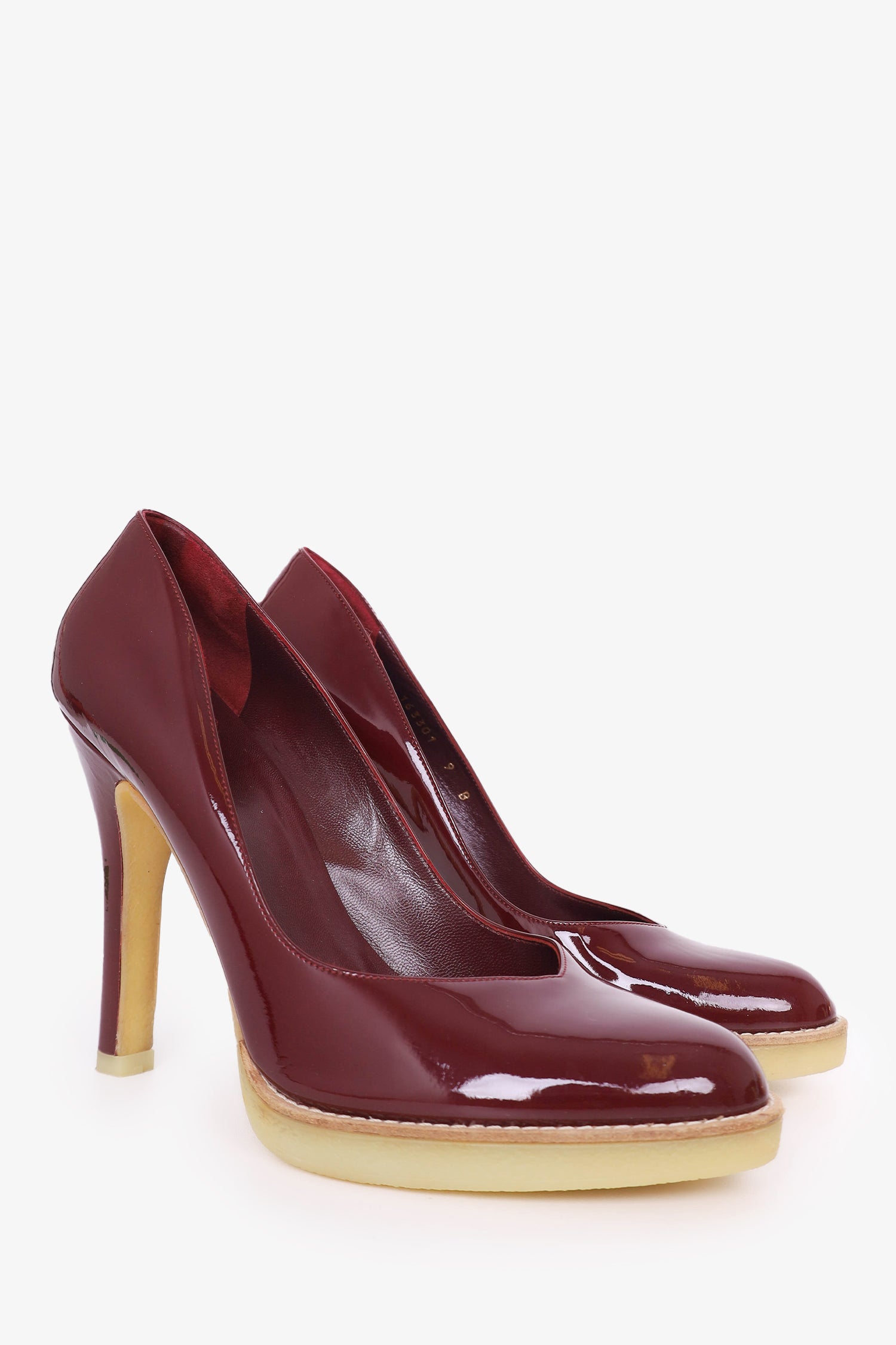 Refresh availabilityGucci Burgundy Patent Leather Round Toe Pumps. Slip-on. Pointed toe. Contrast and tonal stitching. Rubber bottom soles.