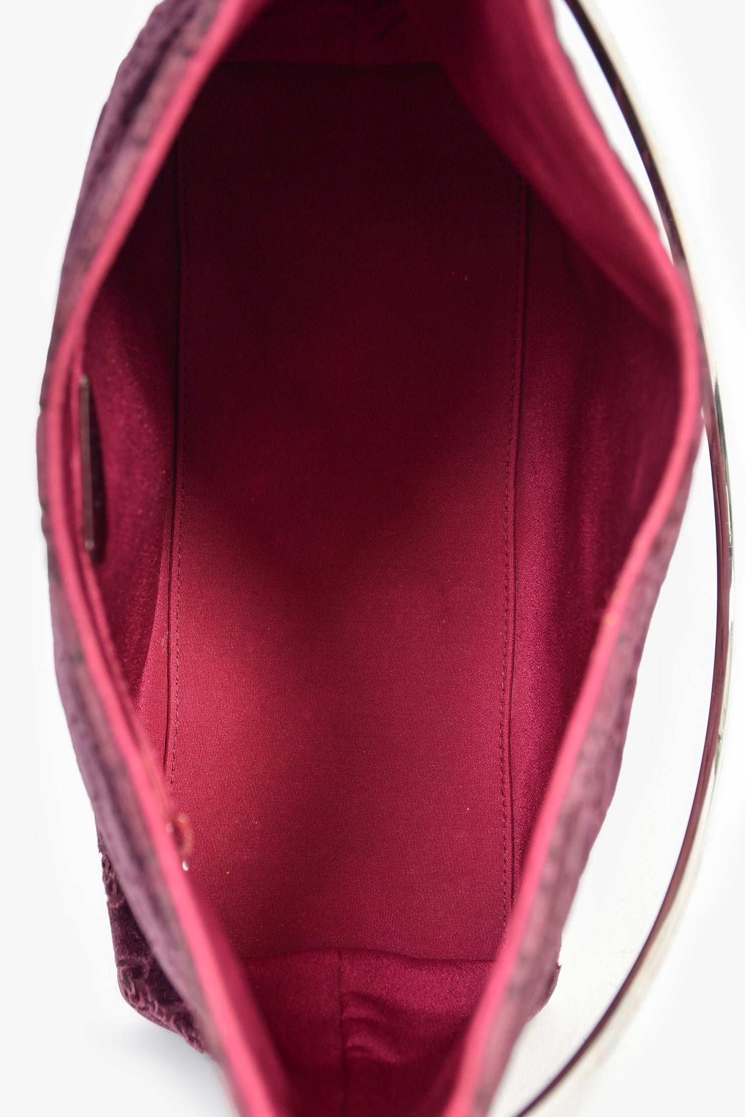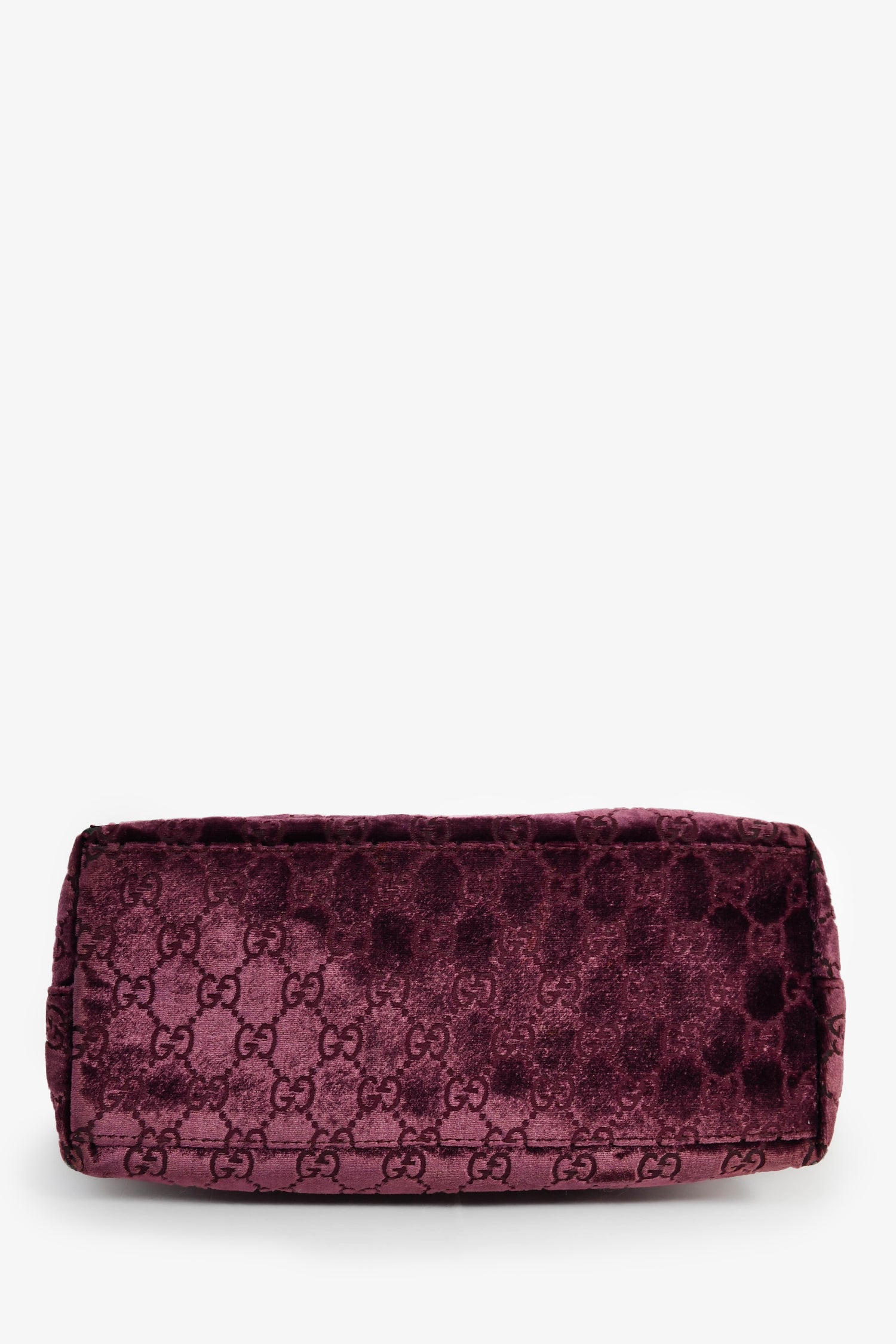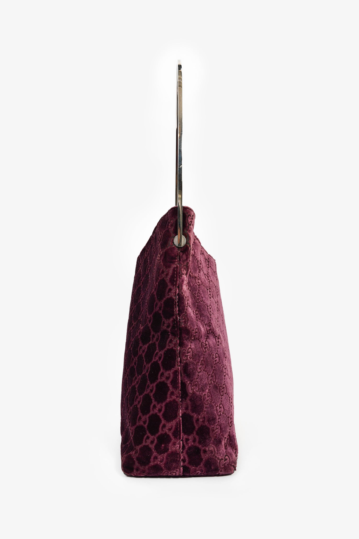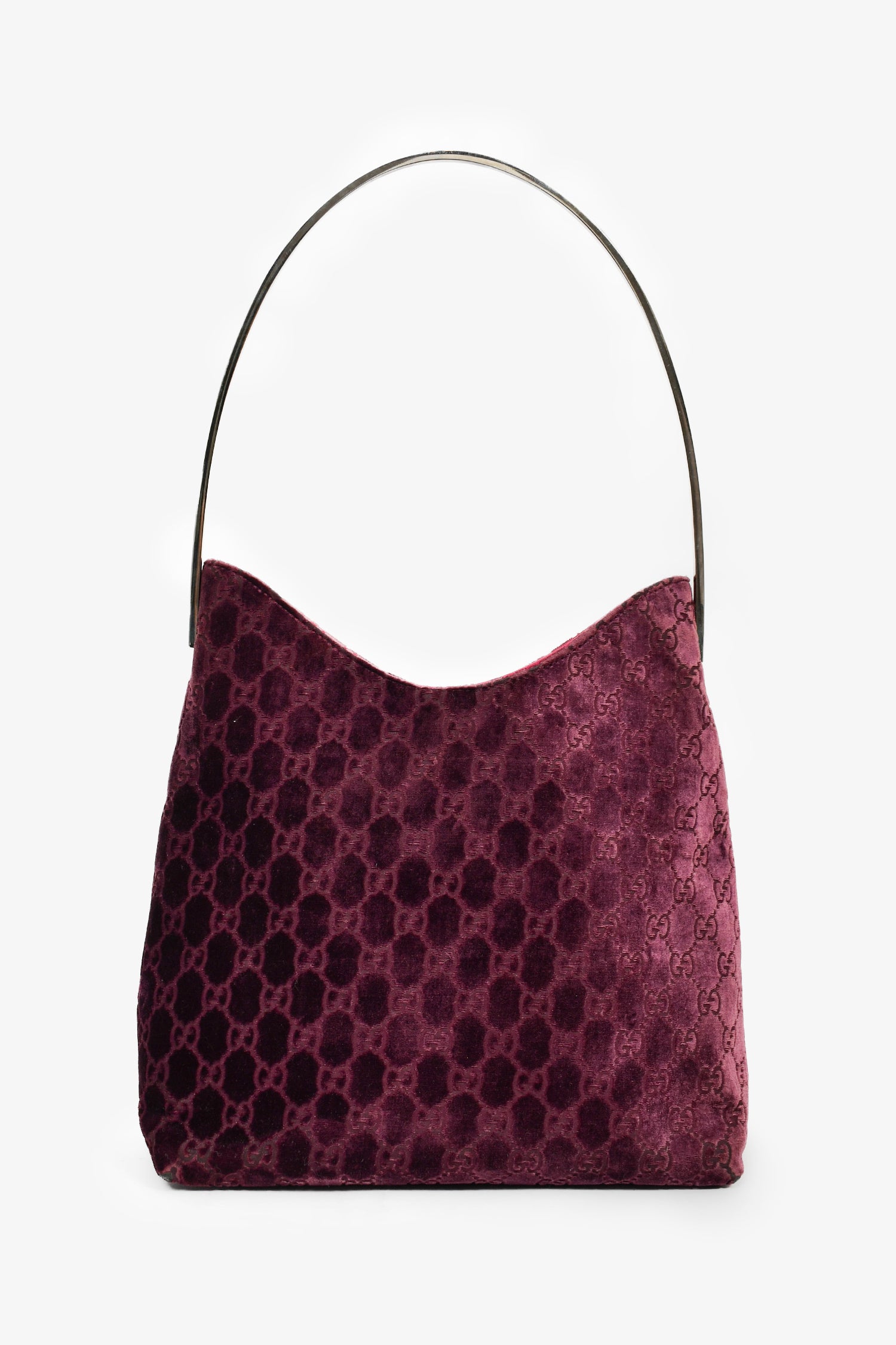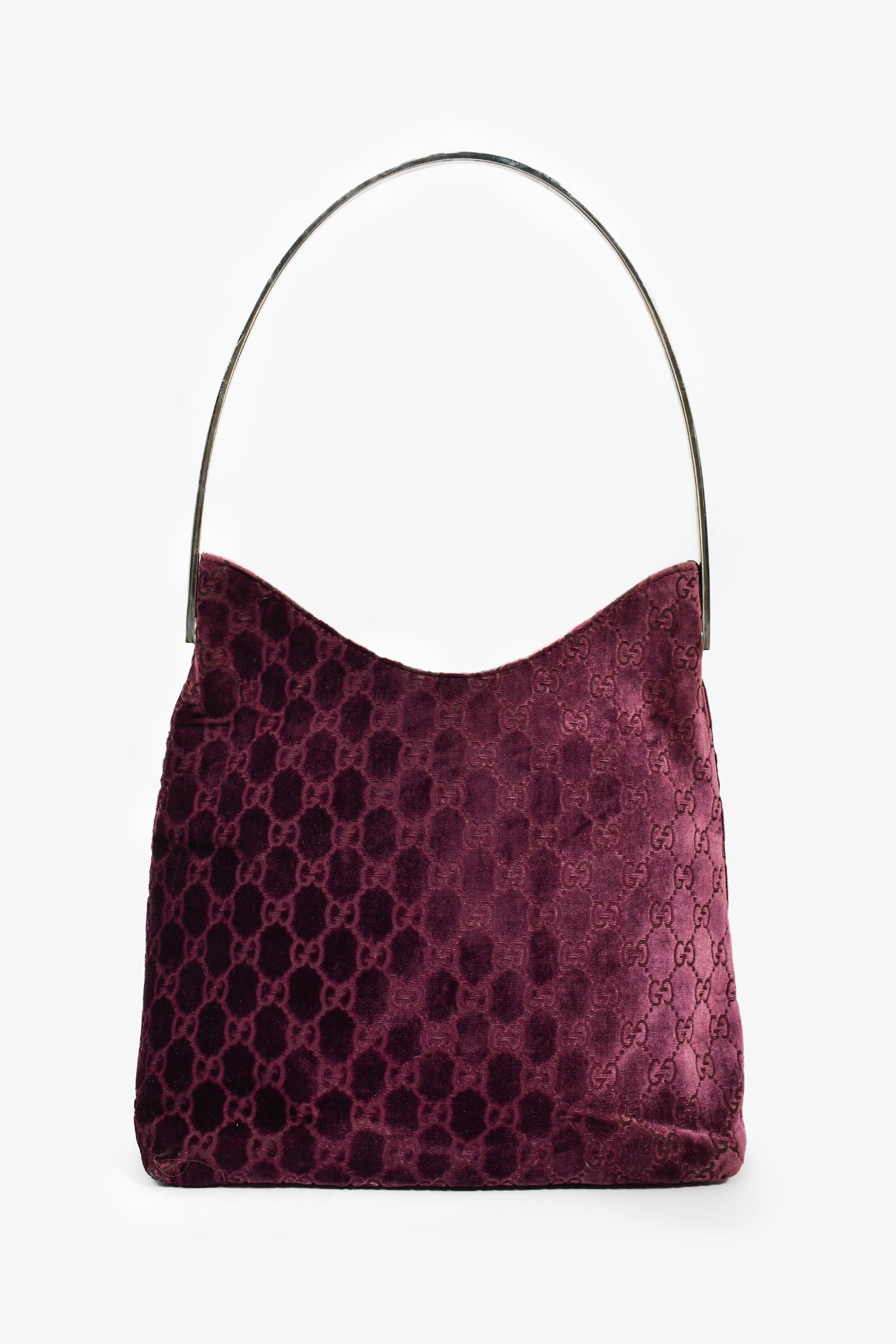 Refresh availabilityGucci by Tom Ford 1997 Purple Velvet GG Monogram Shoulder Bag. Silver-tone hardware. Velvet monogrammed exterior. Rounded top handle. Lined satin interior with a zipped compartment. Tonal stitching.