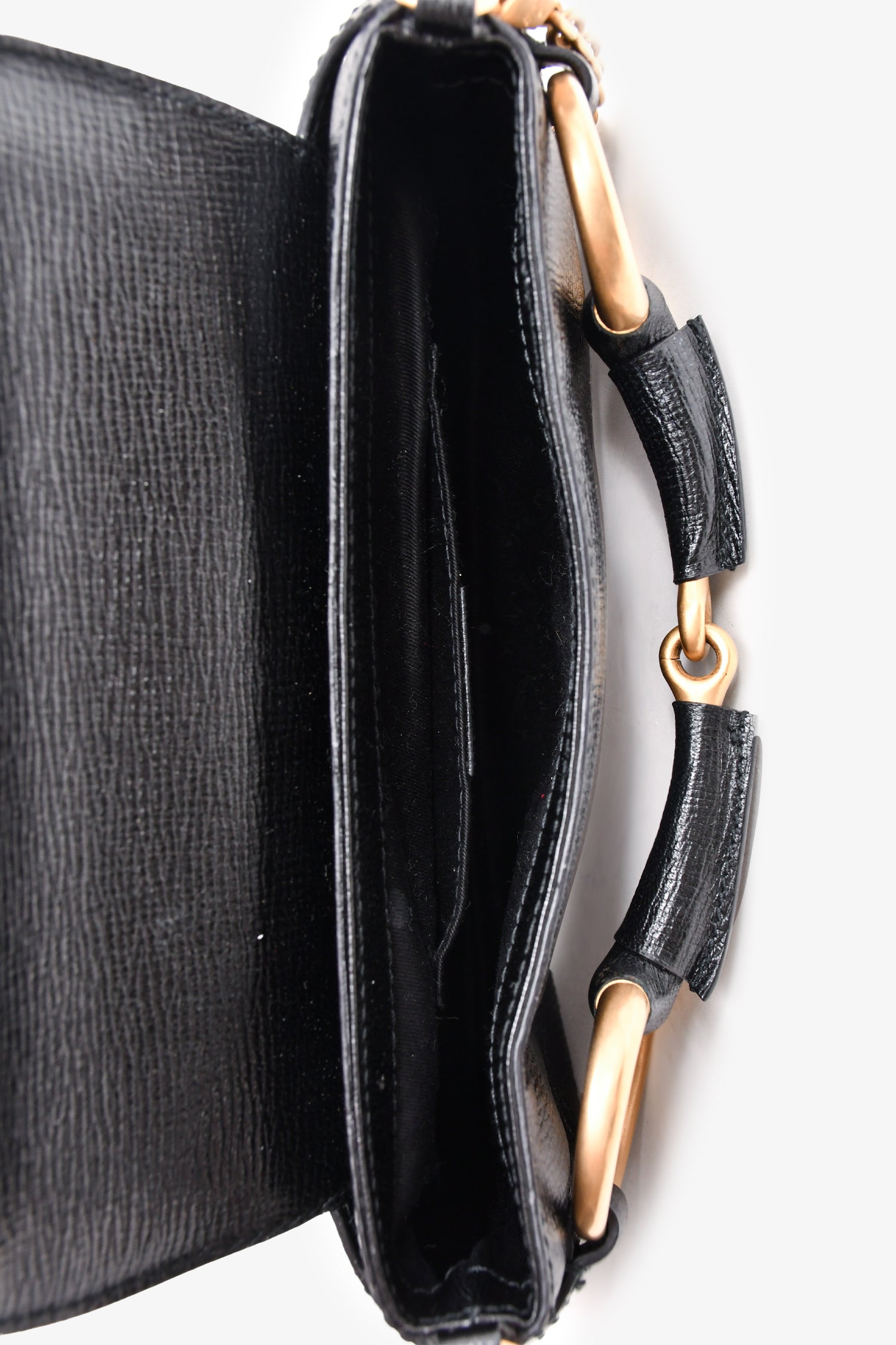 Refresh availabilityGucci by Tom Ford 2003 Black Leather Horsebit Pochette. Gold-tone hardware. Fold-over flap with slip closure. Removable chain. Black canvas interior lining. Tonal stitching.