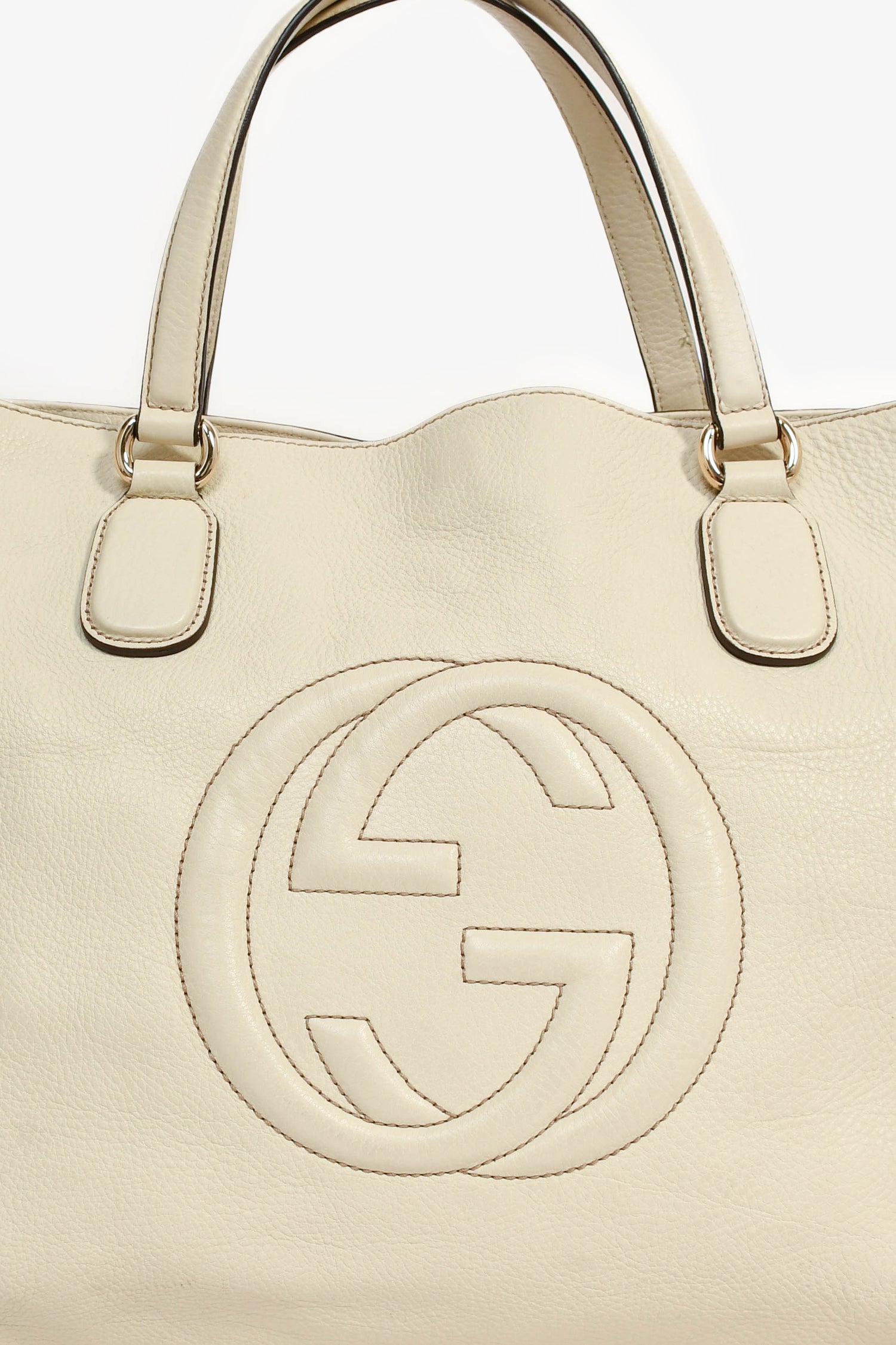 Refresh availabilityGucci Cream Grained Leather Soho Large Tote Bag. Gold-tone hardware. Flat top handles. Coated trimming. Lined canvas interior with a zipped compartment and 2 pockets. Bottom bag feet. Tonal stitching.