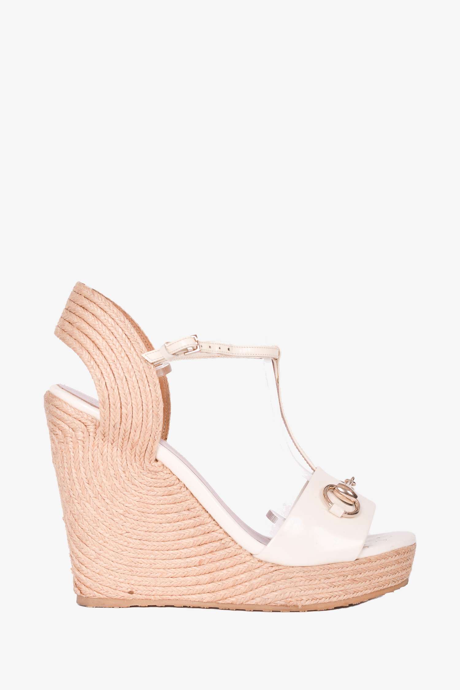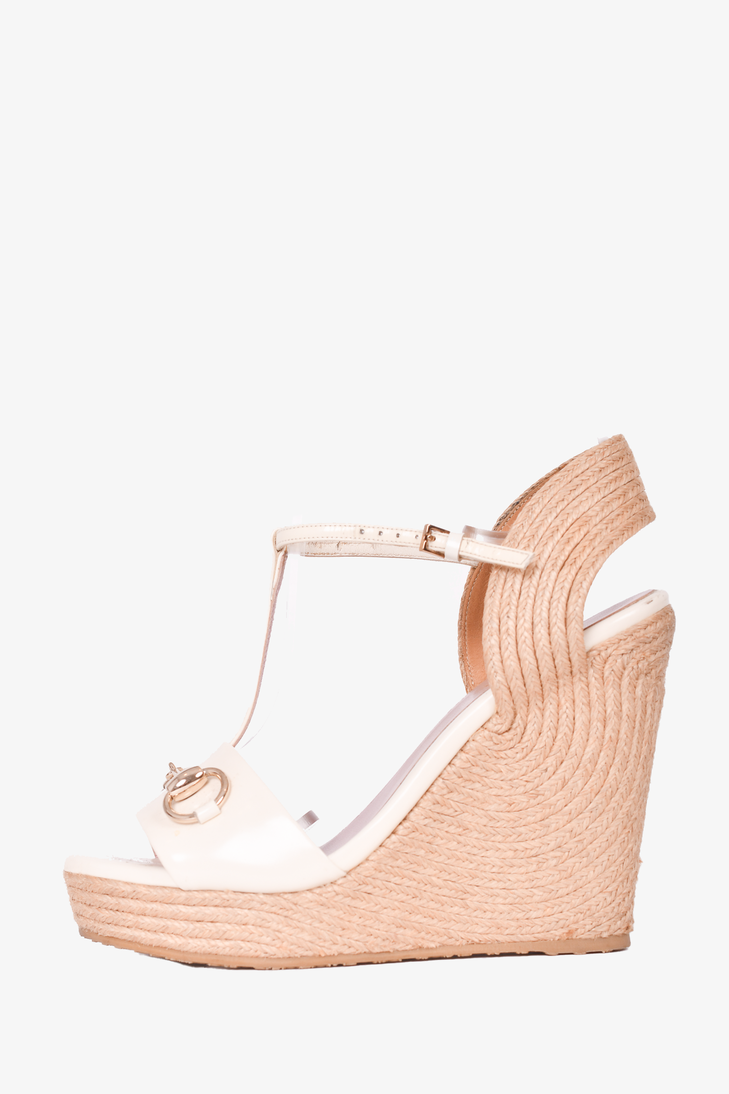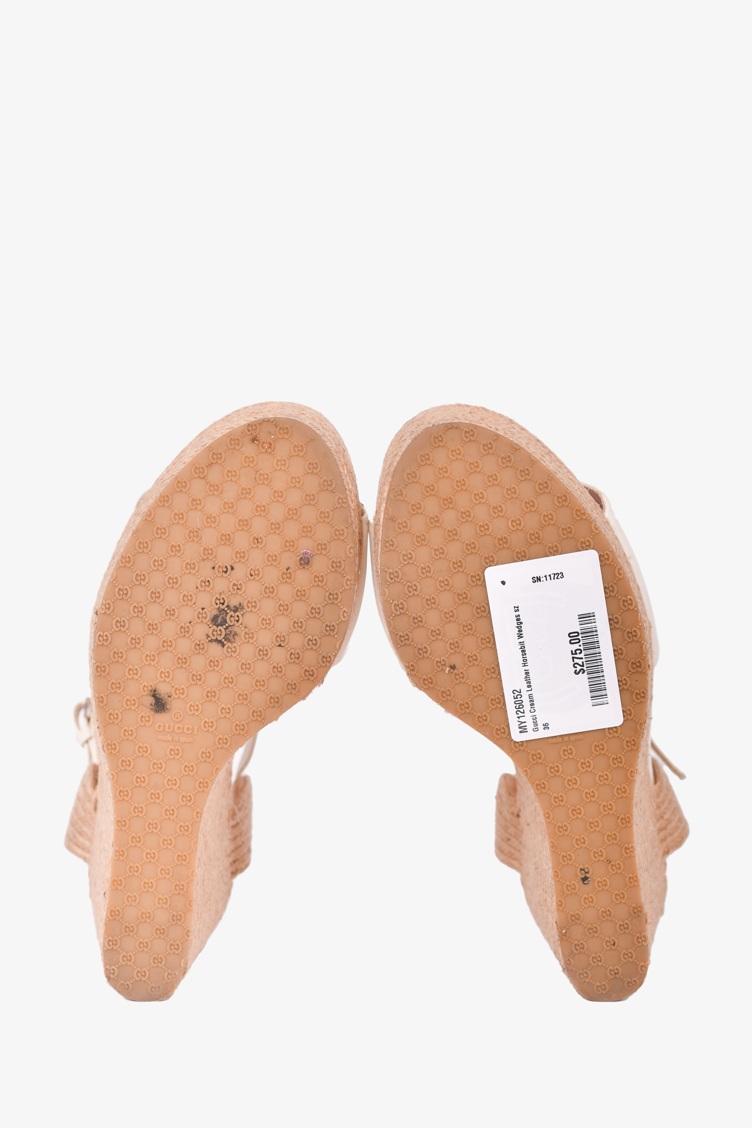 Refresh availabilityGucci Cream Leather Horsebit Wedges. Open toe. Ankle strap with buckle closure. Gold-tone hardware. Tonal stitching.