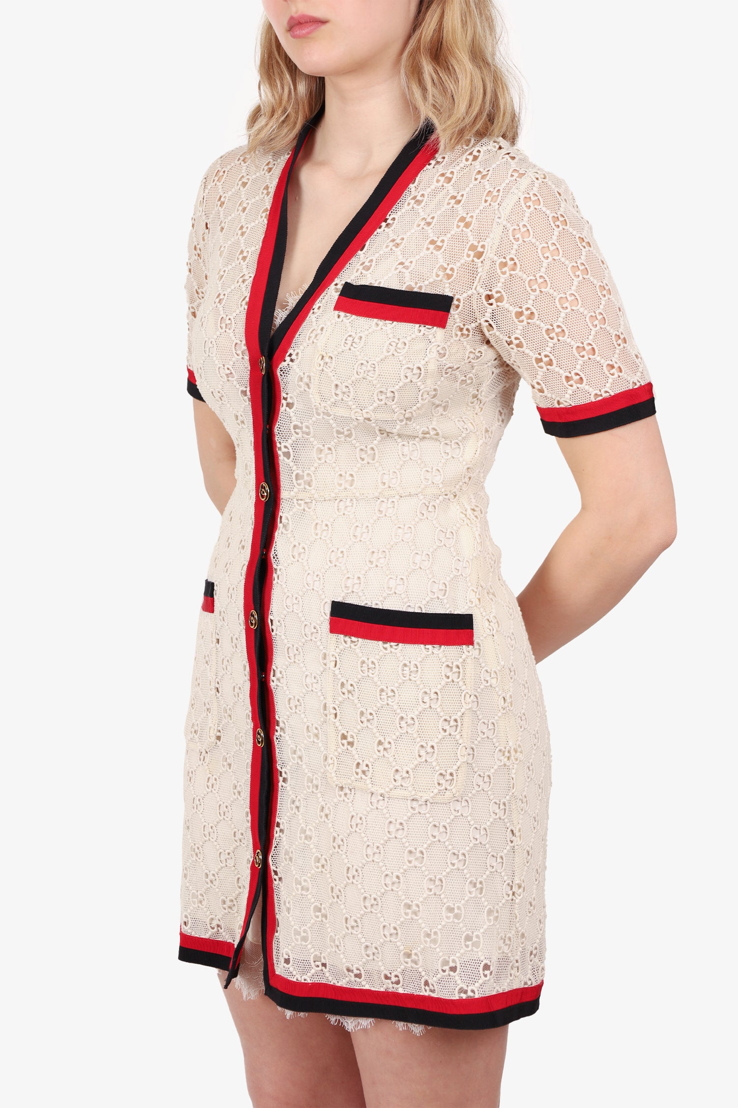 Refresh availabilityGucci Cream/Red GG Monogram Lac Striped Trim Dress with Slip. Front button and snap closure. Liner slip with zip closure and lace detail. Tonal stitching.