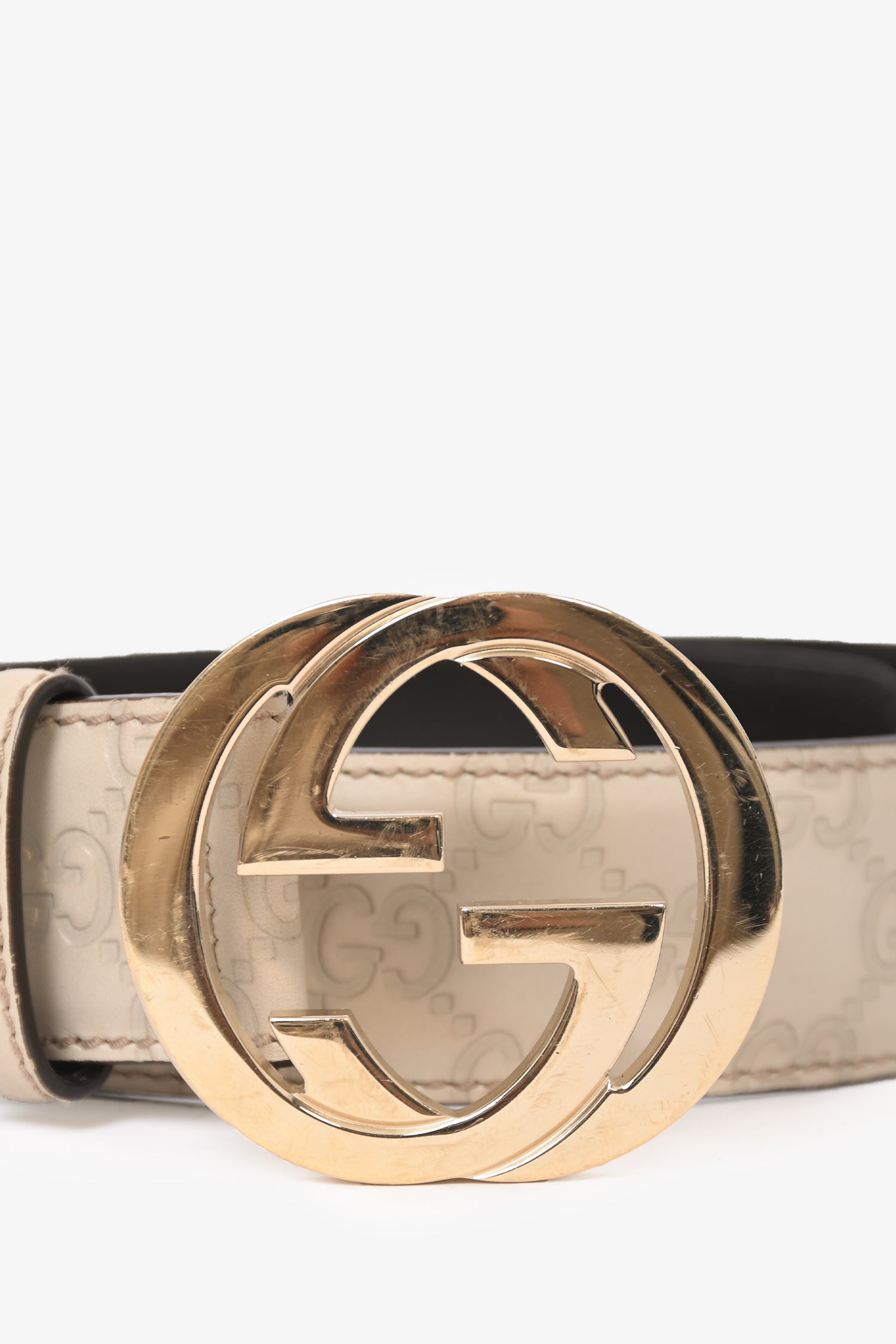 Refresh availabilityGucci Cream/Silver Leather Tone GG Belt. Buckle closure. Tonal stitching.