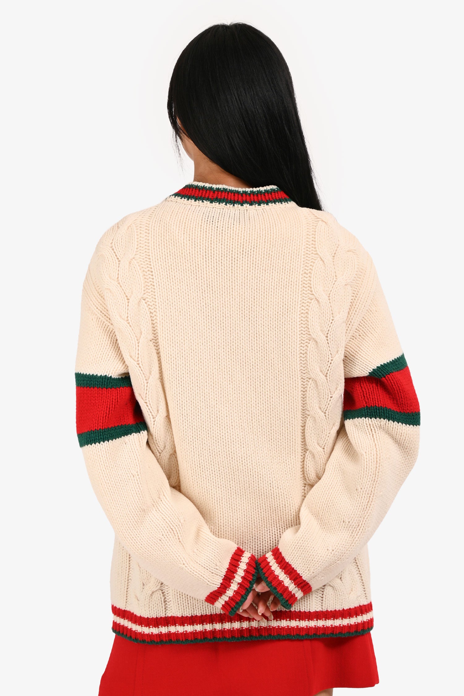 Refresh availabilityGucci Cream/Web Wool Knit Cardigan. V-neckline. Front button closure. Front slip pockets. Ribbed cuffs and hem. Tonal stitching.