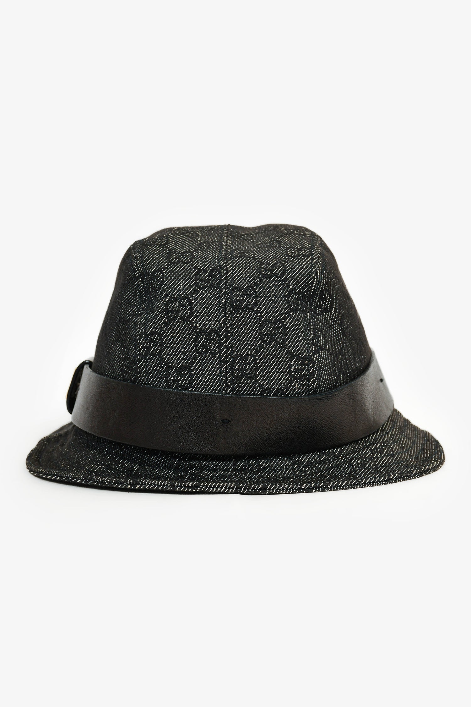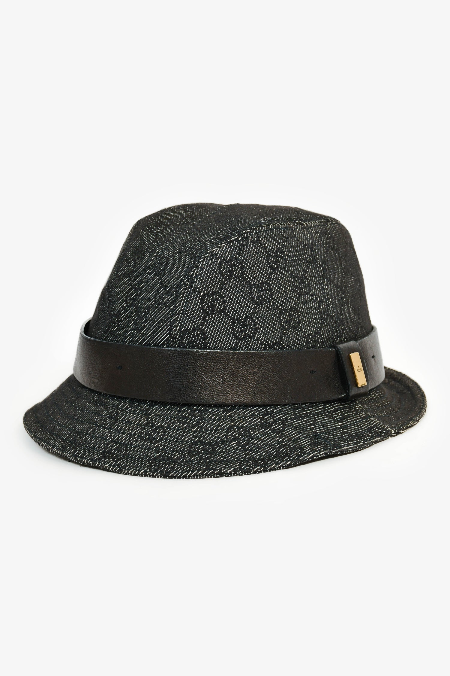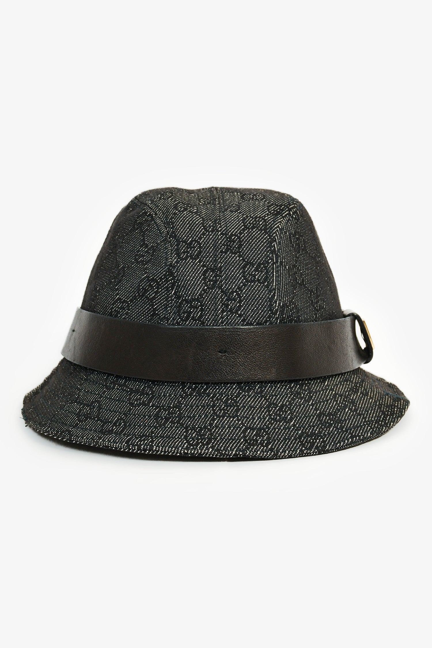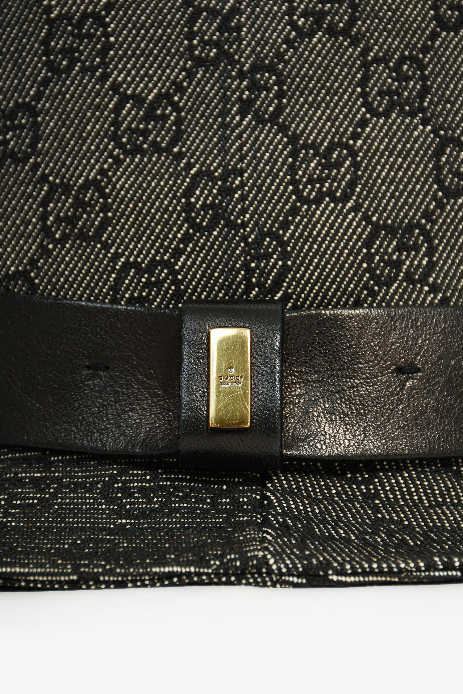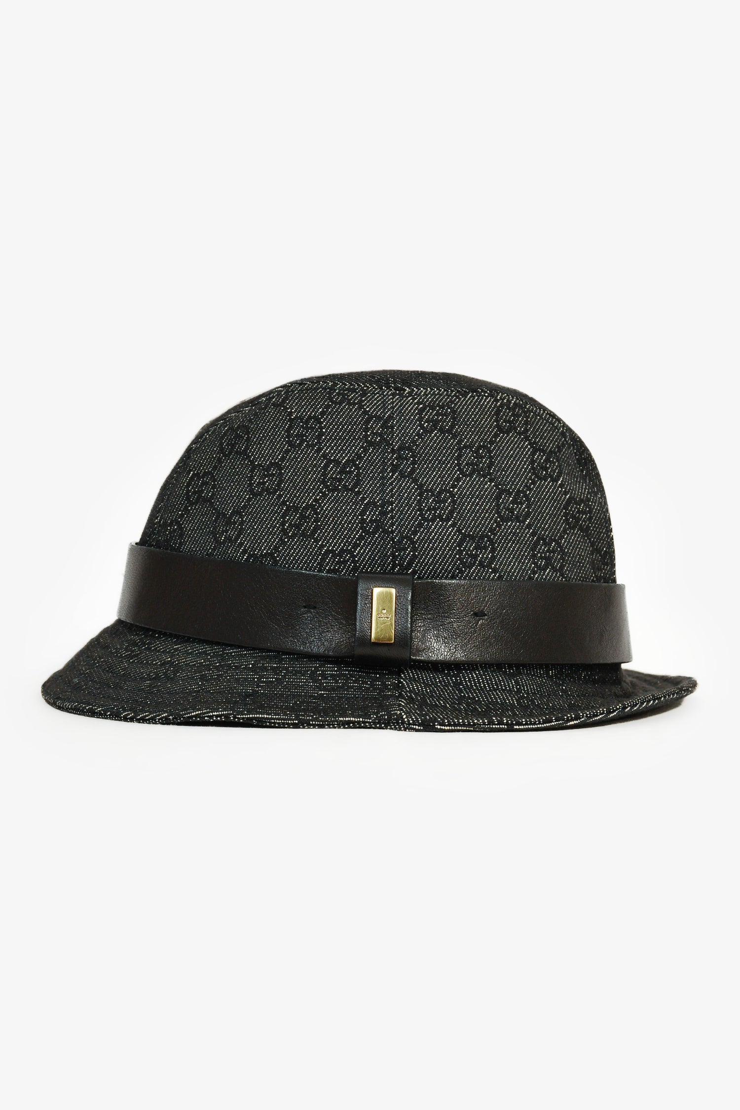 Refresh availabilityGucci Dark Grey GG Canvas Leather Trim Hat. Leather band. Gold-tone hardware. Lined interior with grosgrain trim. Tonal stitching.
