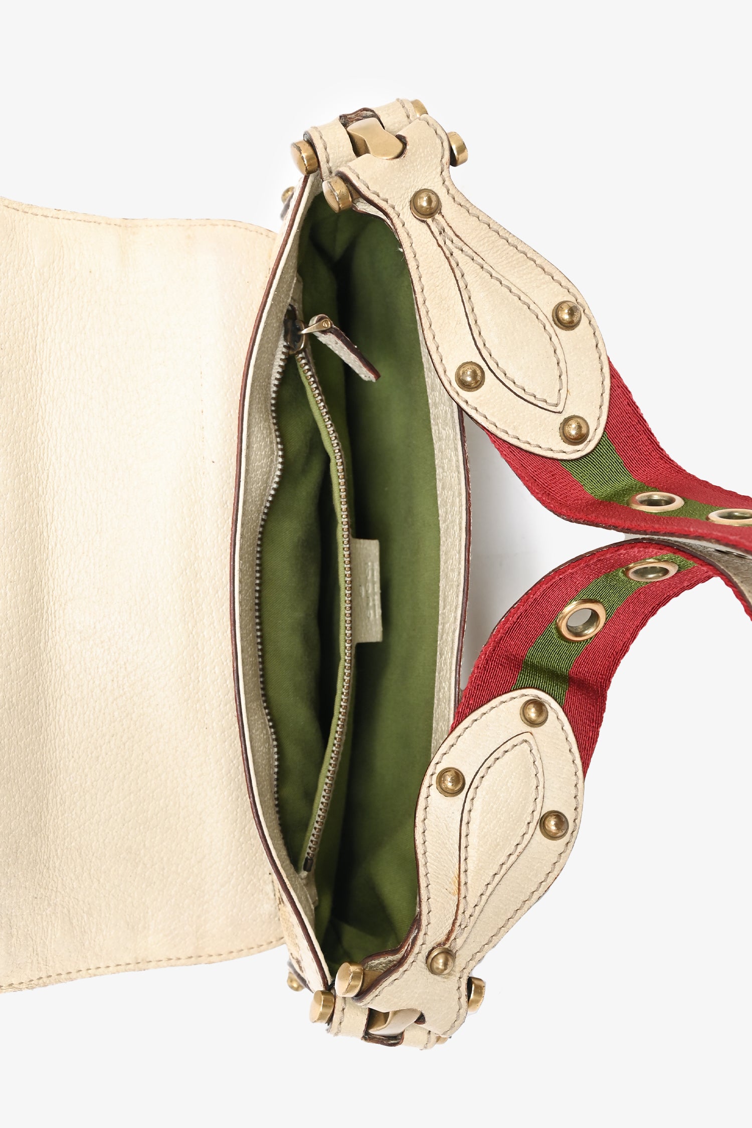 Refresh availabilityGucci GG Canvas/Cream Leather Studded Pelham Web Shoulder Bag. Gold-toned studs. Horsebit detail. Leather trim. Canvas shoulder strap. 1 large interior. 1 interior zip pocket. Green canvas interior.