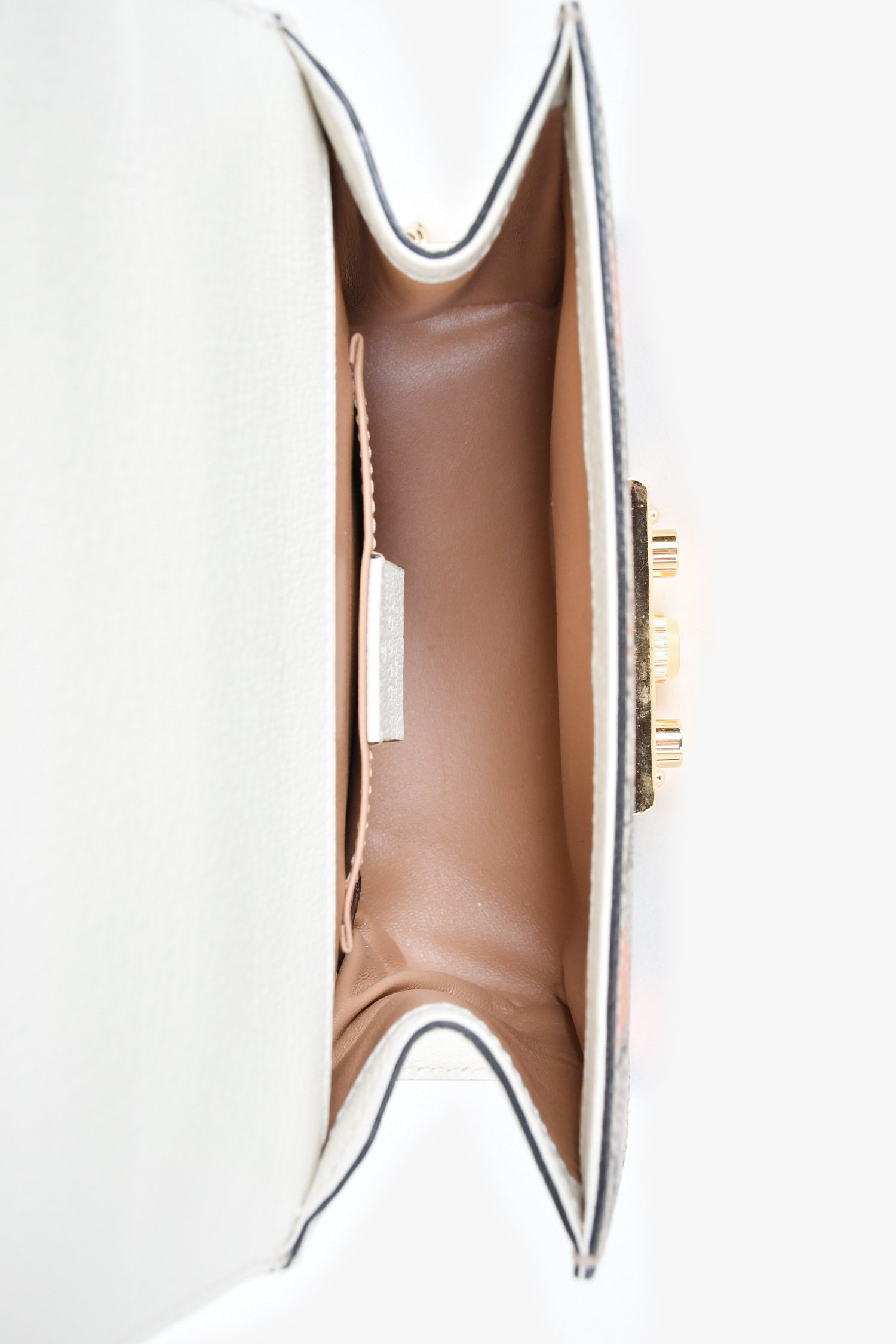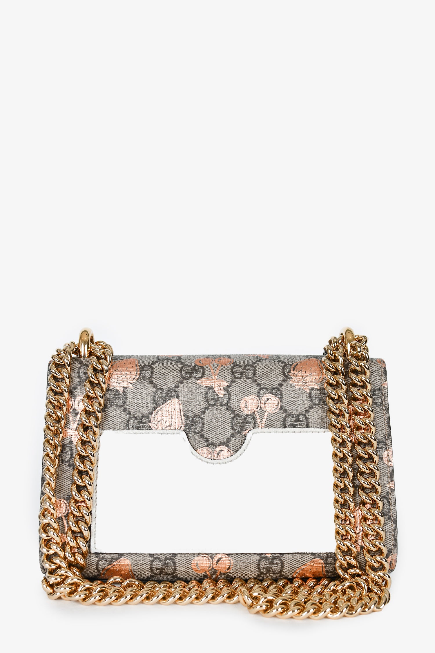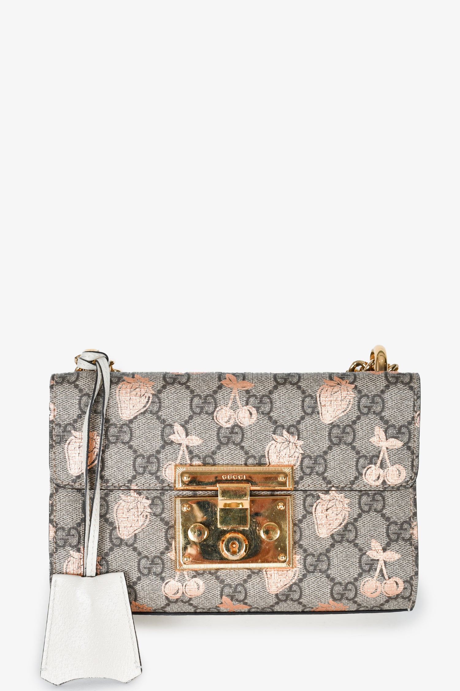 Refresh availabilityGucci GG Monogram Supreme Berry Padlock Shoulder Bag. Front fold-over flap with pinch-lock closure. Outer rear slip pocket. Brown leather interior. Single interior wall slip pocket. Slide-around chain. Gold-tone hardware. Detachable clochette with 2 keys.