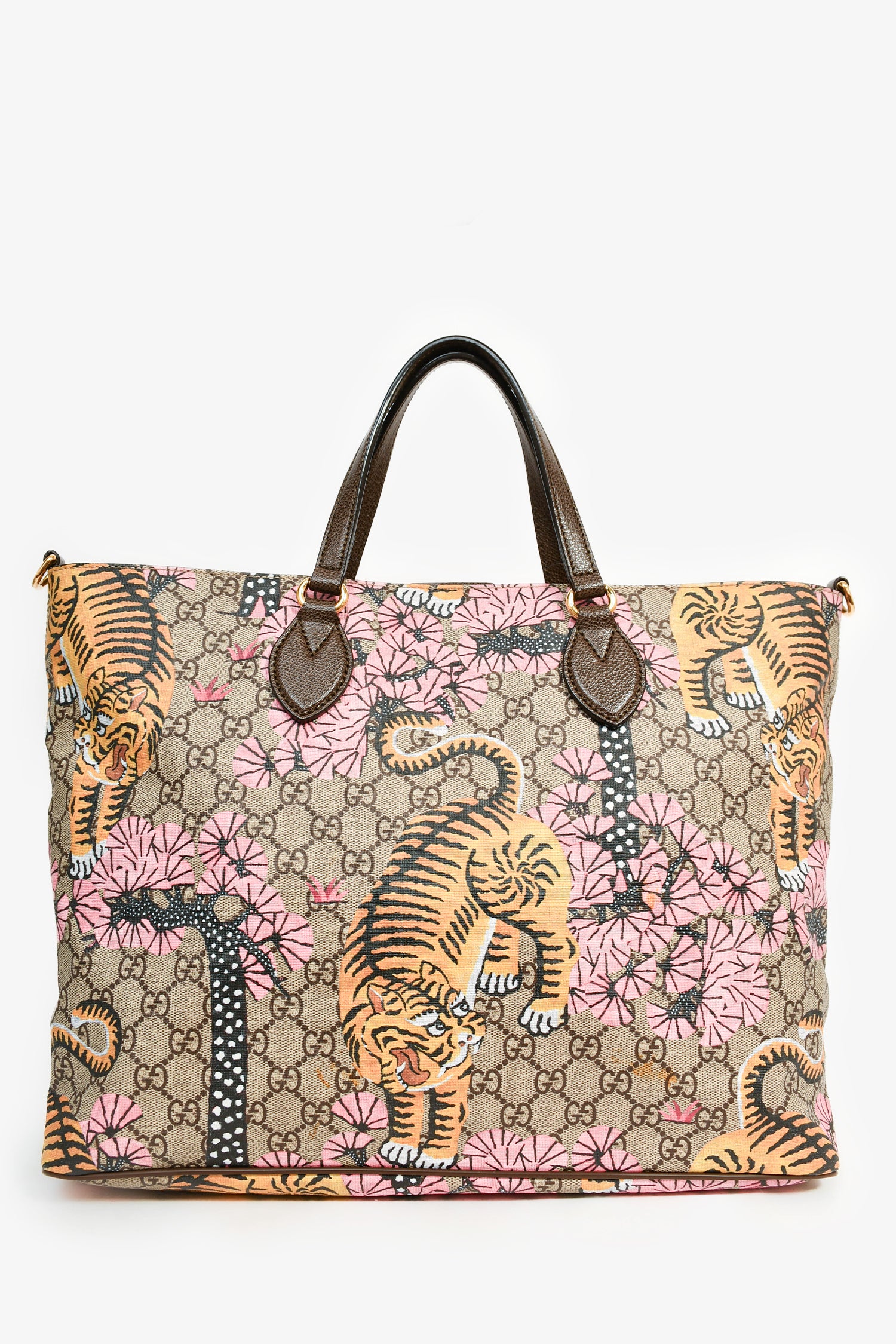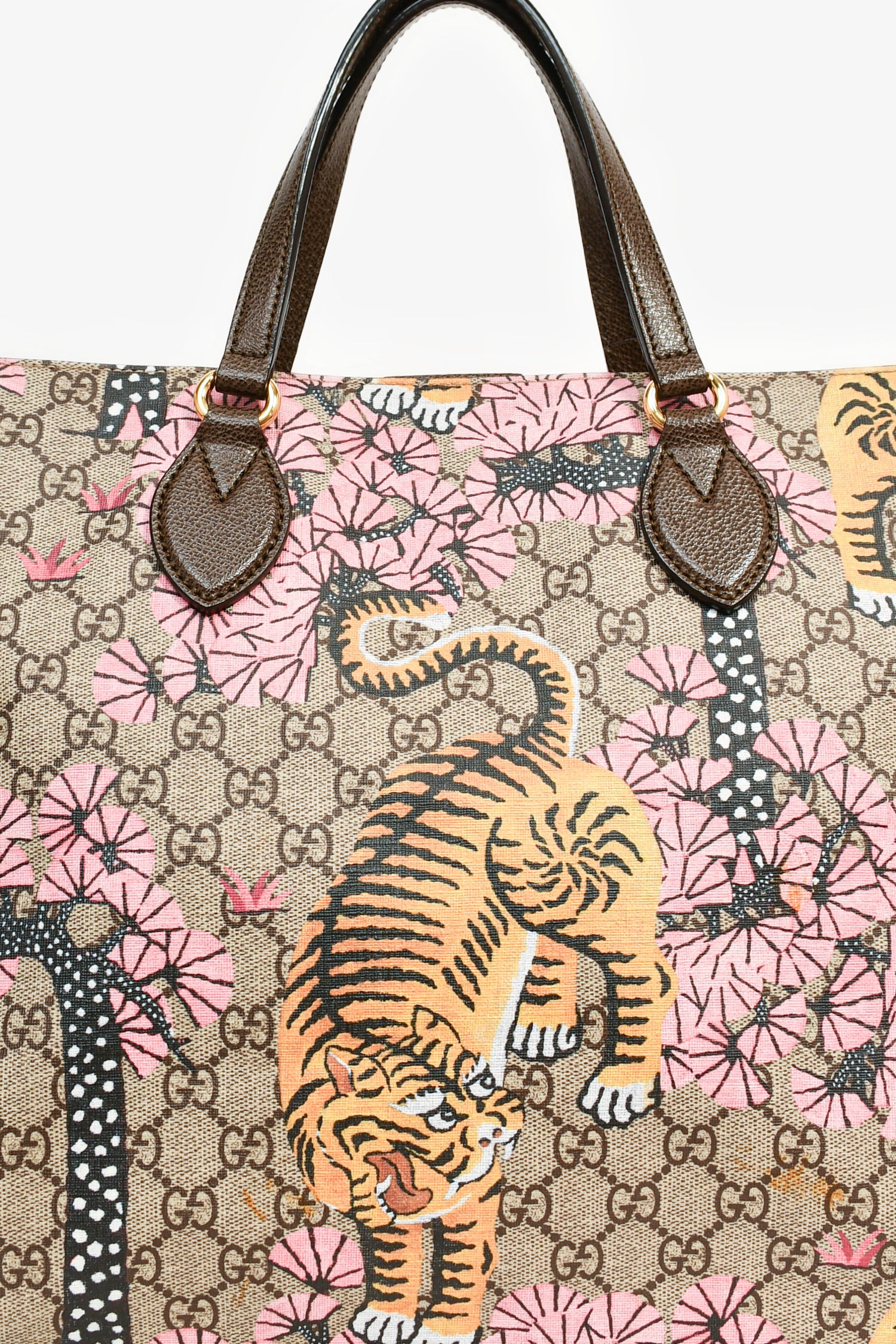 Refresh availabilityGucci GG Supreme Bengal Tiger Coated Canvas Tote Bag with Strap. Dual handles. Top interior magnetic button closure. Peach suede interior lining. Three interior wall pockets; two slip and one with zip closure. Gold-tone hardware. Removable and adjustable strap.