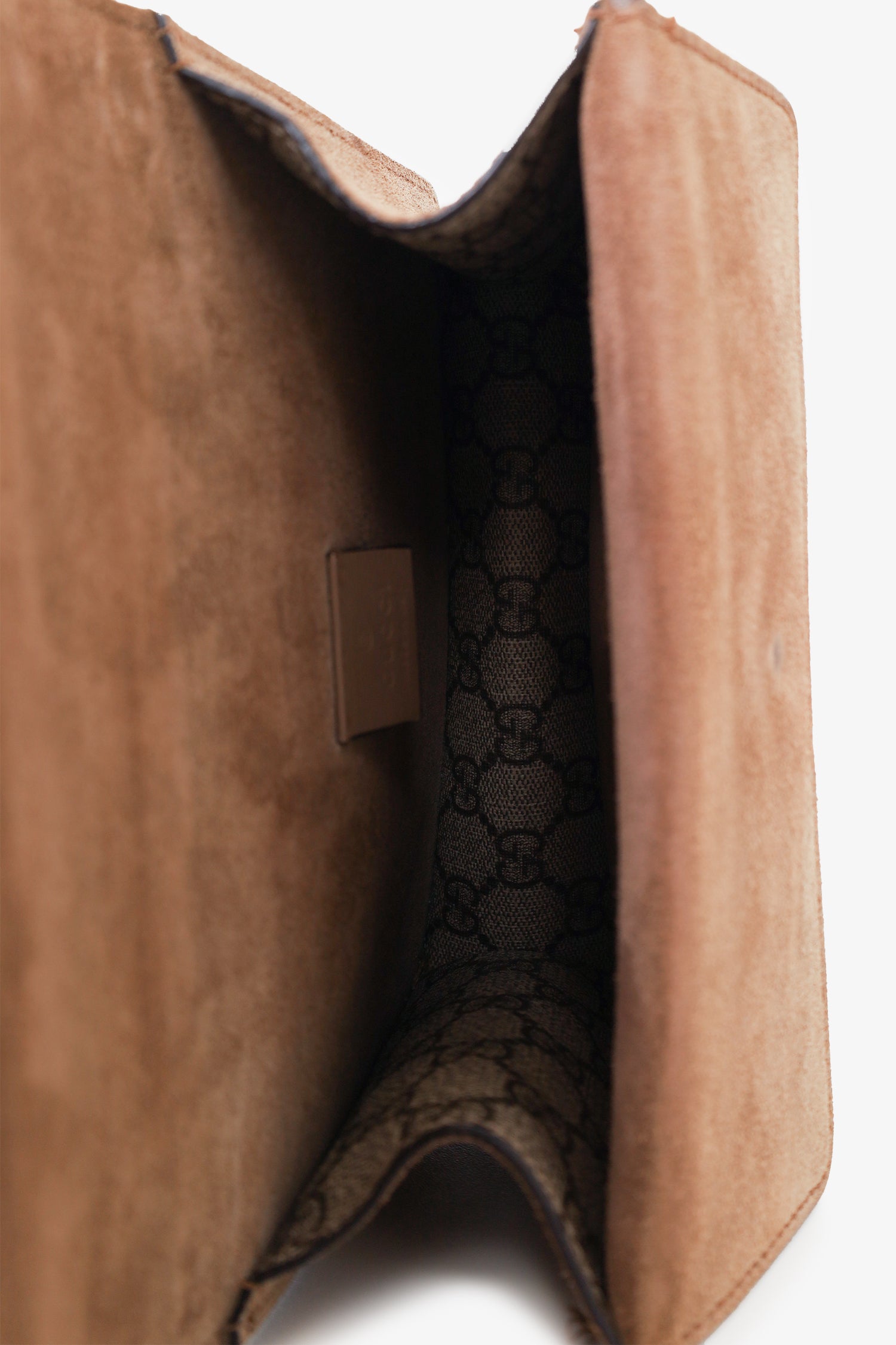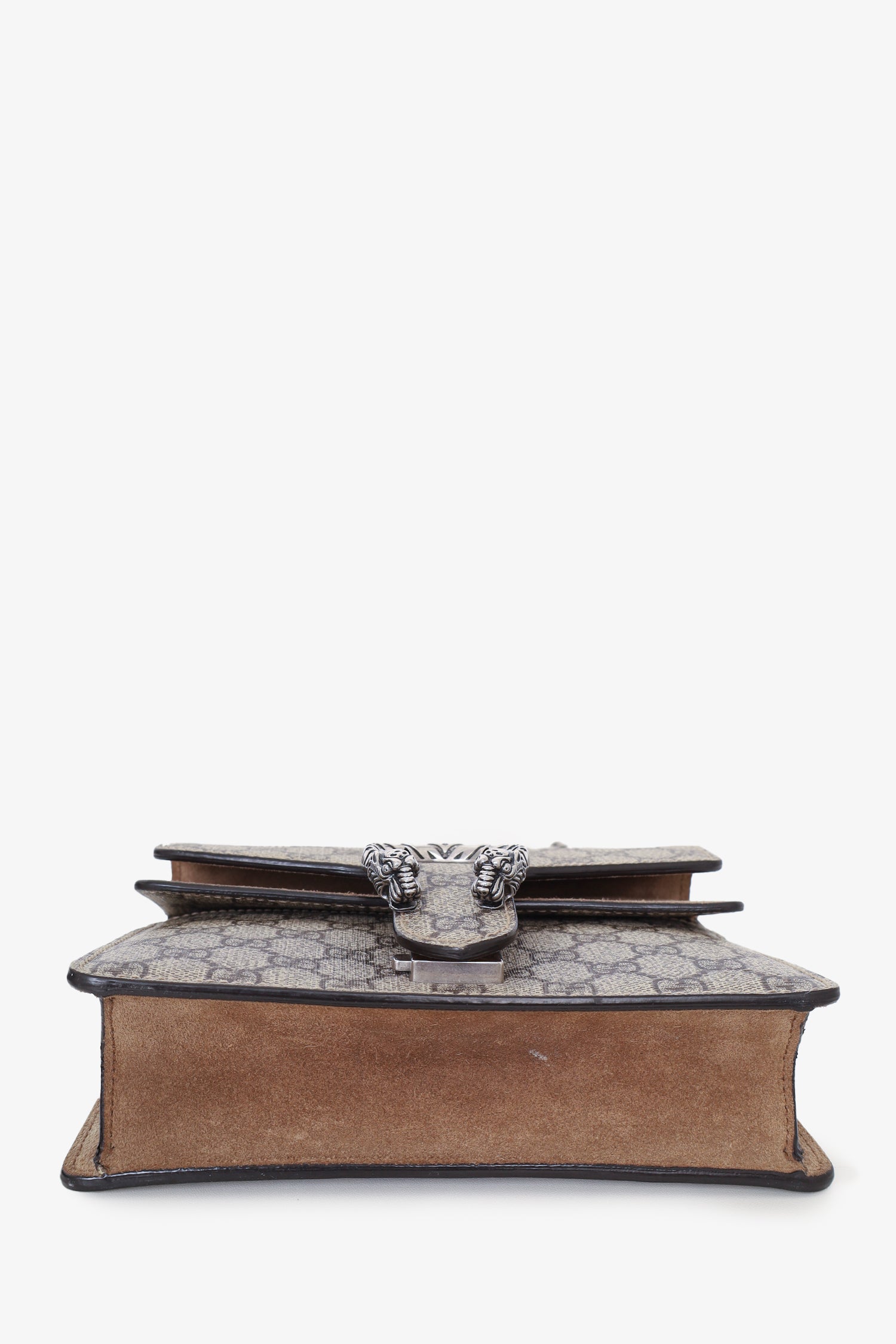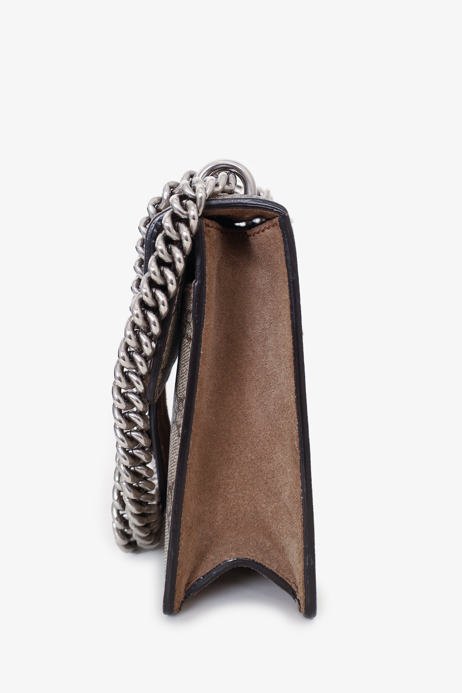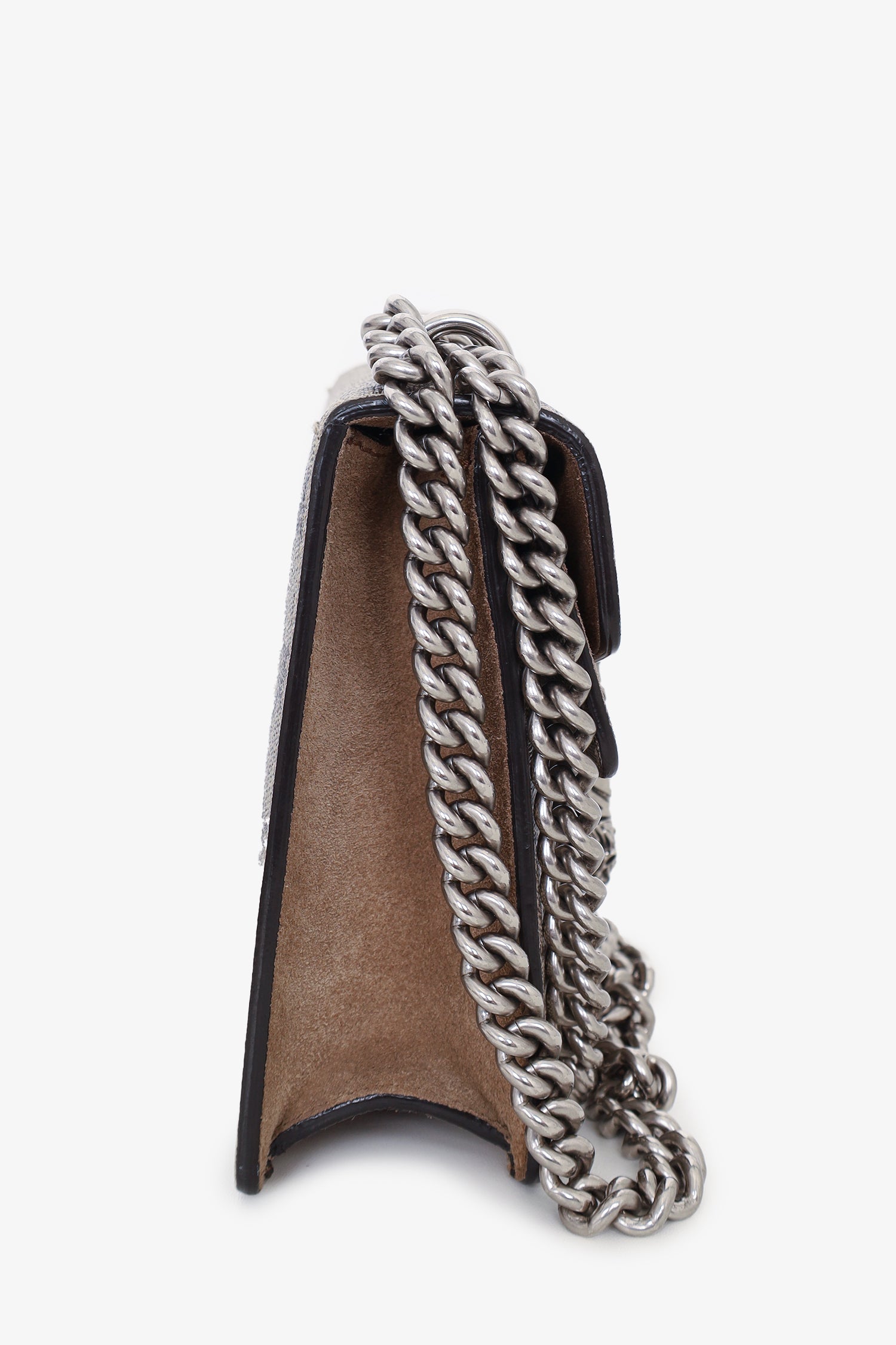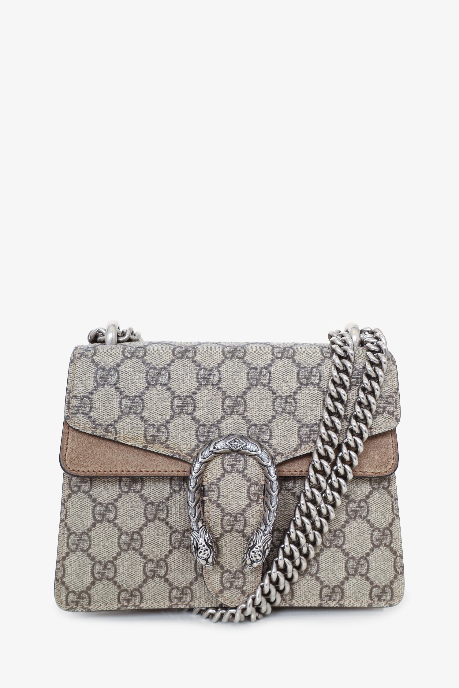 Gucci GG Supreme/Brown Suede Mini 'Dionysus' Bag. Front fold-over flap with push-lock closure. 1 exterior slip pocket. Slide-around chain. Silver-tone hardware. Tonal stitching.