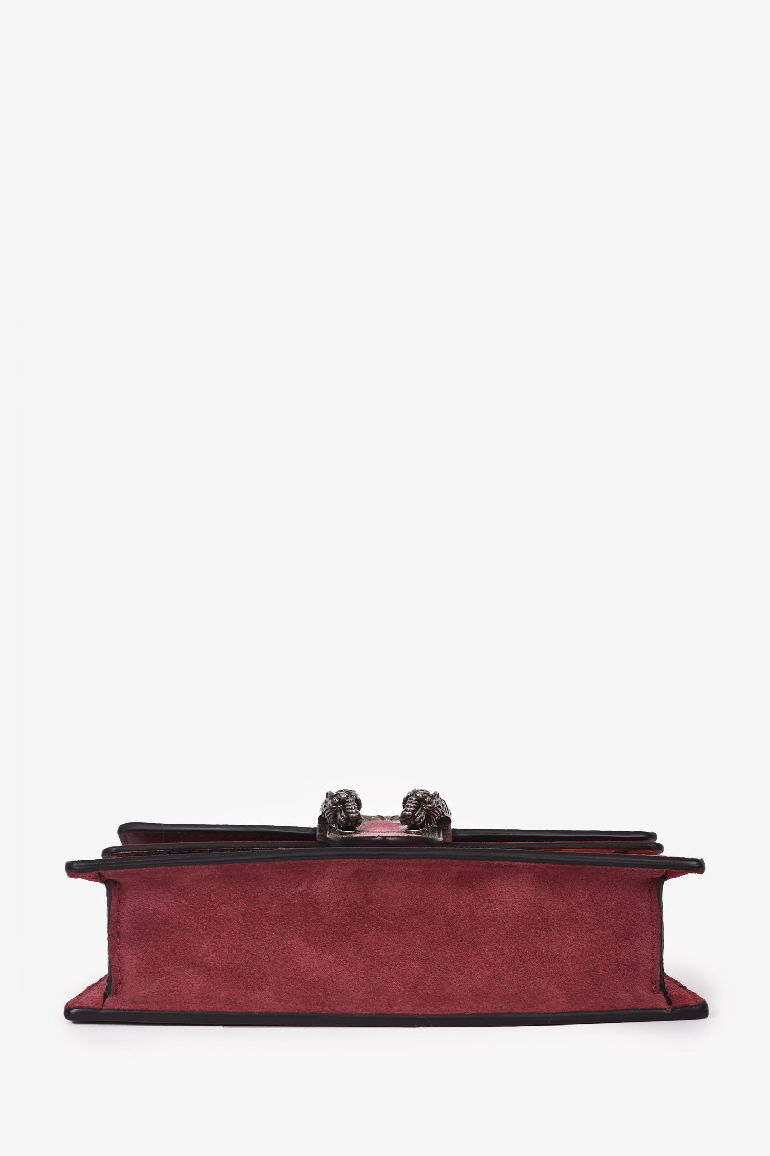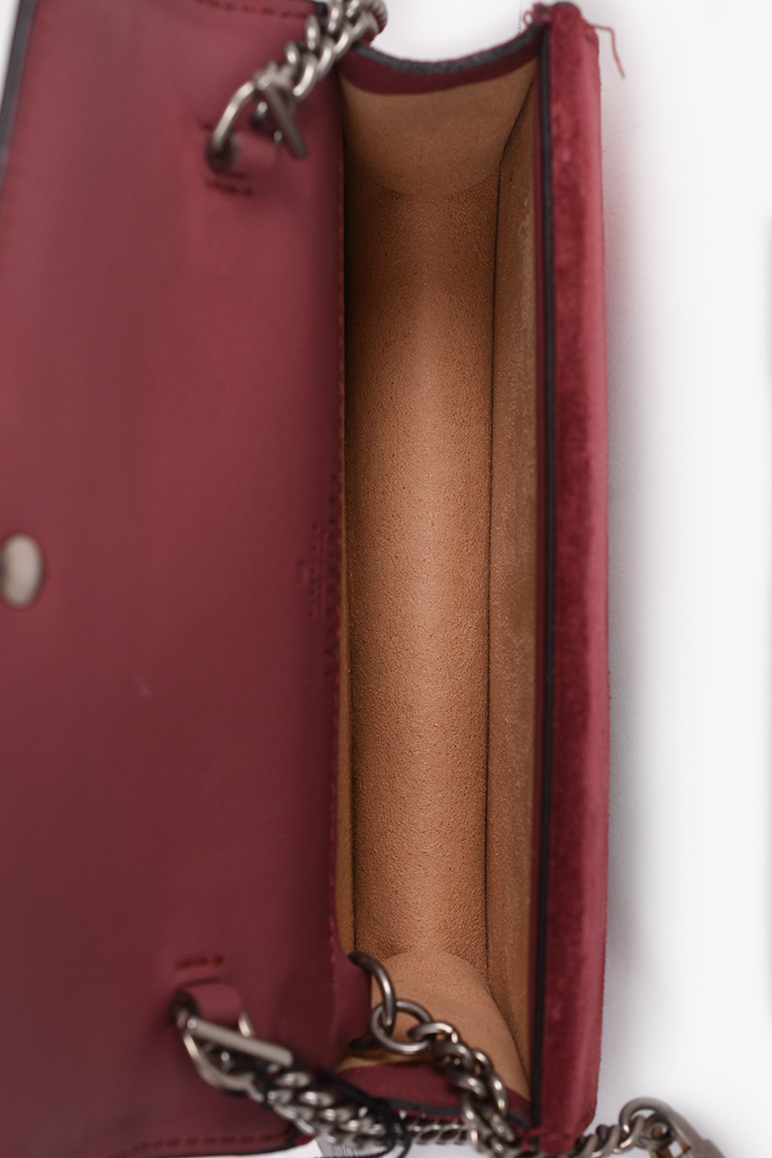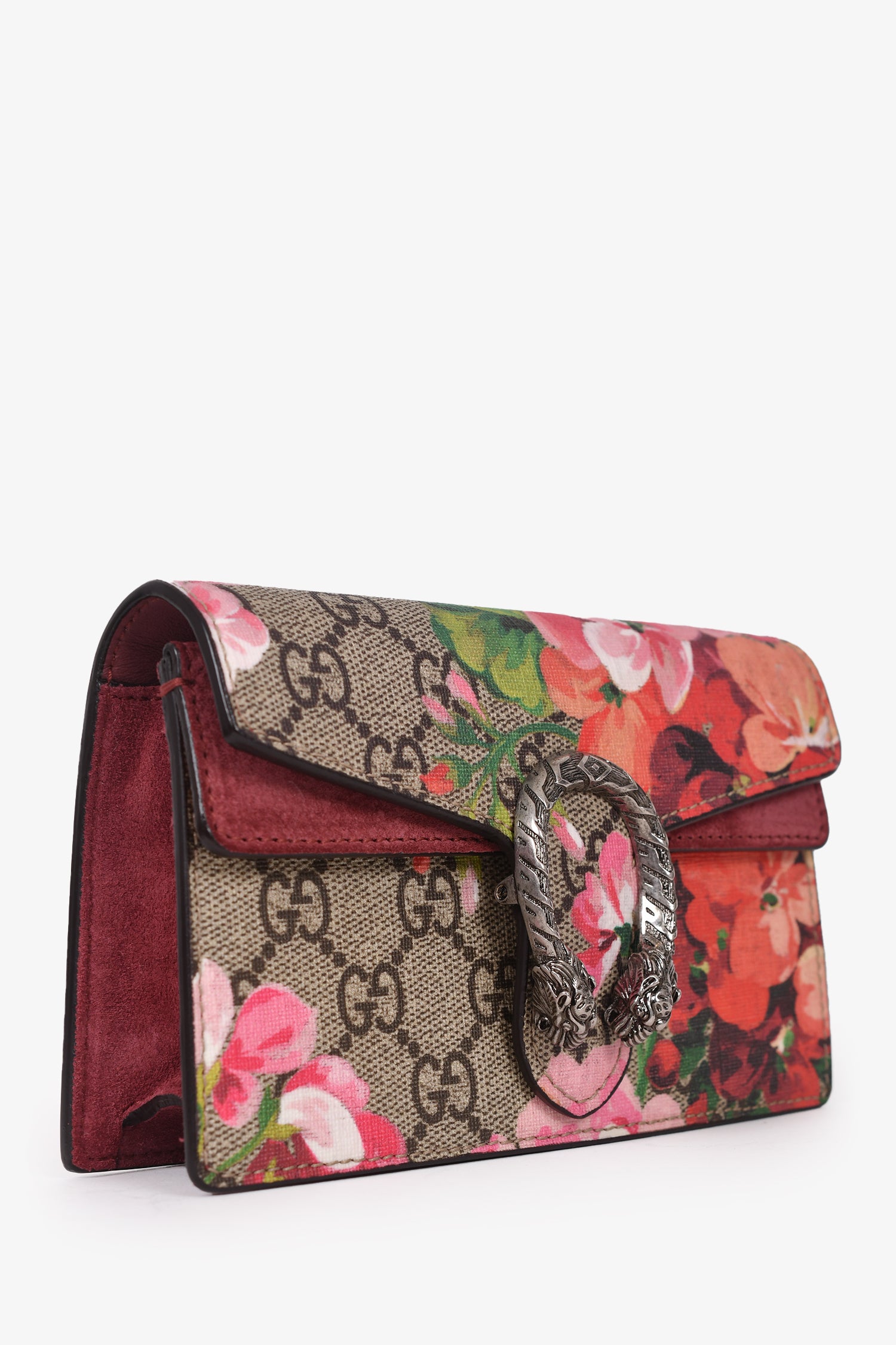 Refresh availabilityGucci GG Supreme Canvas/Leather Super Mini Blooms Dionysus Bag. Front fold-over flap with snap-button closure. Peach textile interior lining. Burgundy suede trims. Open interior. Silver-tone hardware. Tonal stitching.