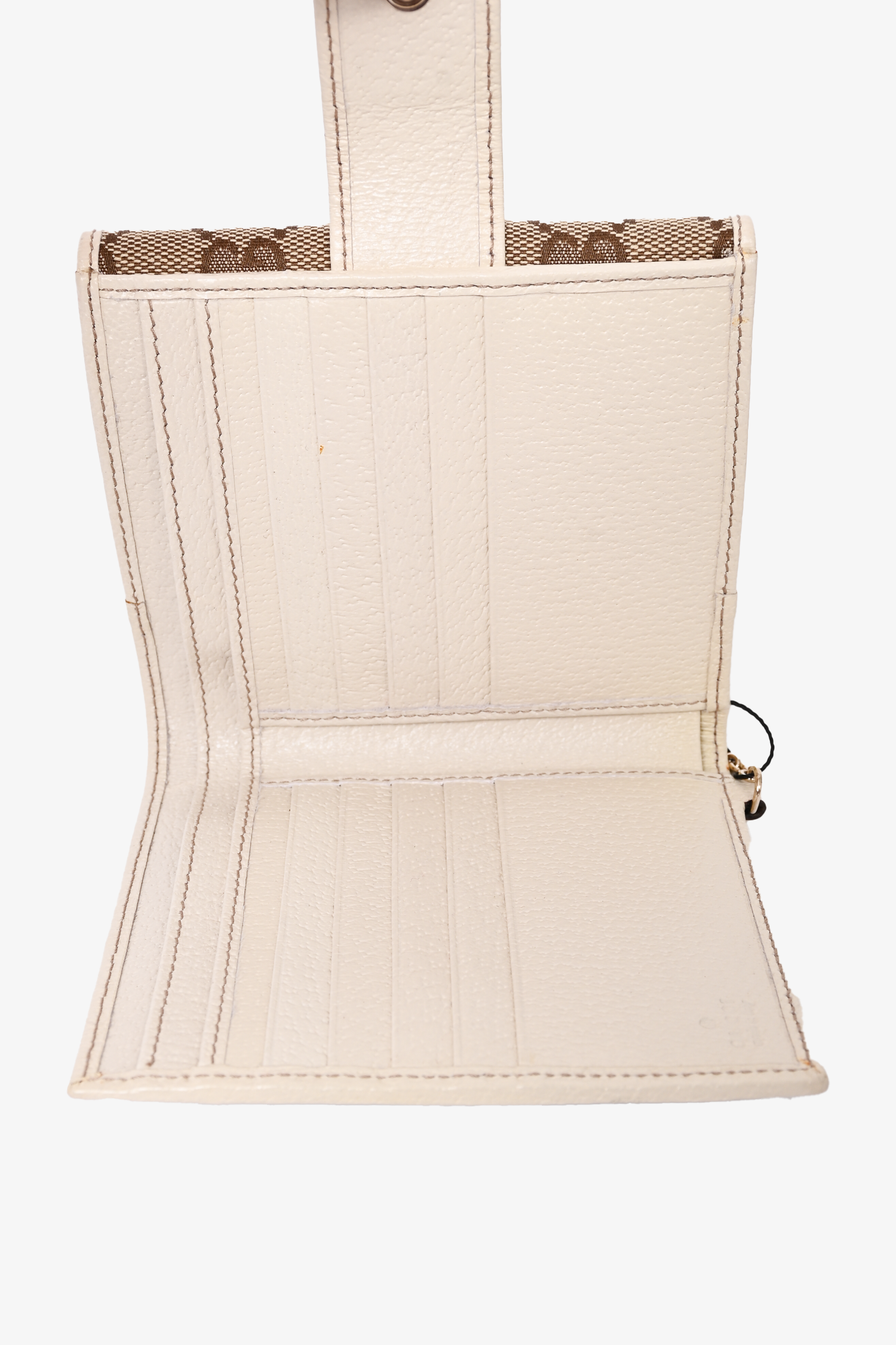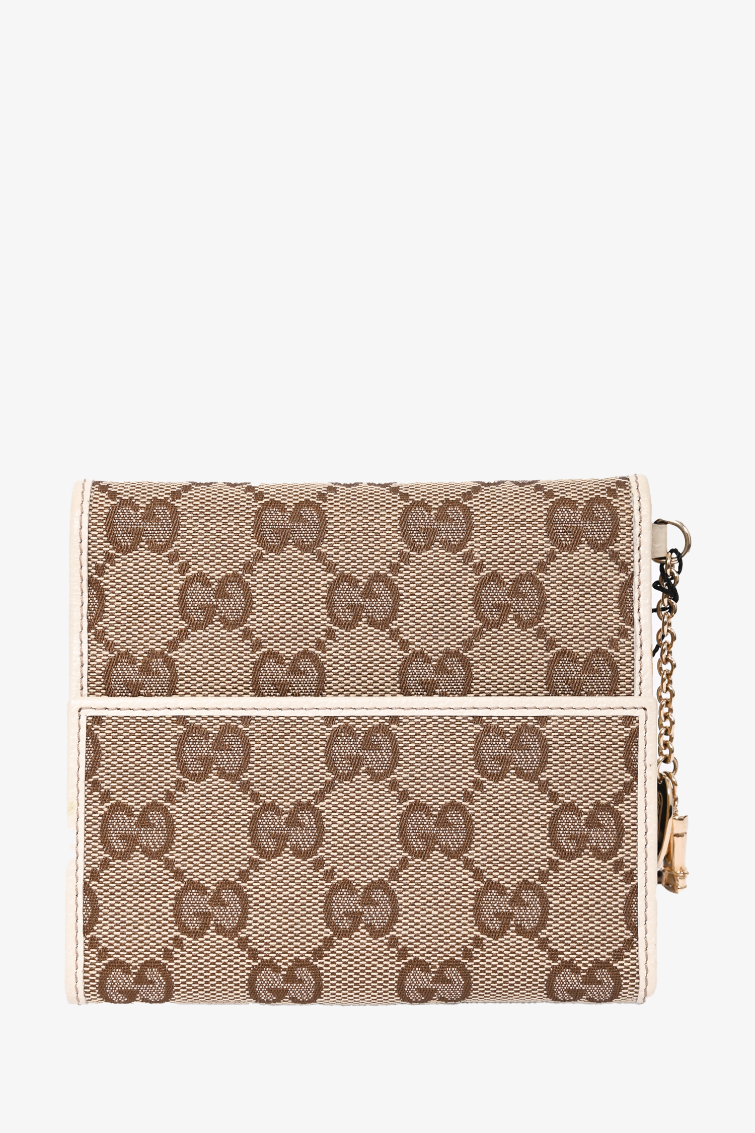 Refresh availabilityGucci GG Supreme Canvas Wallet with Charms. Front fold-over flaps with snap-button closures. Black leather interior lining. 10 card slots. 2 billfold compartments. Outer rear open compartment. Gold-tone hardware. Tonal stitching.