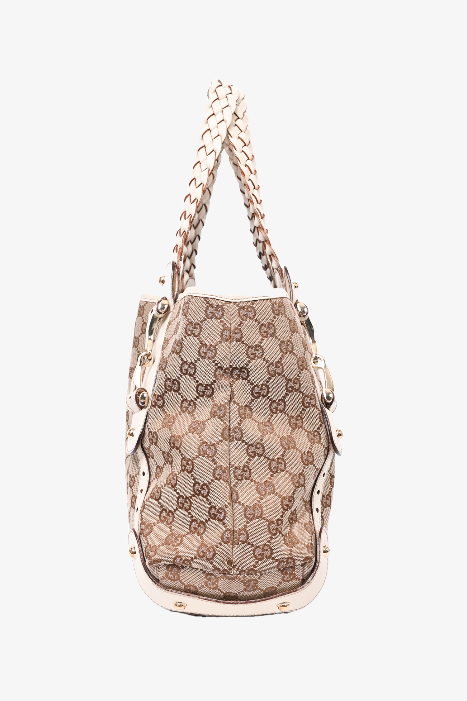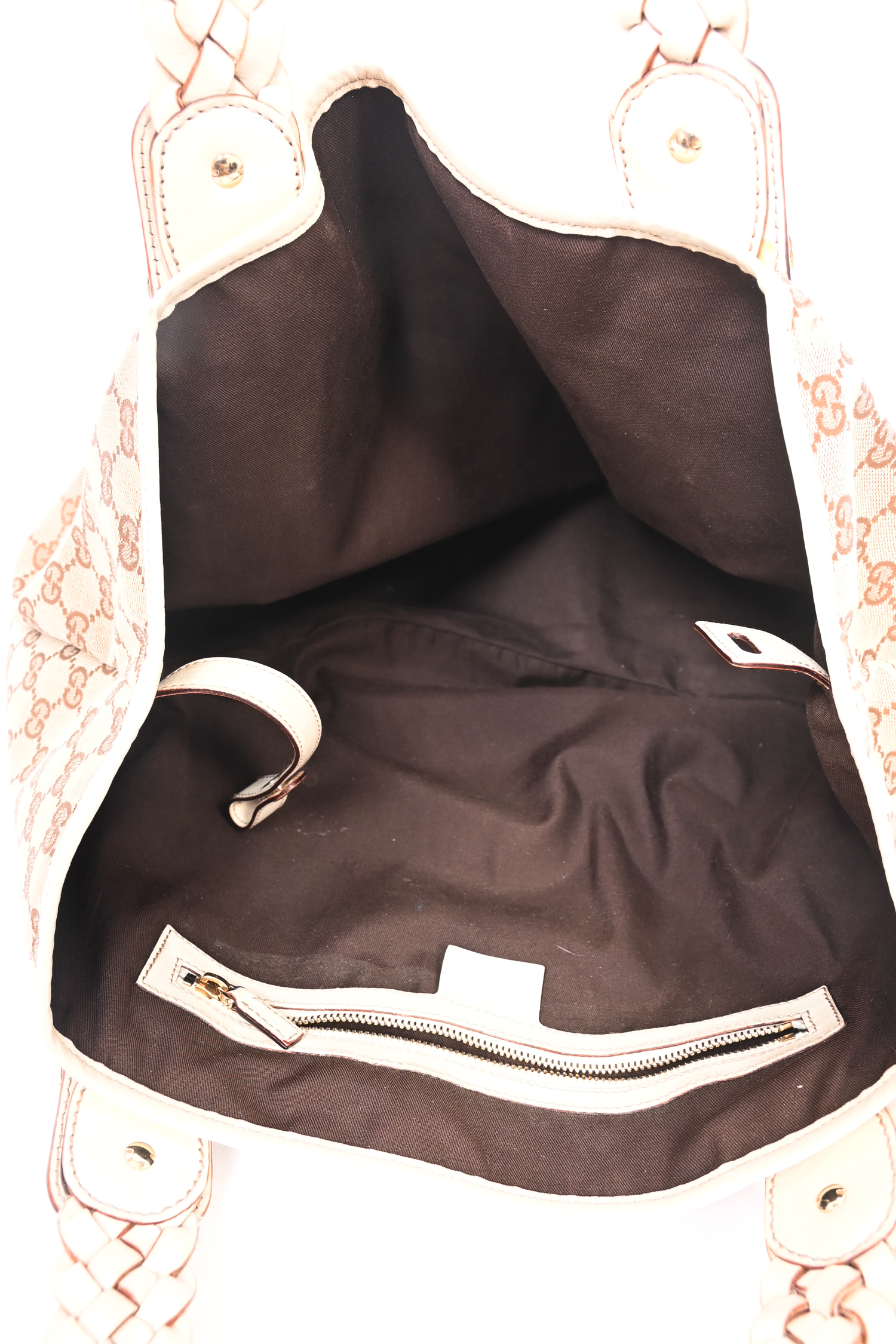 Gucci GG Supreme Canvas/White Leather Pelham Tote. Interior strap with snap-button closure. Dark brown textile interior lining. Single interior wall zip pocket. Gold-tone hardware. Tonal stitching.