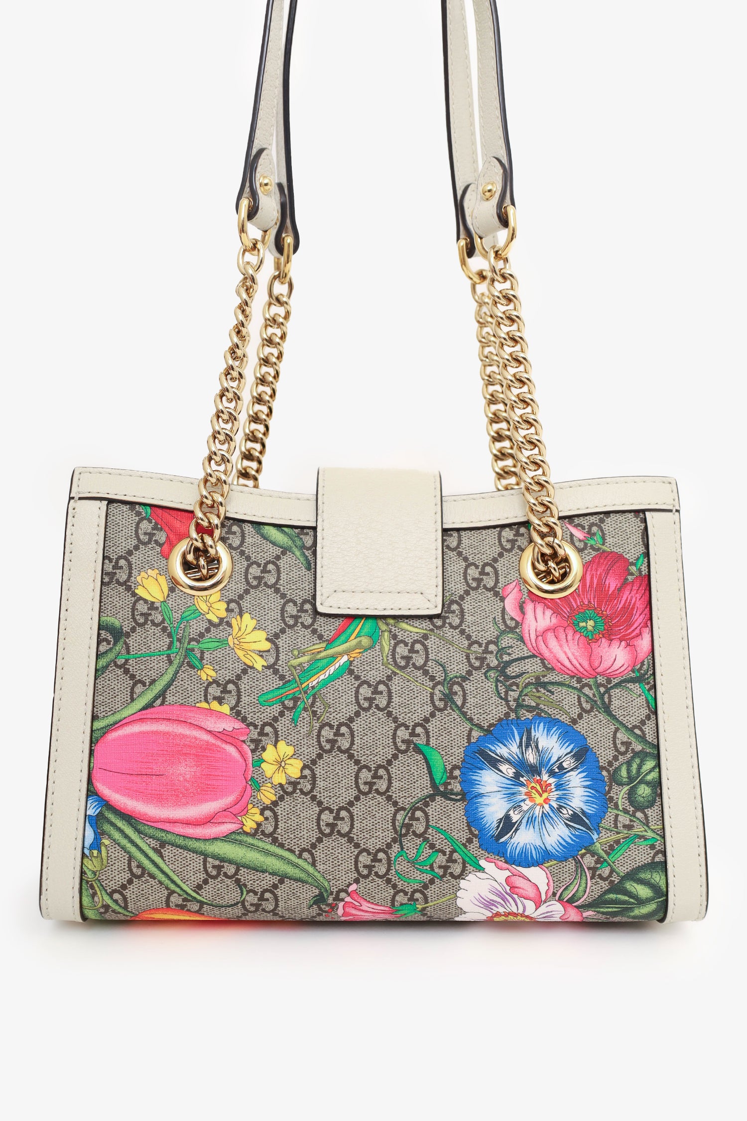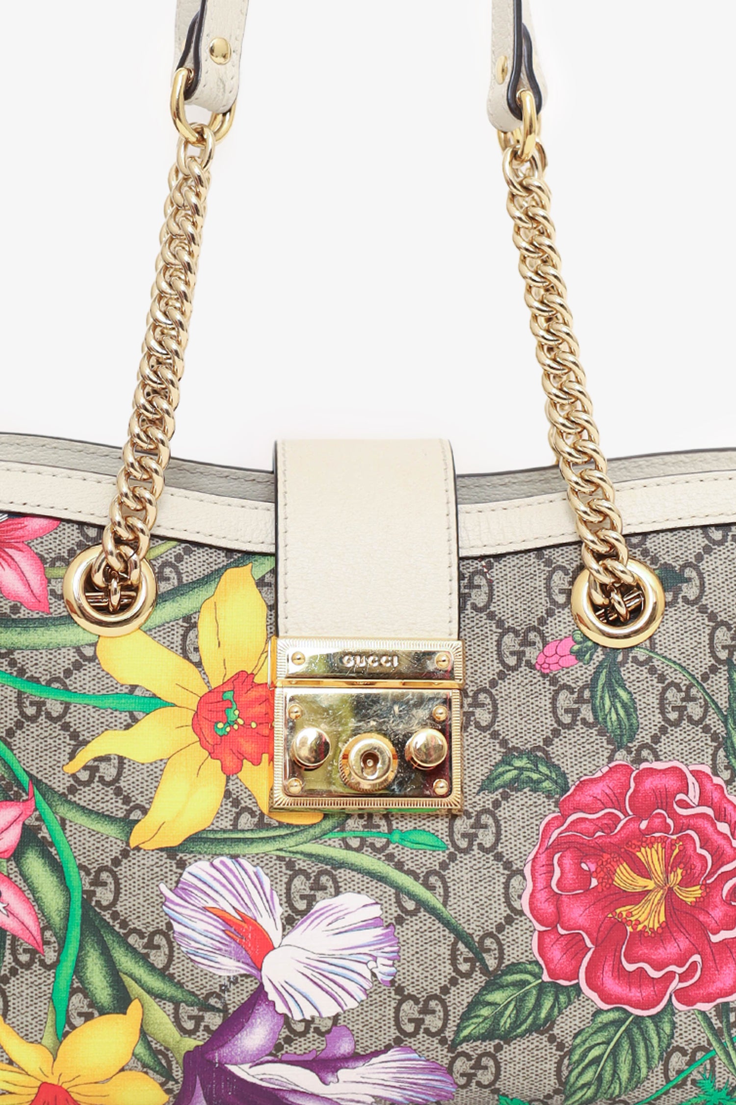 Refresh availabilityGucci GG Supreme Flora Small Padlock Shoulder. Front strap push-lock closure. Chain and leather shoulder strap. Open suede interior with 2 wall slip pockets. Gold-tone hardware. Tonal stitching.