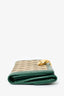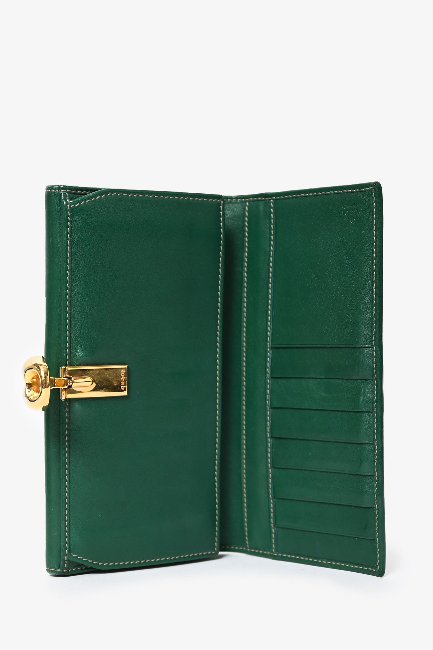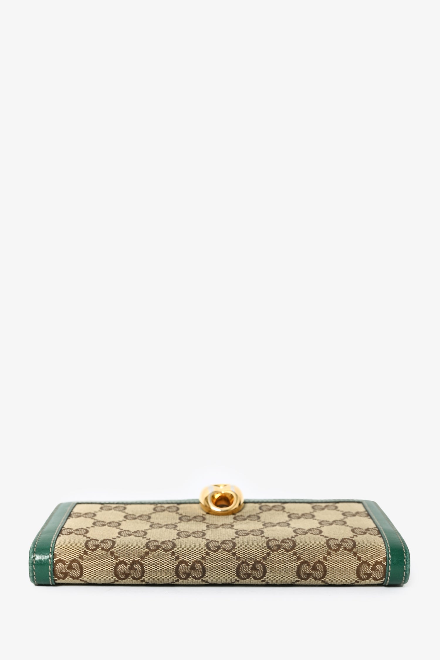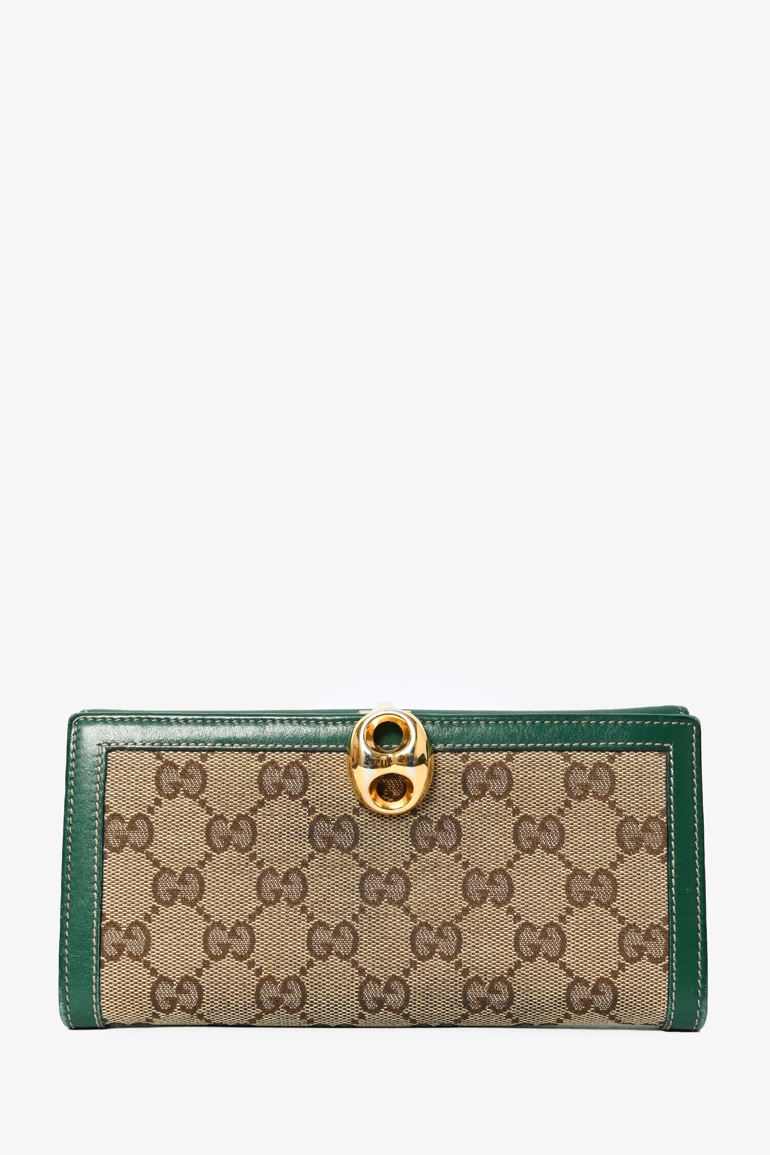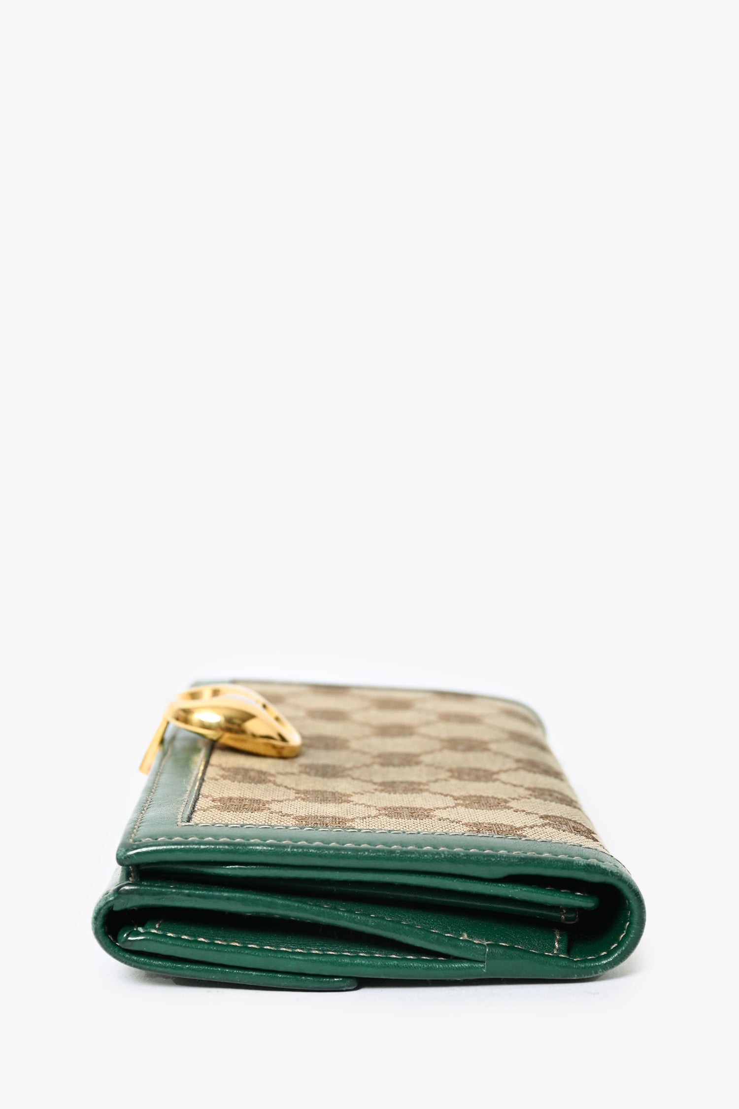 Refresh availabilityGucci GG Supreme/Green Trim Wallet. Contrast green trim and stitching. Monogram canvas. Dual interior pockets. 7 card holder slots. 2 slip compartments. Gold-toned closure. Interior compartment with snap closure at back.