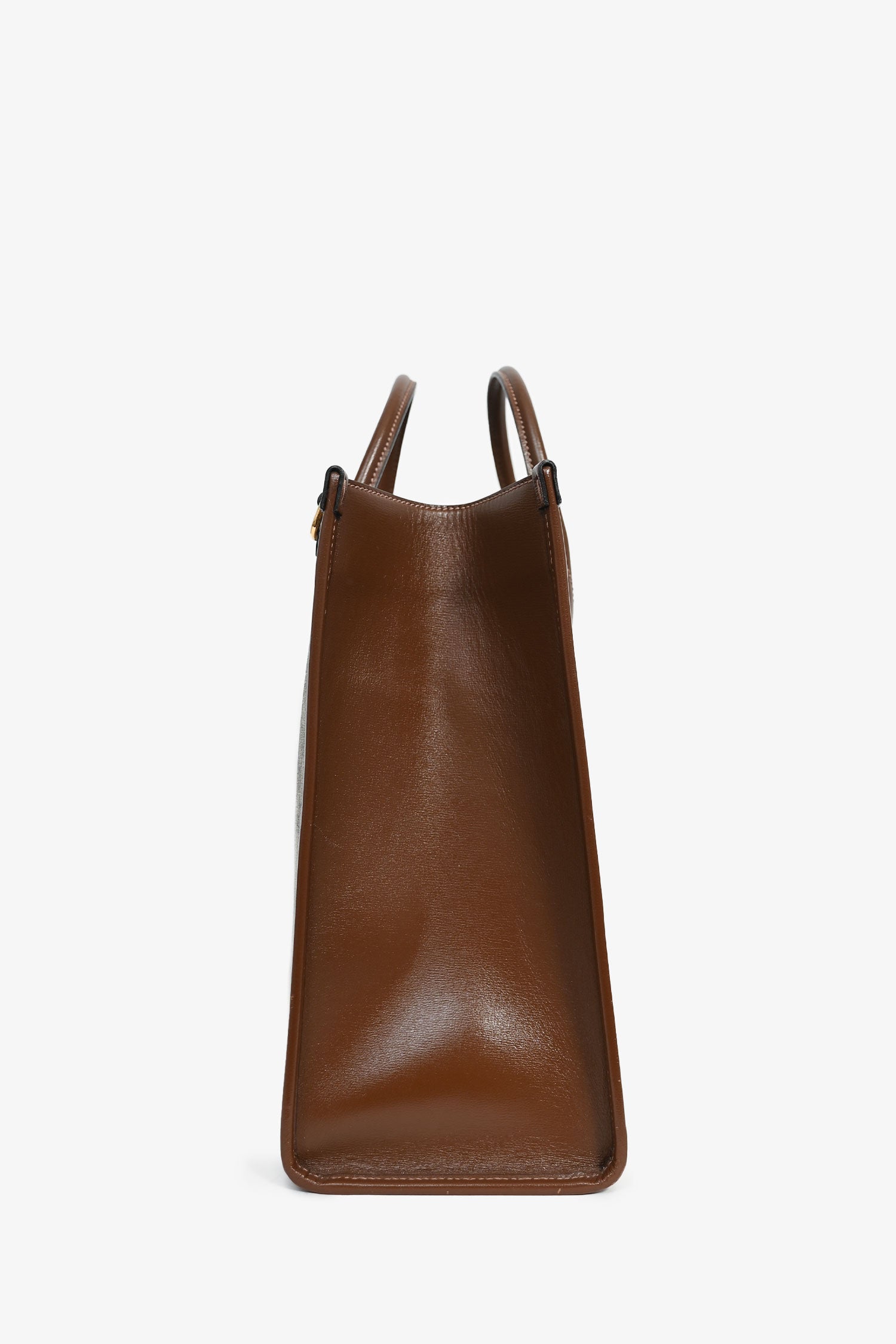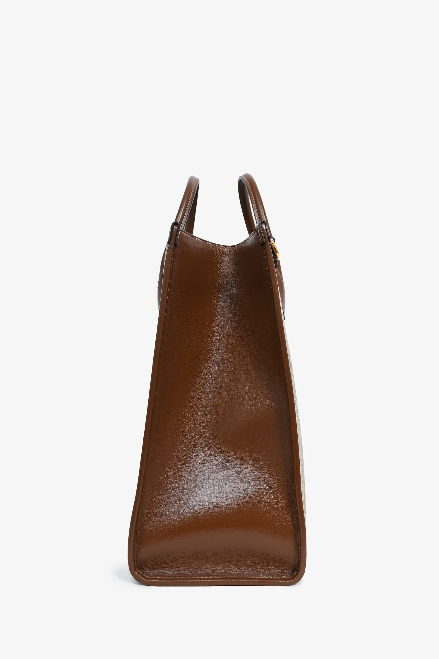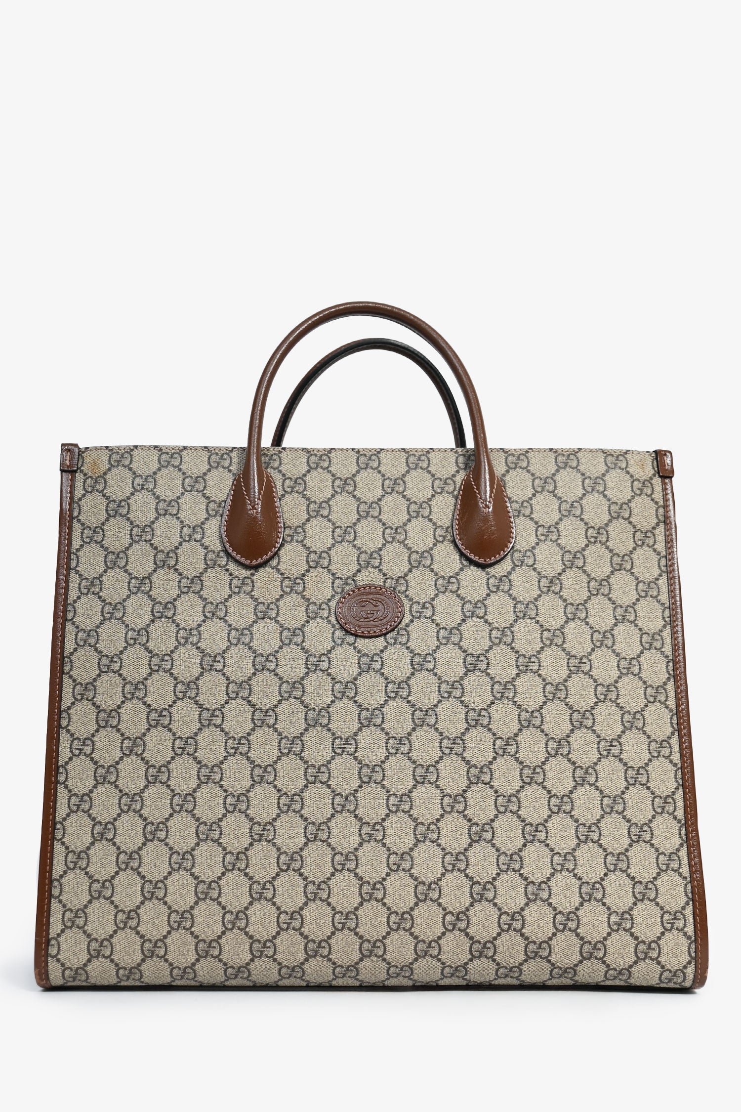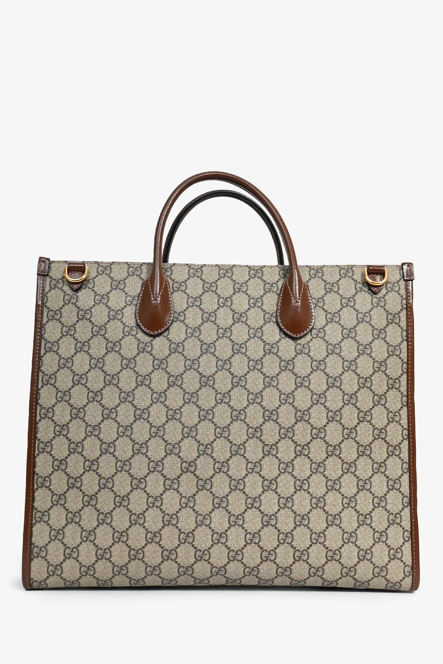Refresh availabilityGucci GG Supreme Leather Trim Top Handle Structured Tote. Rolled top handles. Gold-tone hardware. Lined canvas interior with a zipped interior. Comes with a webbed strap.