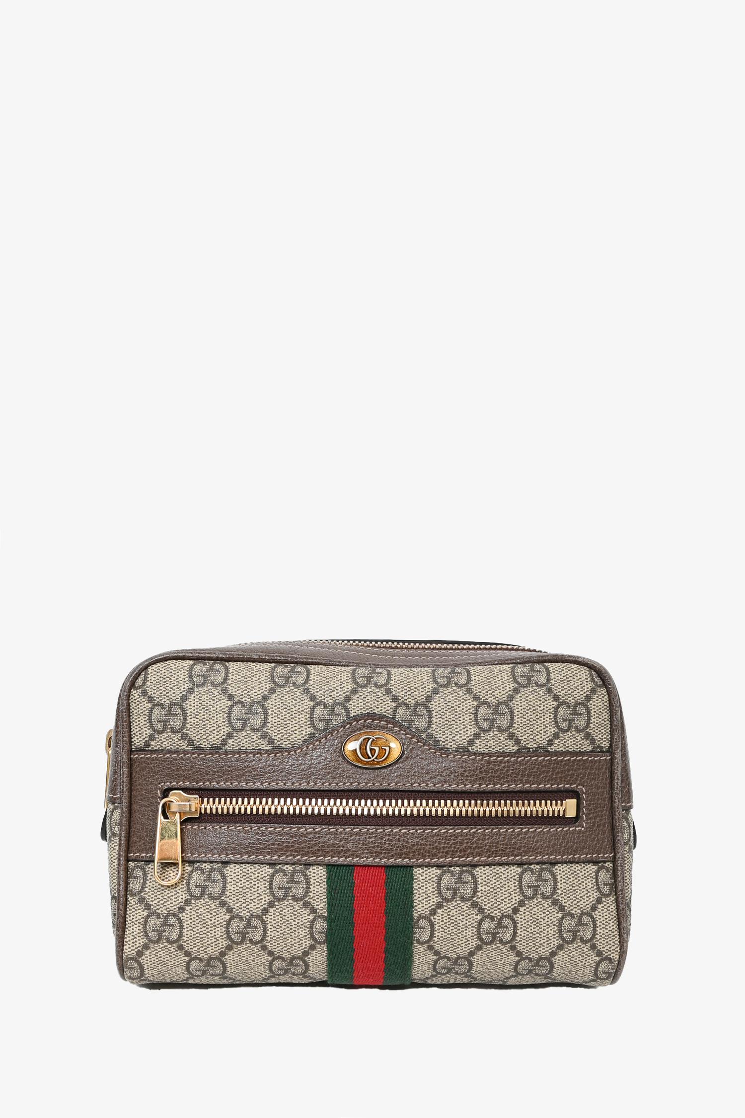 Refresh availabilityGucci GG Supreme Monogram Web Ophidia Belt Bag. Top zip closure. Interior suede lining. 1 interior slip pocket. 1 exterior zip pocket. Adjustable belt buckle. Contrast stitching.