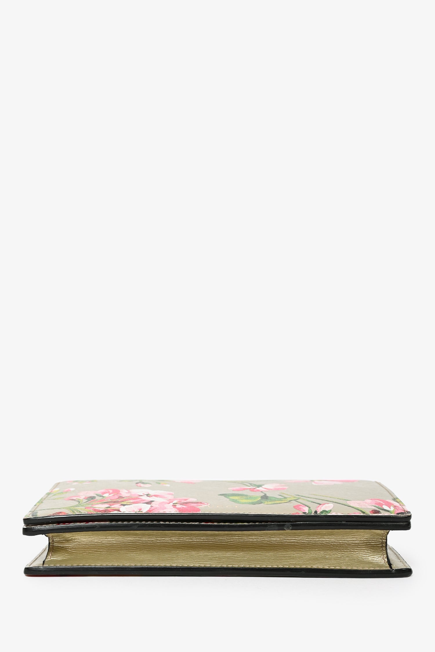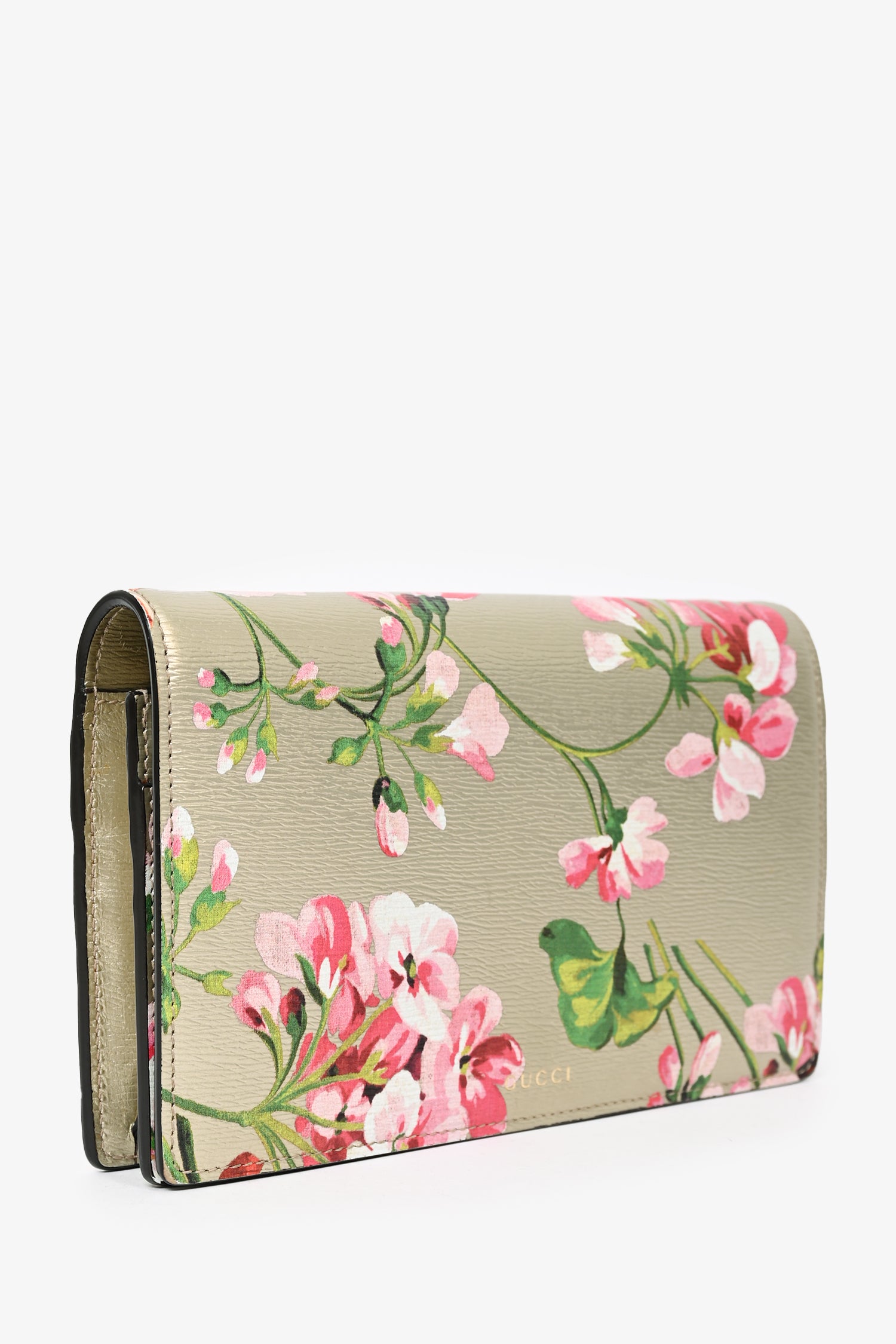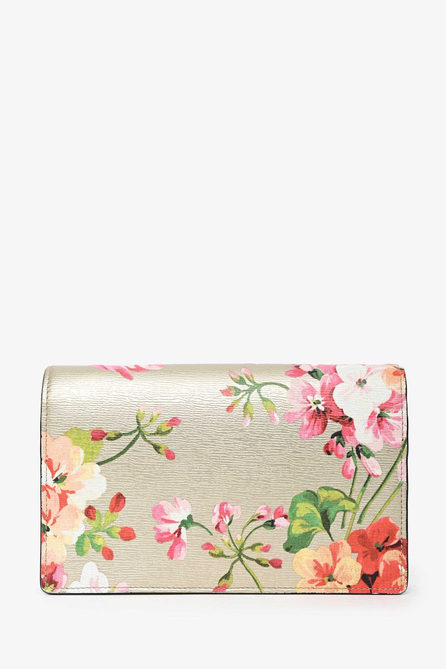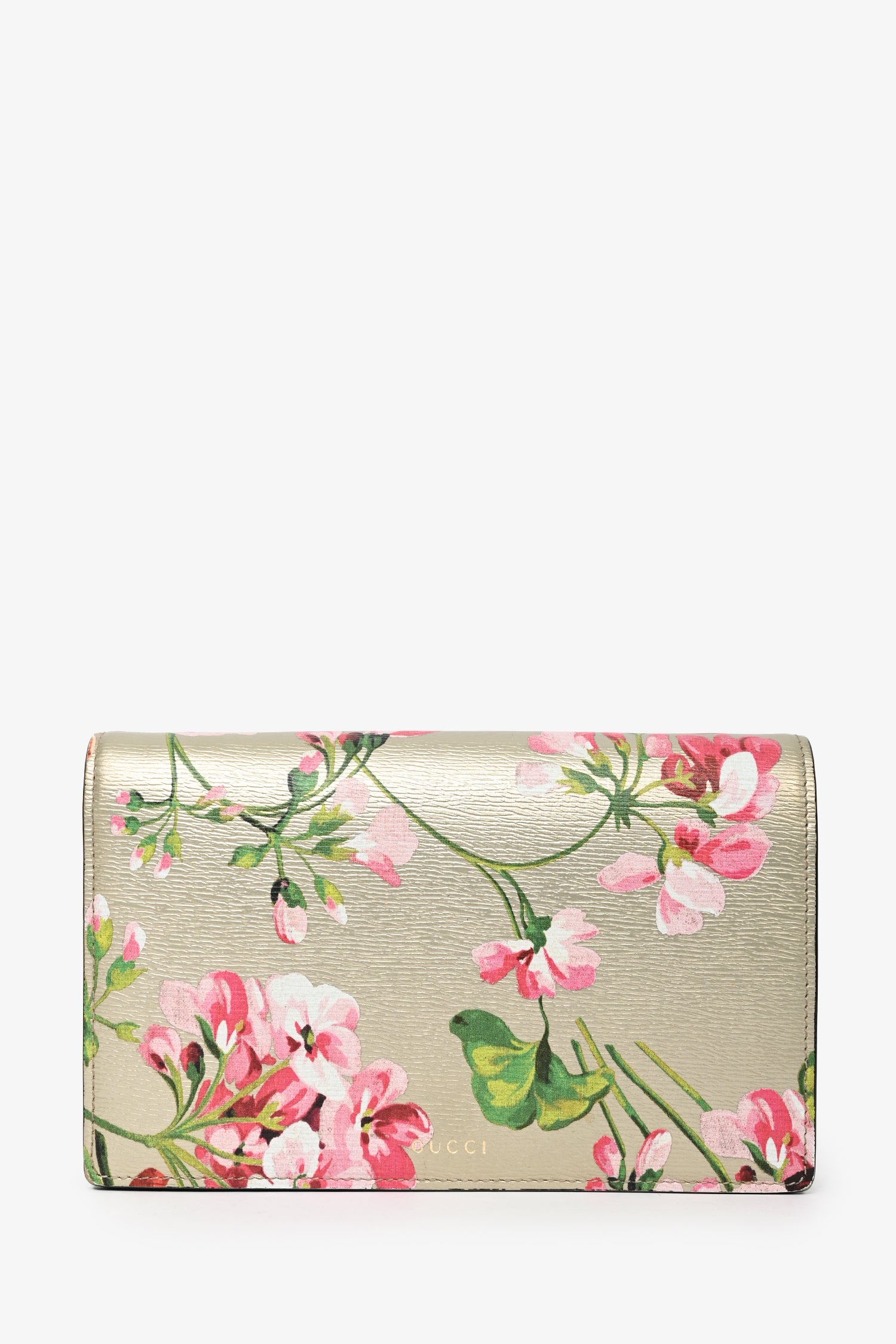 Refresh availabilityGucci Gold Leather Blooms Wallet On Chain. Tonal stitching. Leather trim. Gold toned-hardware. Leather and gold hardware shoulder strap. Snap closure. Fold-over flap. Interior zippered pouch. 8 card holder pouches.