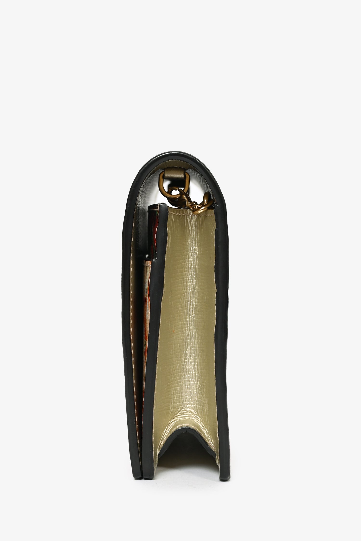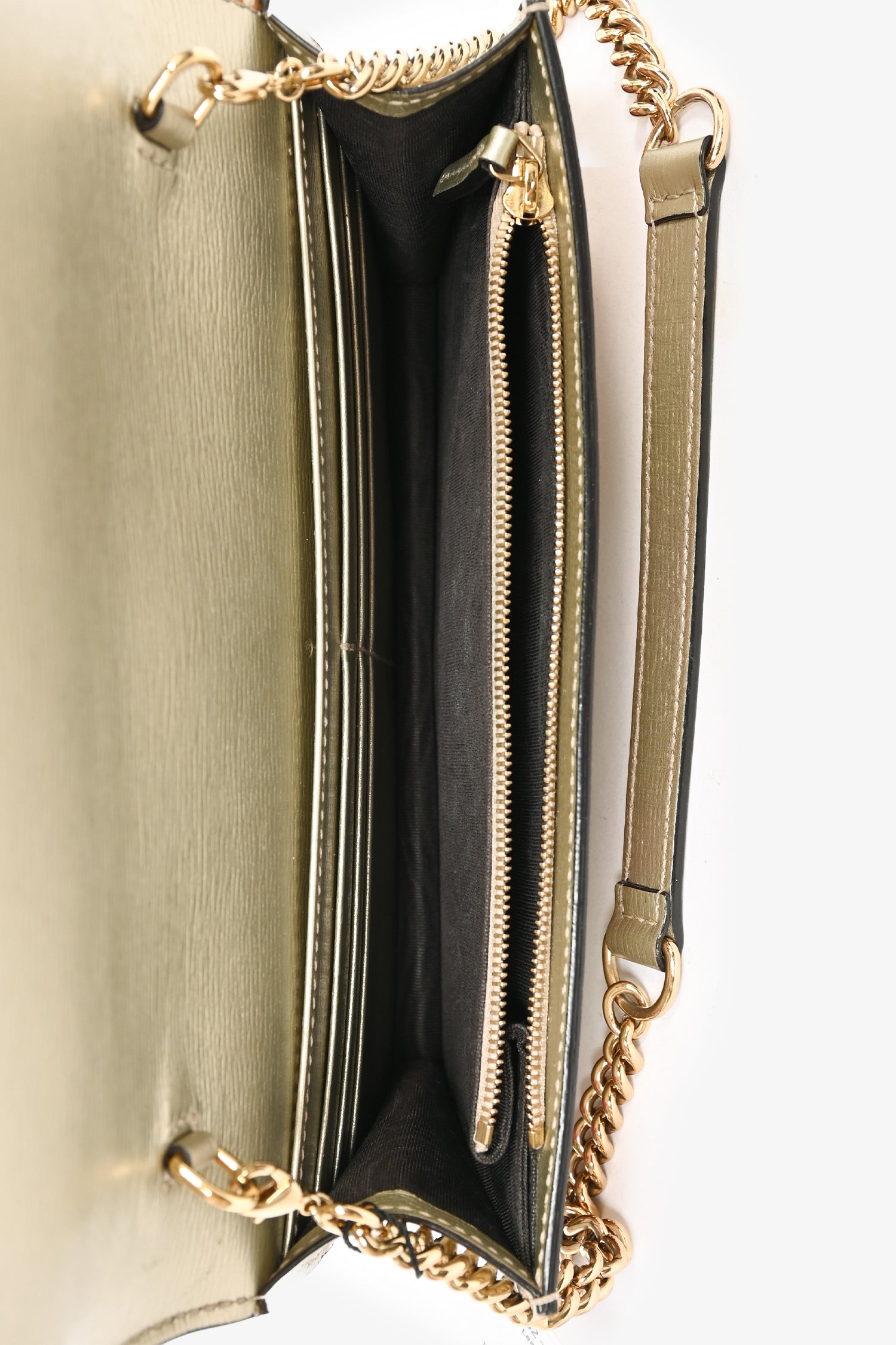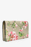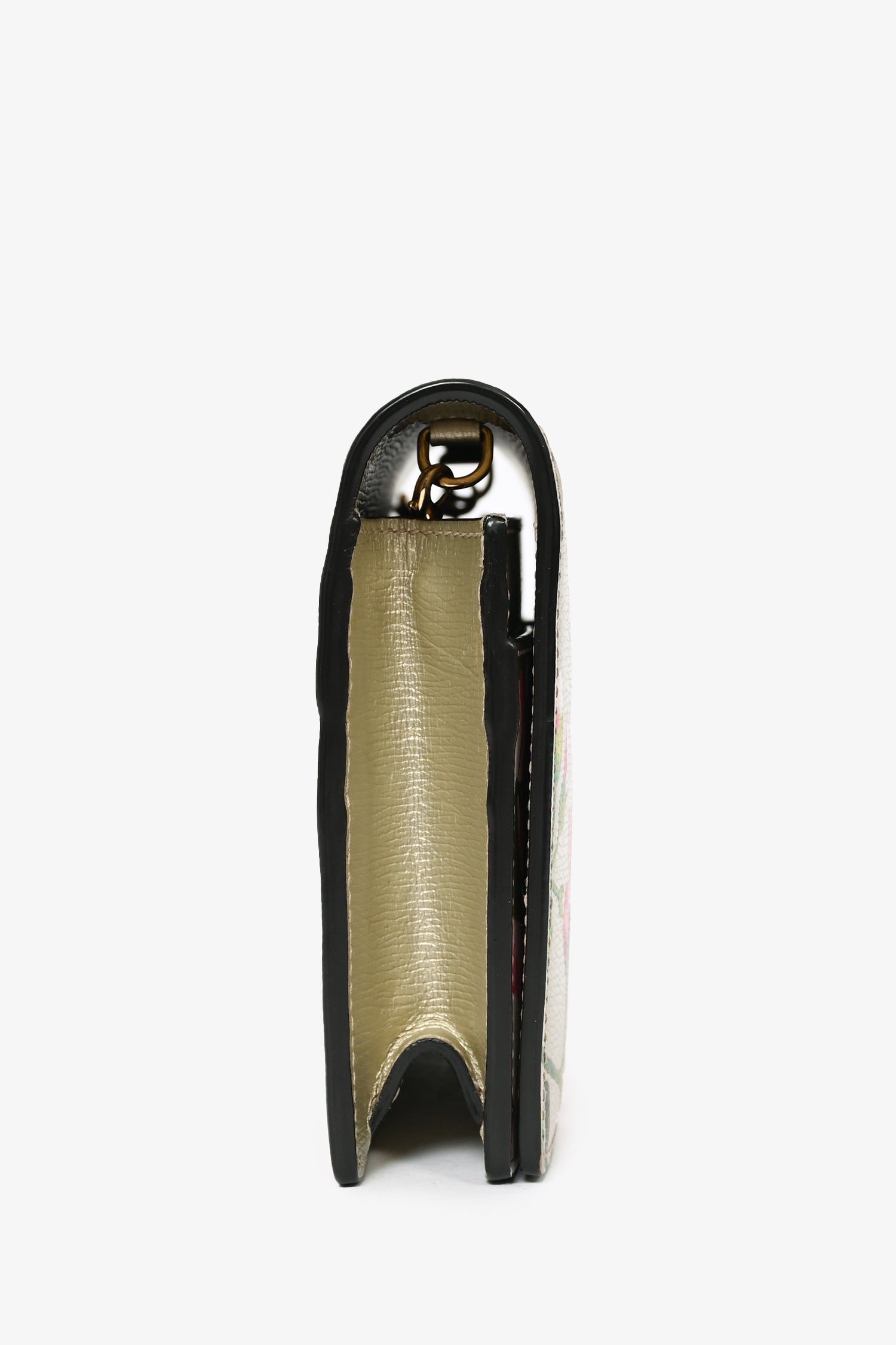 Refresh availabilityGucci Gold Leather Blooms Wallet On Chain. Tonal stitching. Leather trim. Gold toned-hardware. Leather and gold hardware shoulder strap. Snap closure. Fold-over flap. Interior zippered pouch. 8 card holder pouches.