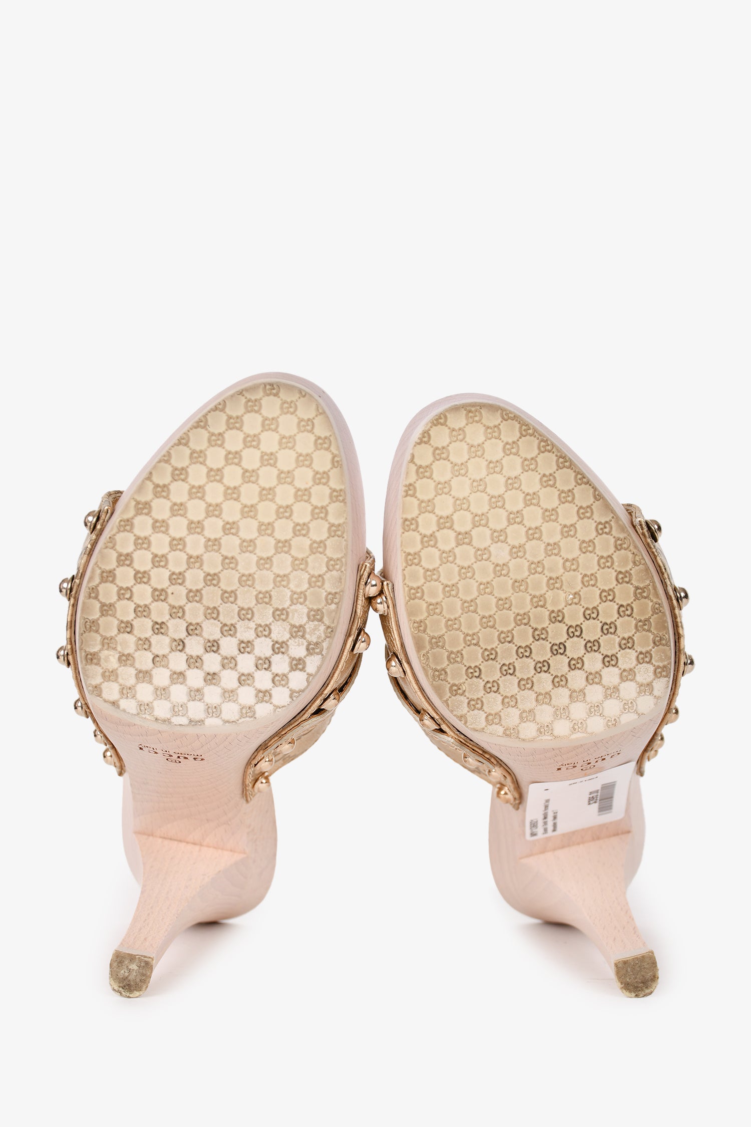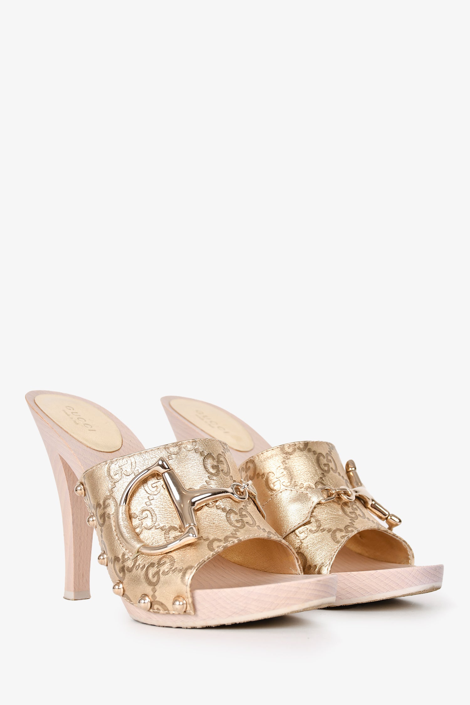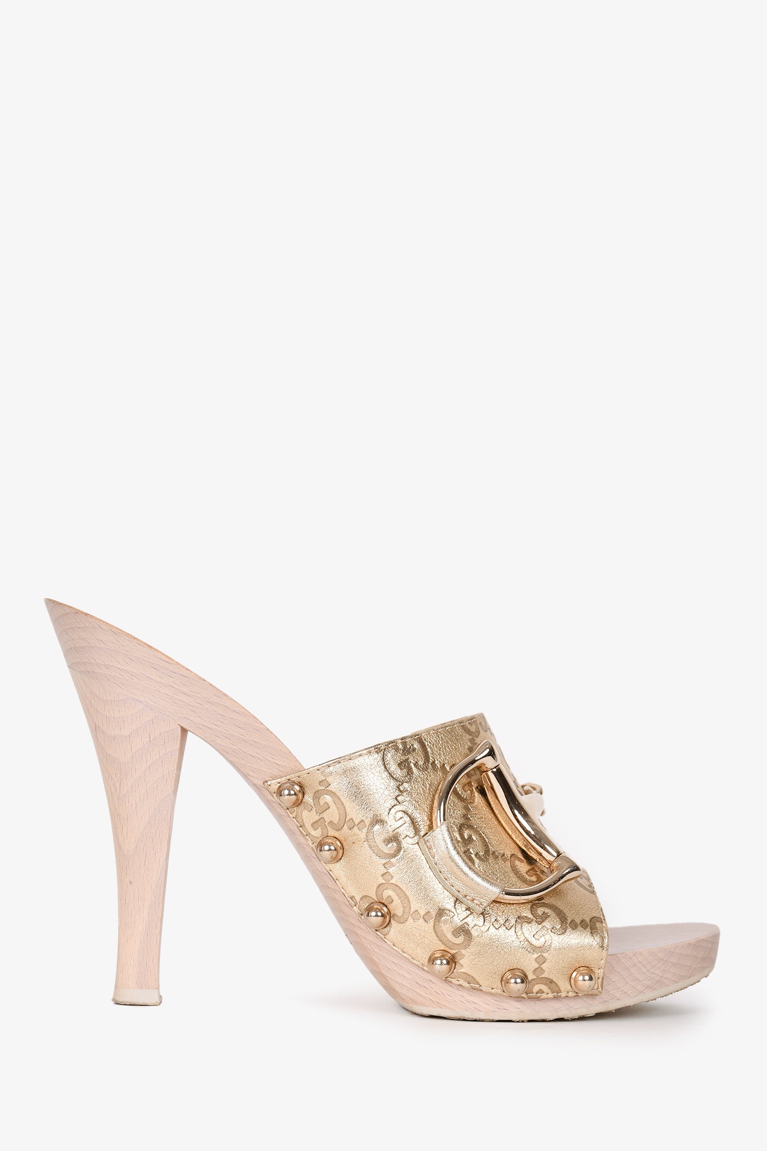 Refresh availabilityGucci Gold Metallic Horsebit Detail Wooden Heels. Almond toe. Slip on. Tonal stitching.
