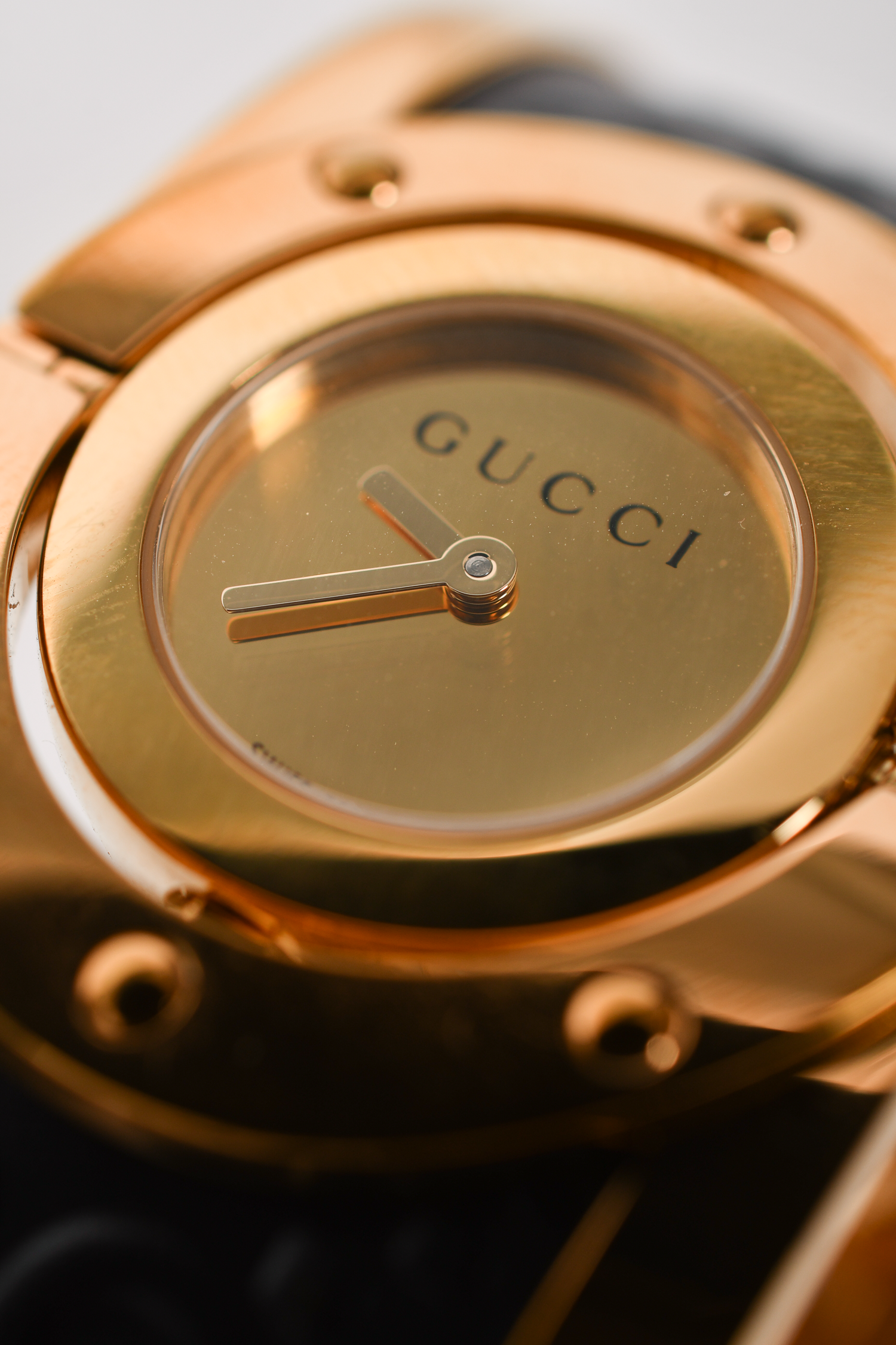 Refresh availabilityGucci Gold Toned GG Leather Twirl Watch. Latch closure. Round face.