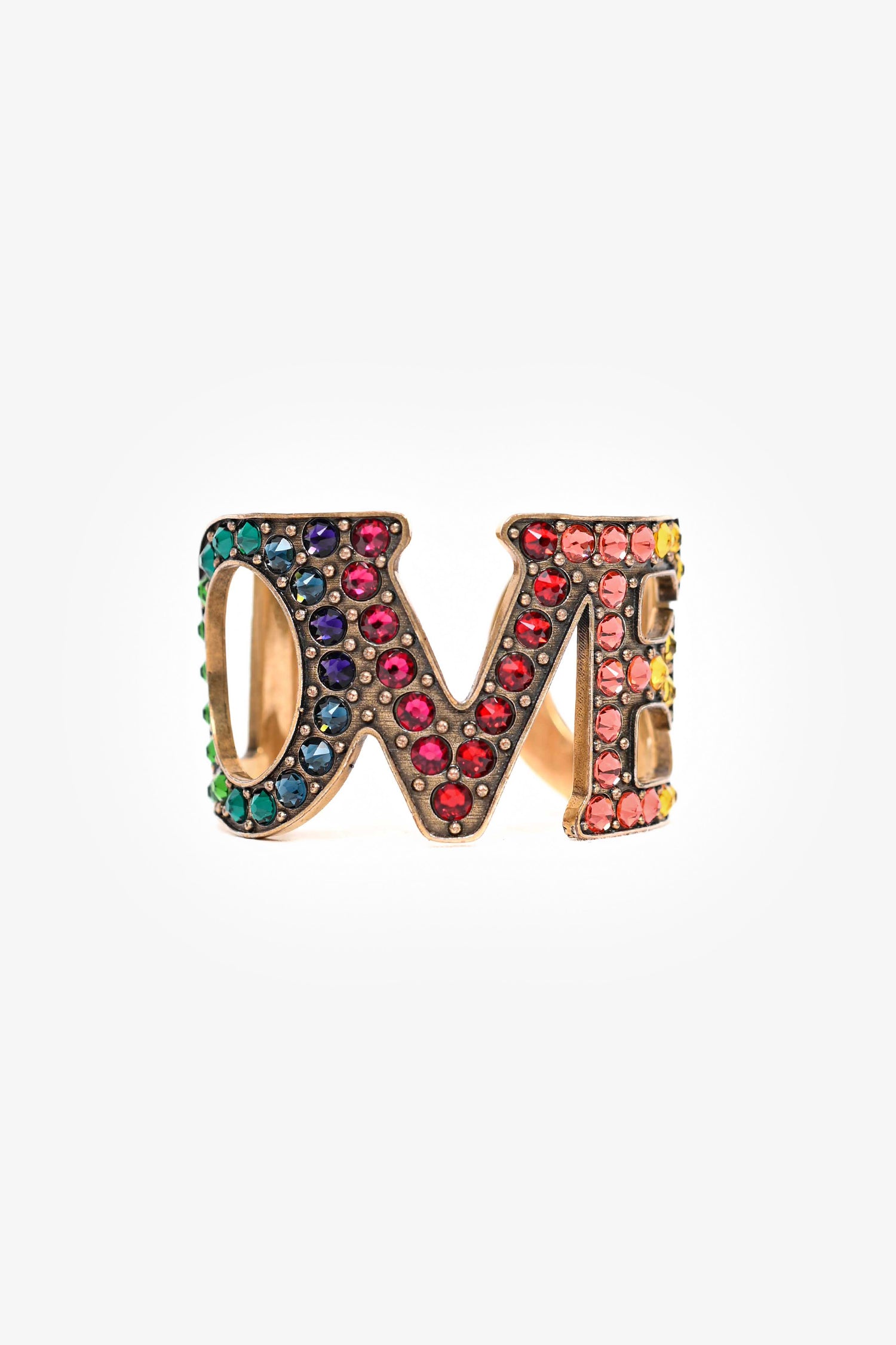 Refresh availabilityGucci Gold Toned Multicolour Crystal 'LOVED' Cuff Bracelet. Gold-tone hardware. Multi-coloured crystals.