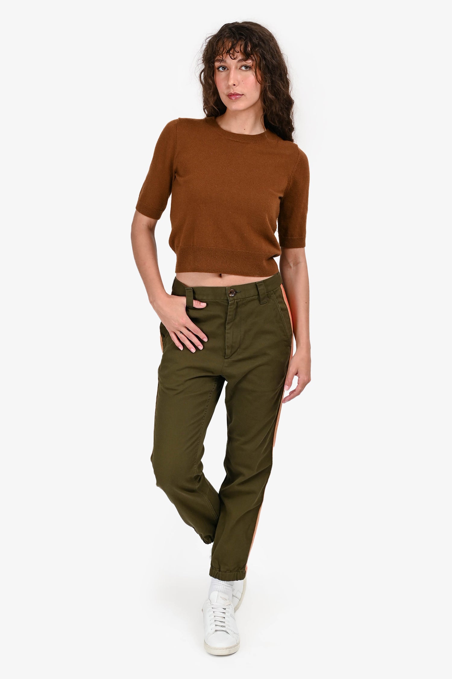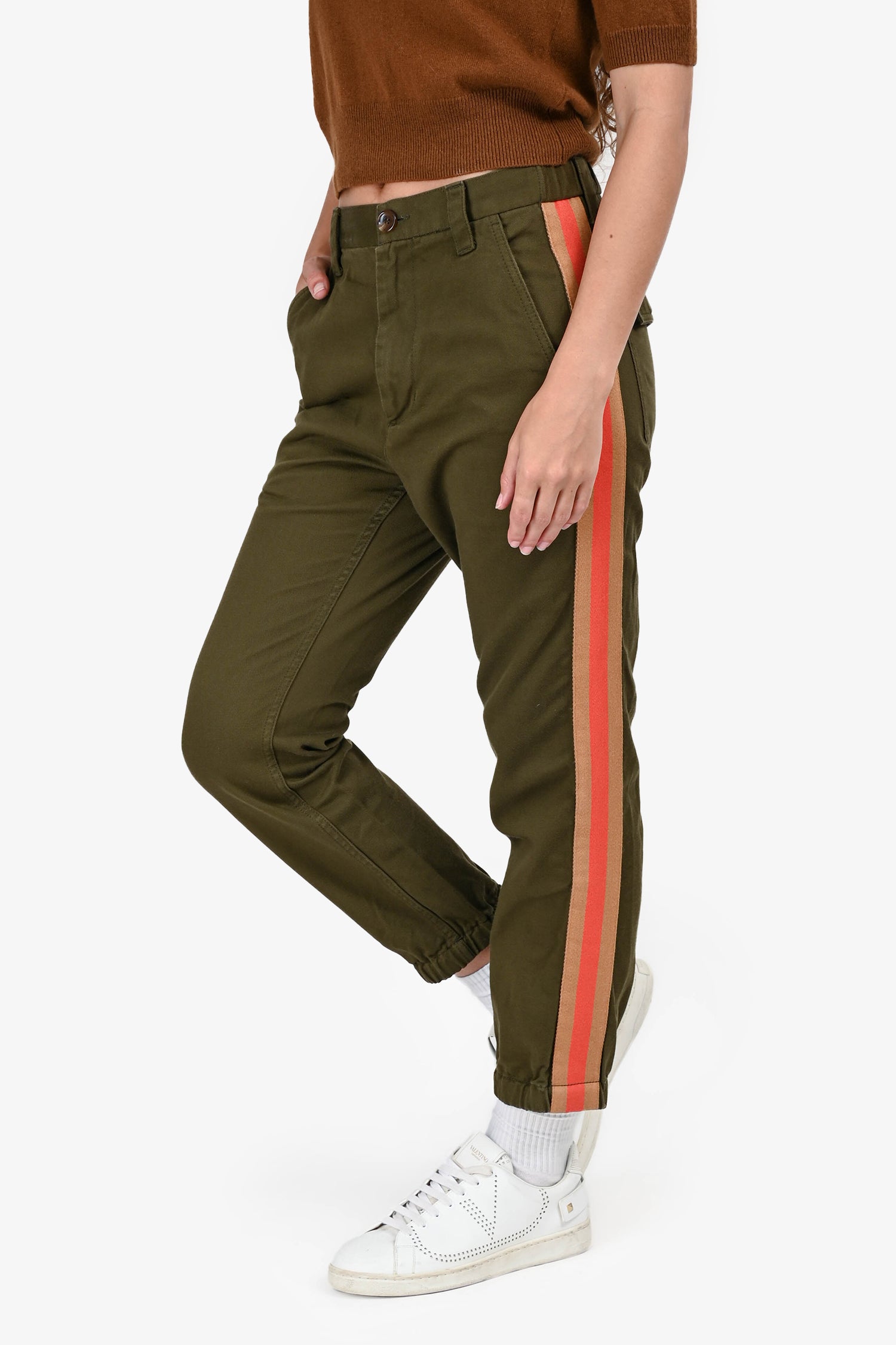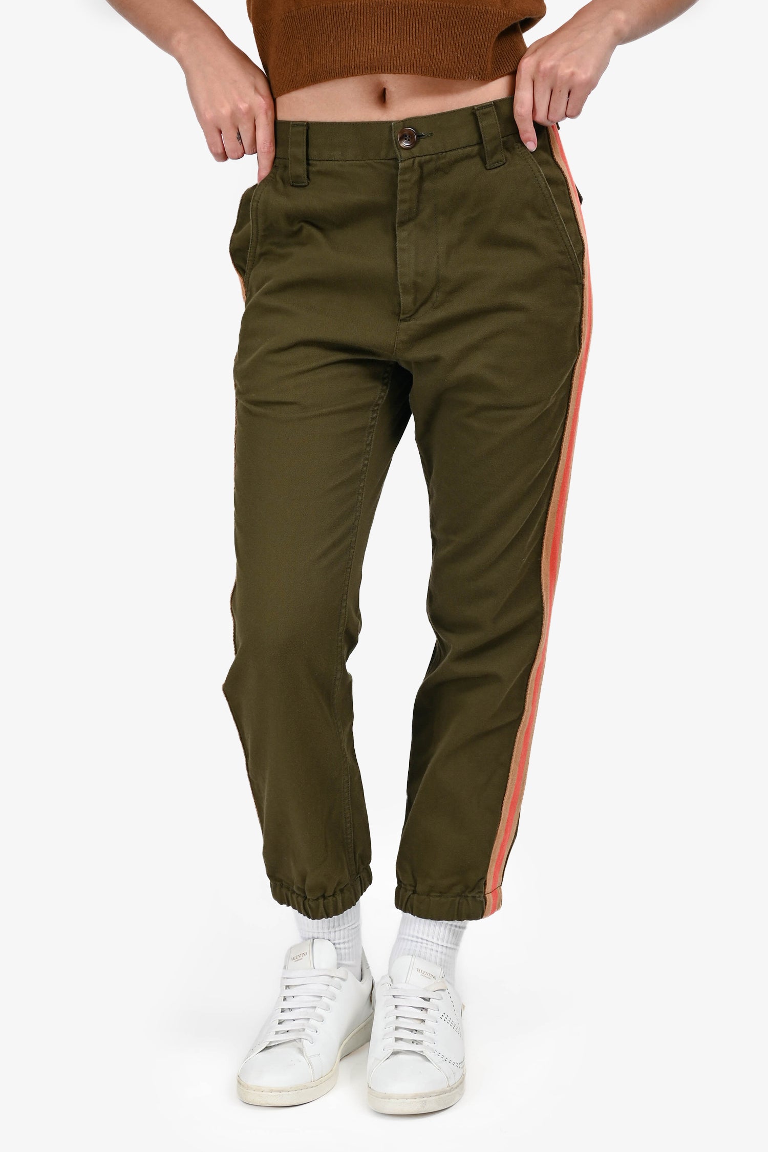 Refresh availabilityGucci Green Cotton Stripe Detail Cargo Joggers. Front zip and button closure. Elastic waistband with interior drawstring. Side and back pockets. Elastic cuffs. Pull-on style. Tonal stitching.