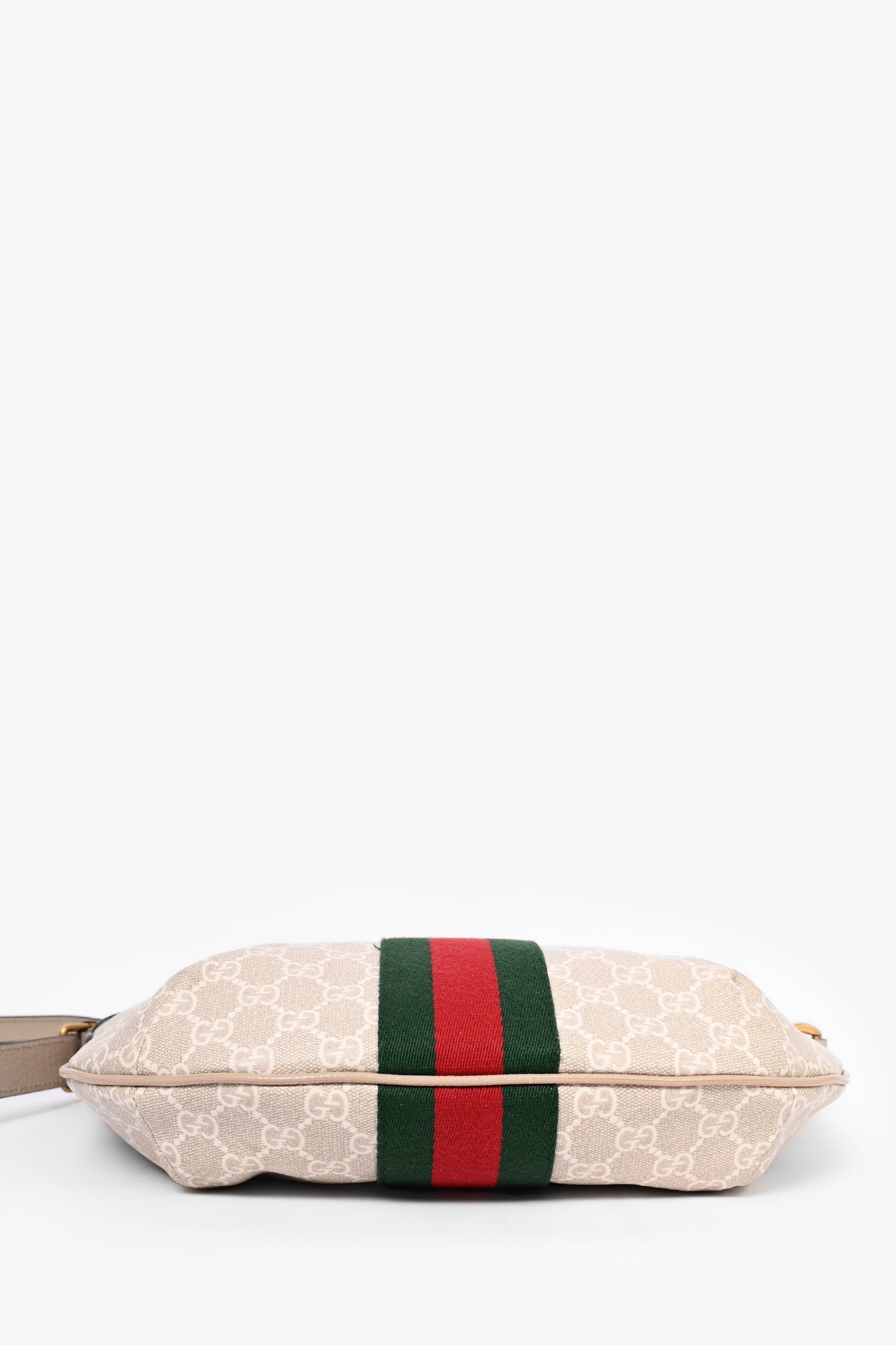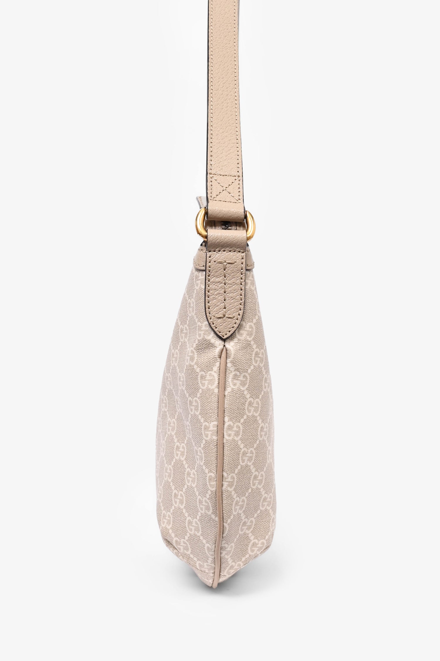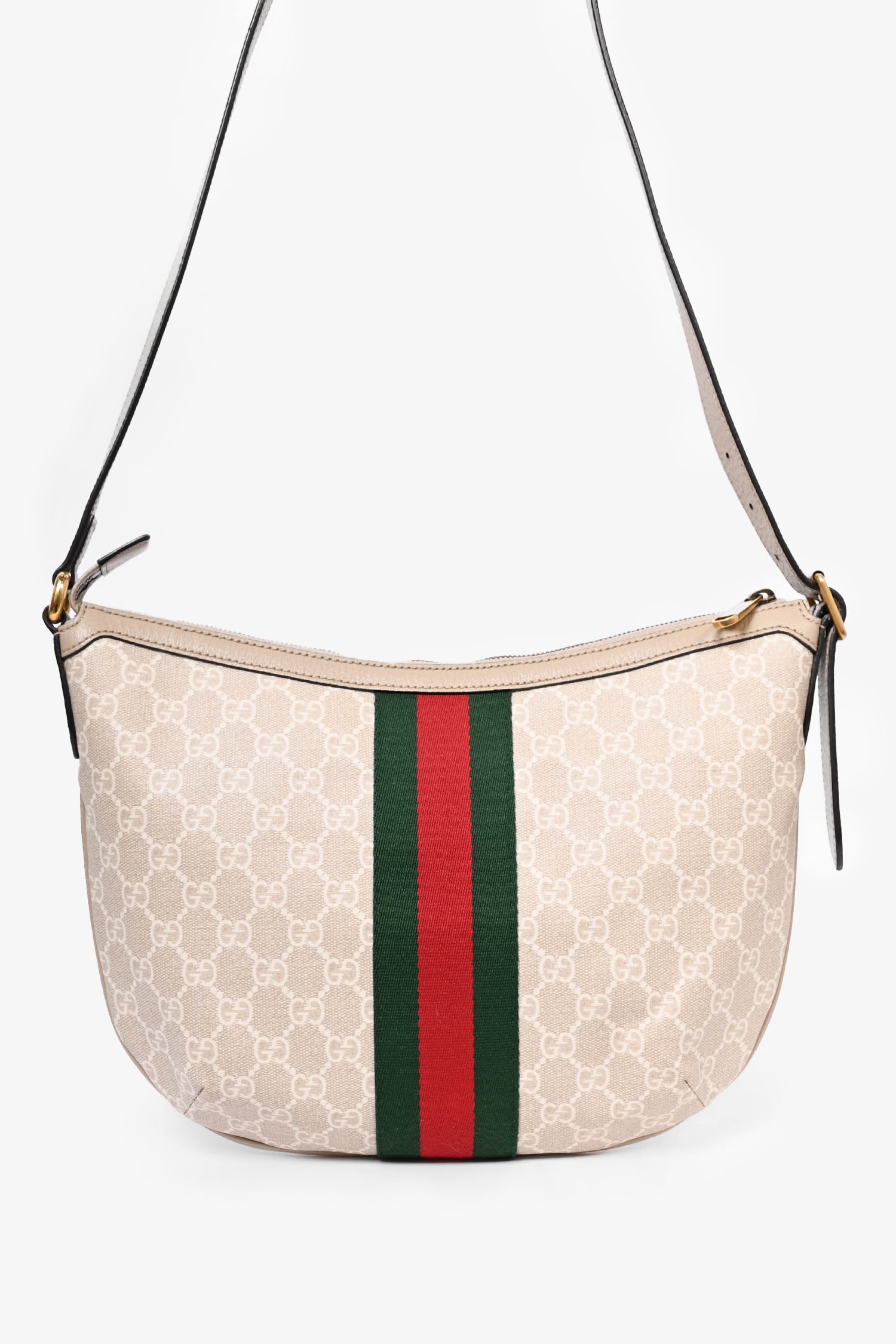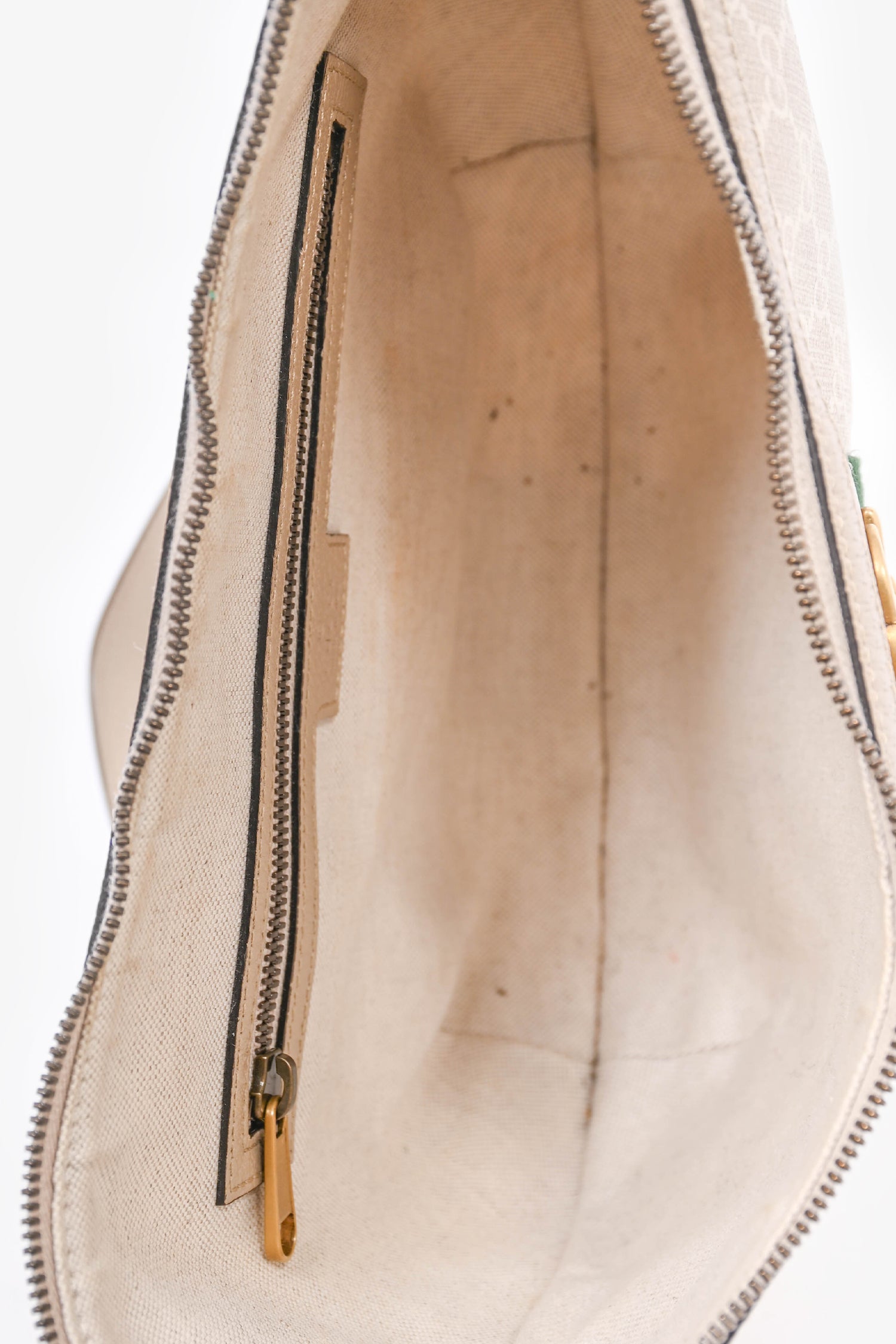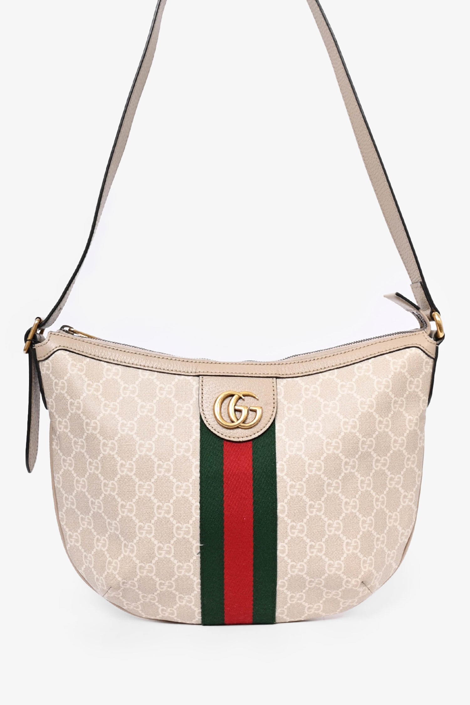 Refresh availabilityGucci Beige Canvas Ophidia 'GG' Half Moon Bag. Tonal stitching. Antiqued gold-tone hardware. Leather trimming. Zipped interior pocket. Adjustable shoulder strap.