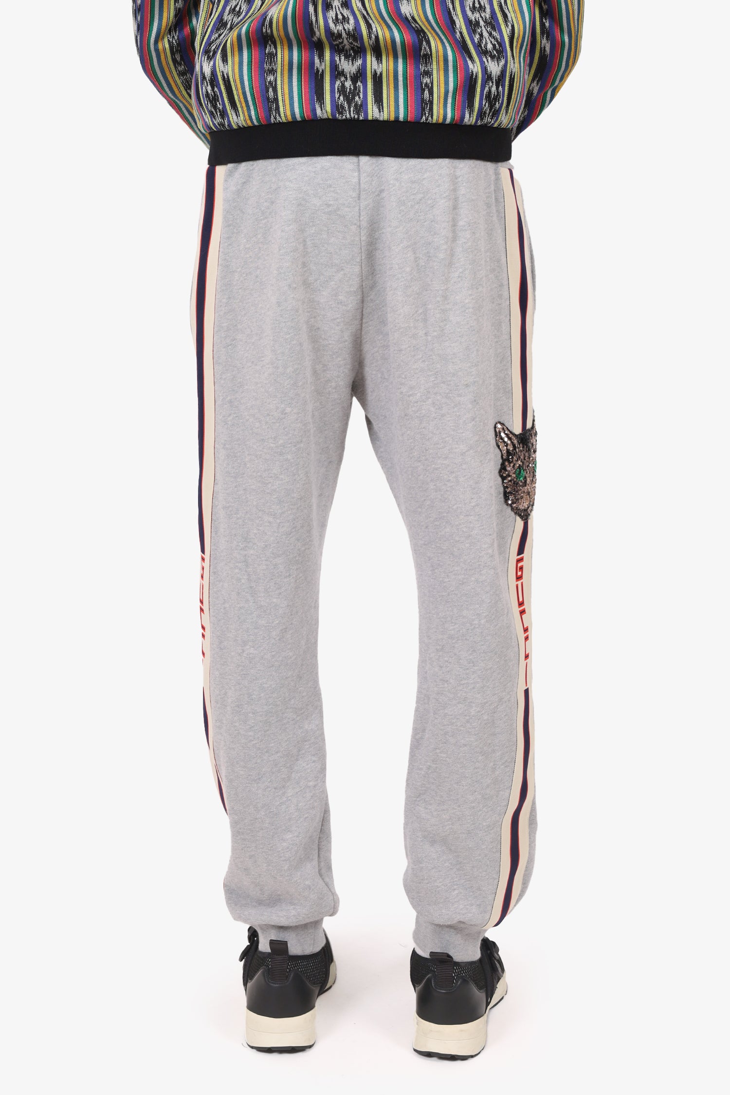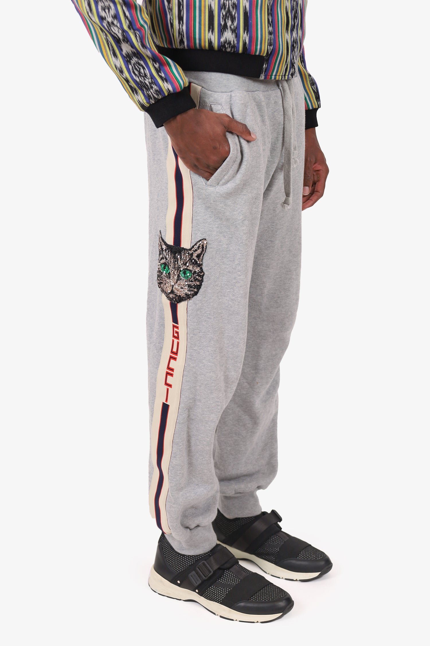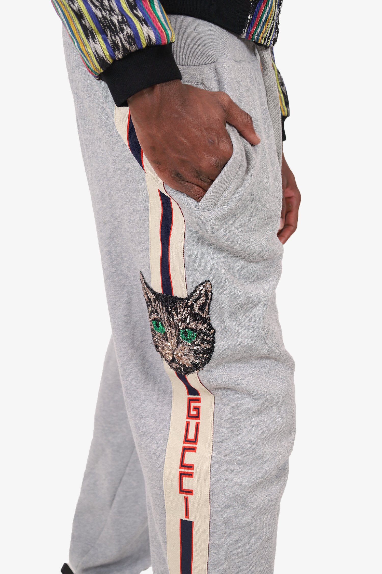 Refresh availabilityGucci Grey Cat Sweatpants. Pull-on. Elasticated waistband with drawstring closure. 2 exterior front slip pockets. Silver-tone hardware. Tonal stitching.