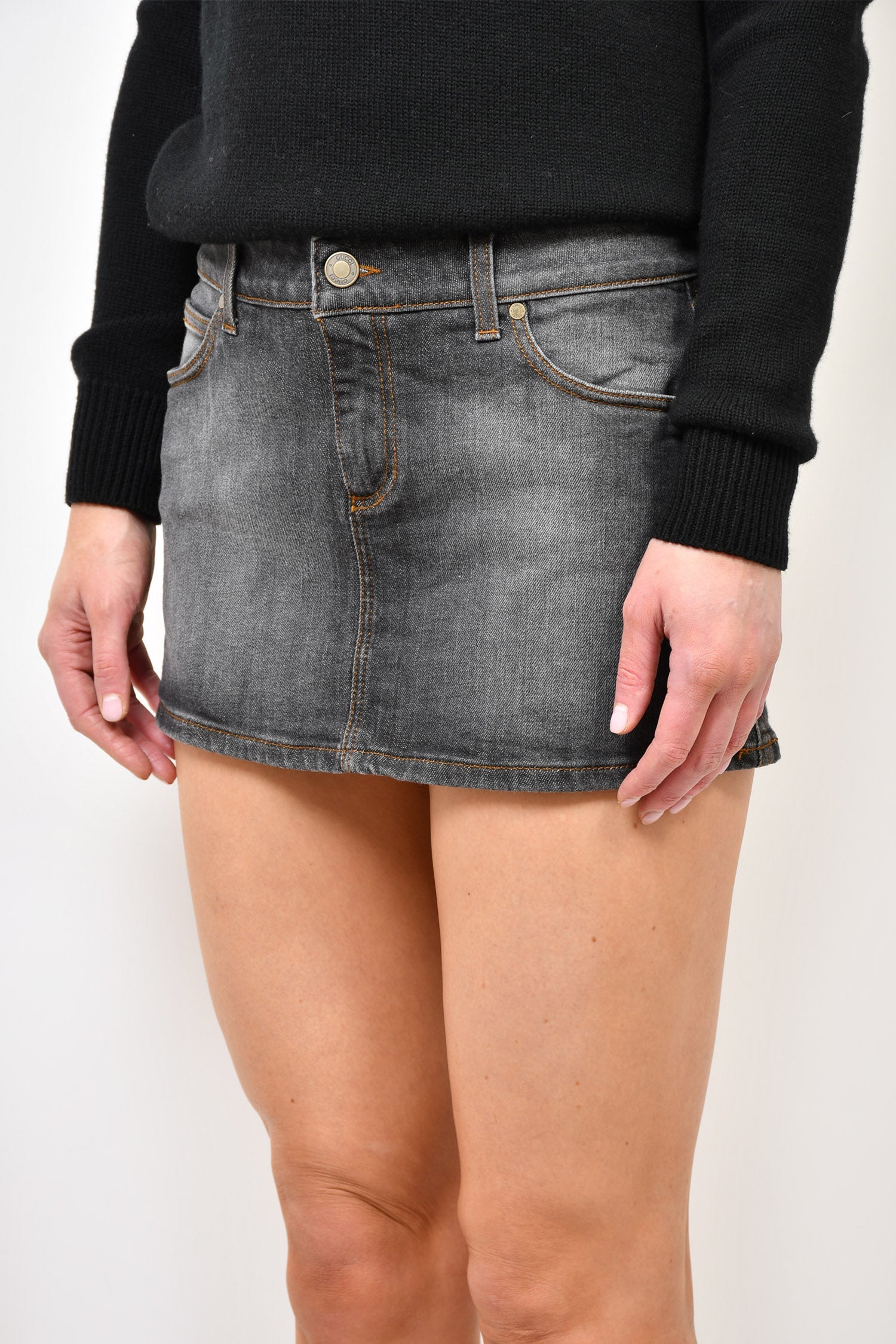 Refresh availabilityGucci Grey Denim Mini Skirt. Leather patch with GG monogram design on back. Front zip and top button closure. Classic 5 pocket design. Belt loops. Contrast stitching.