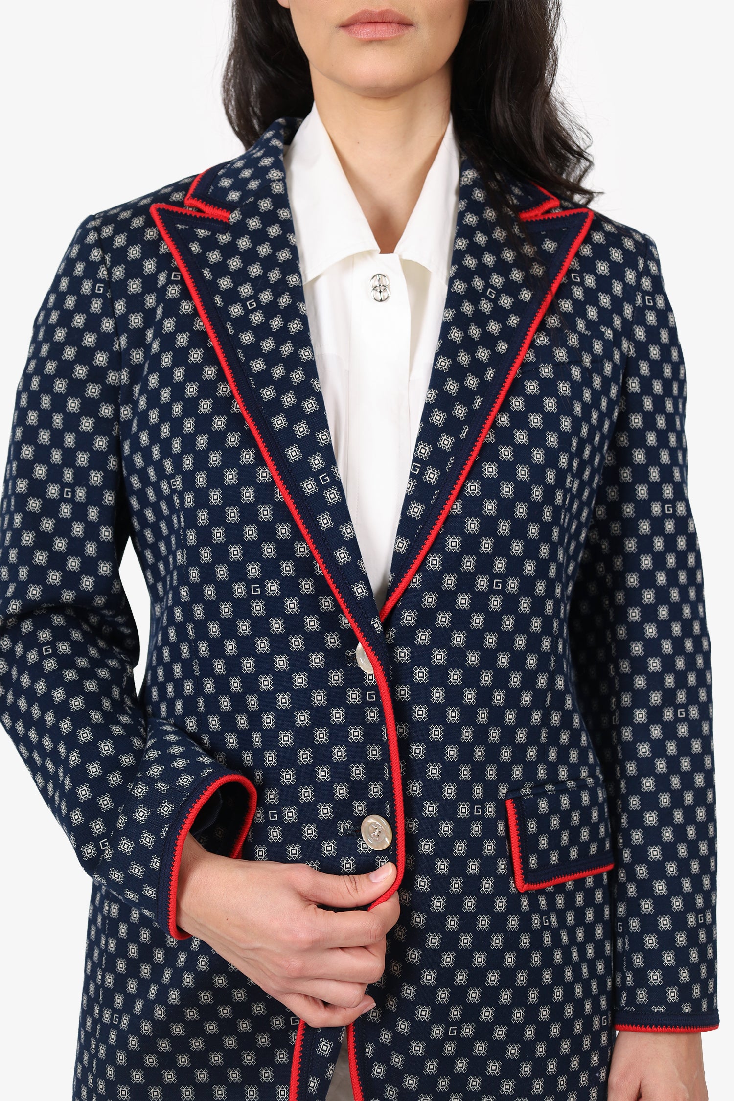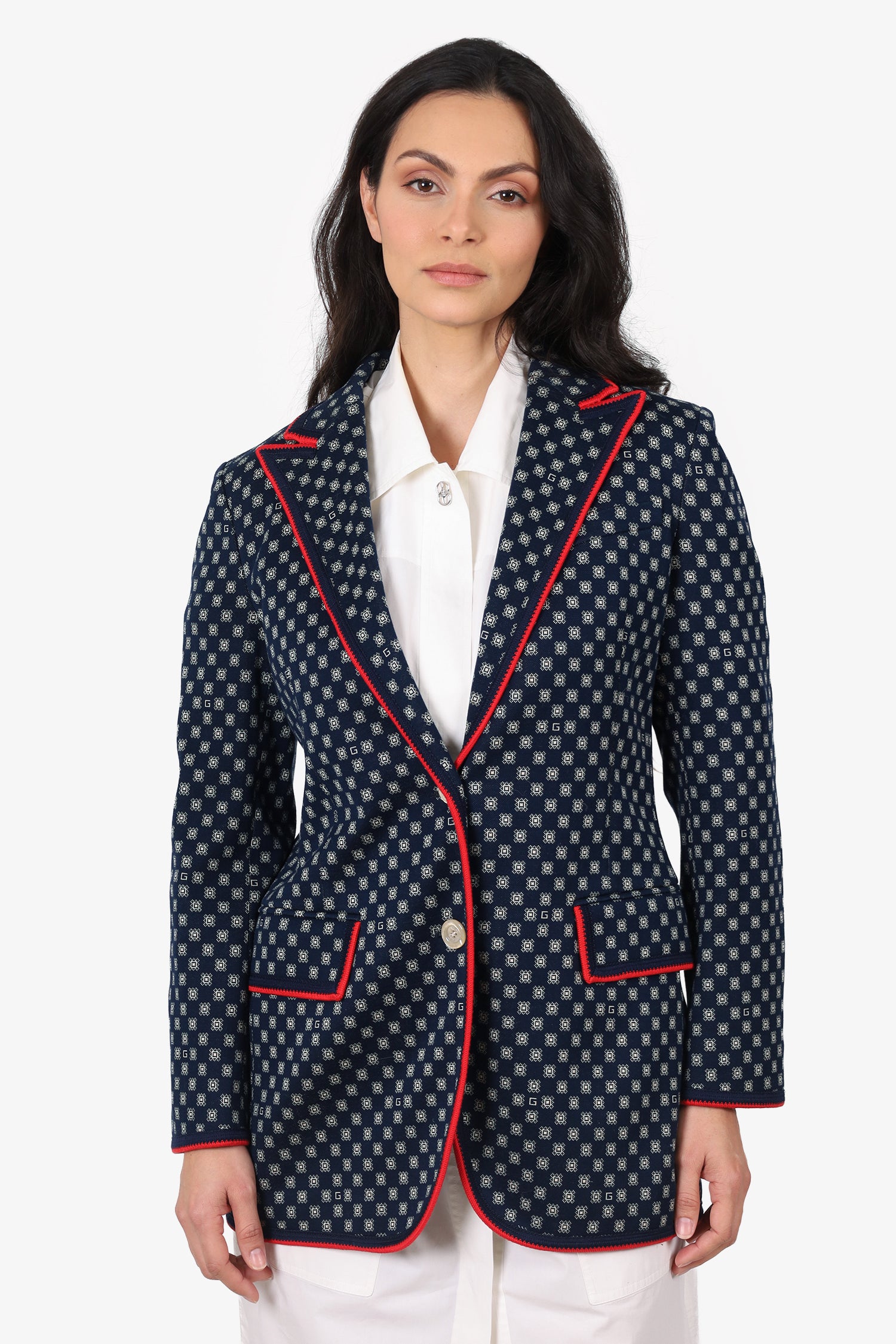 Refresh availabilityGucci Navy Blue/Red Trim Printed Single Breasted Blazer. Pull-on. Peak lapels. Front button-up closure. 2 exterior side slip pockets. Sleeve cuffs with button-up closure. Lined interior. 2 interior pockets: 1 chest front fold over pocket with button-up closure and 1 chest slip pocket. Single rear vent. Tonal stitching.