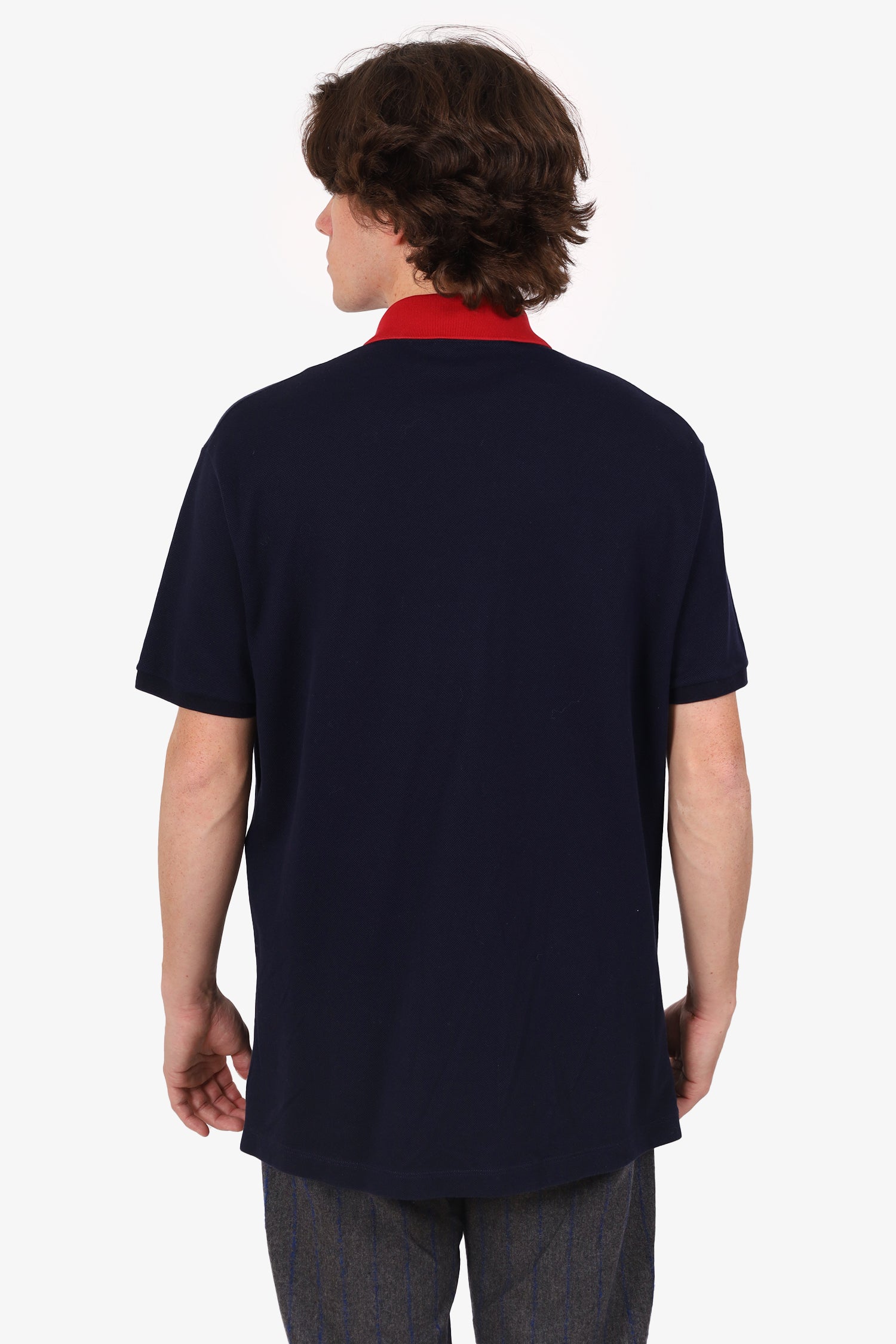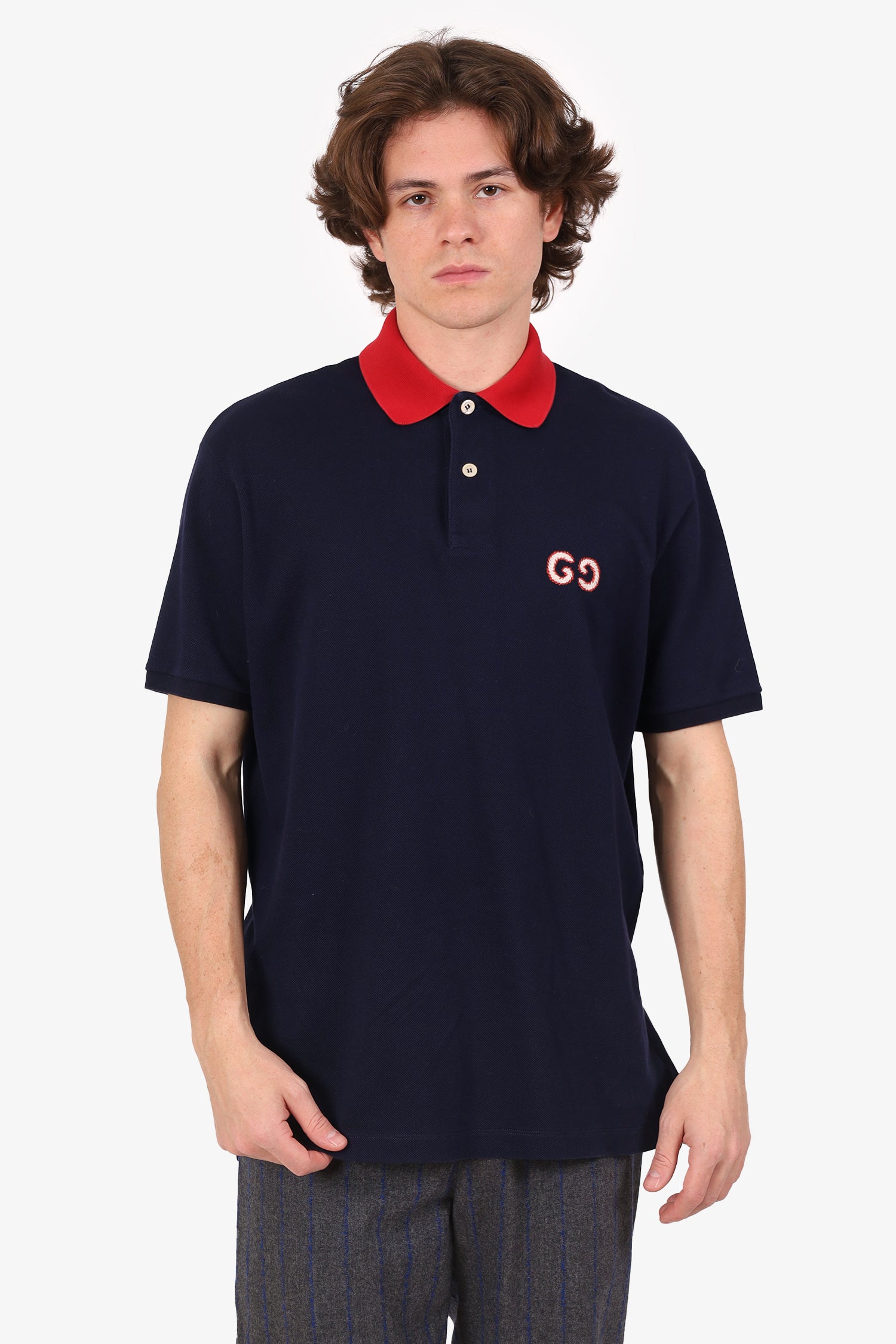Refresh availabilityGucci Navy GG Logo Embroidered Polo Shirt. Pull-on. Collared-neckline. Front button-up closure. Tonal stitching.