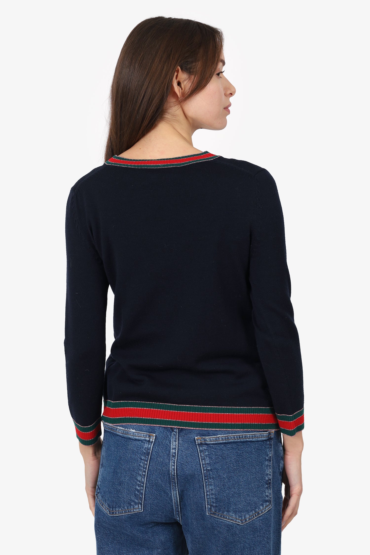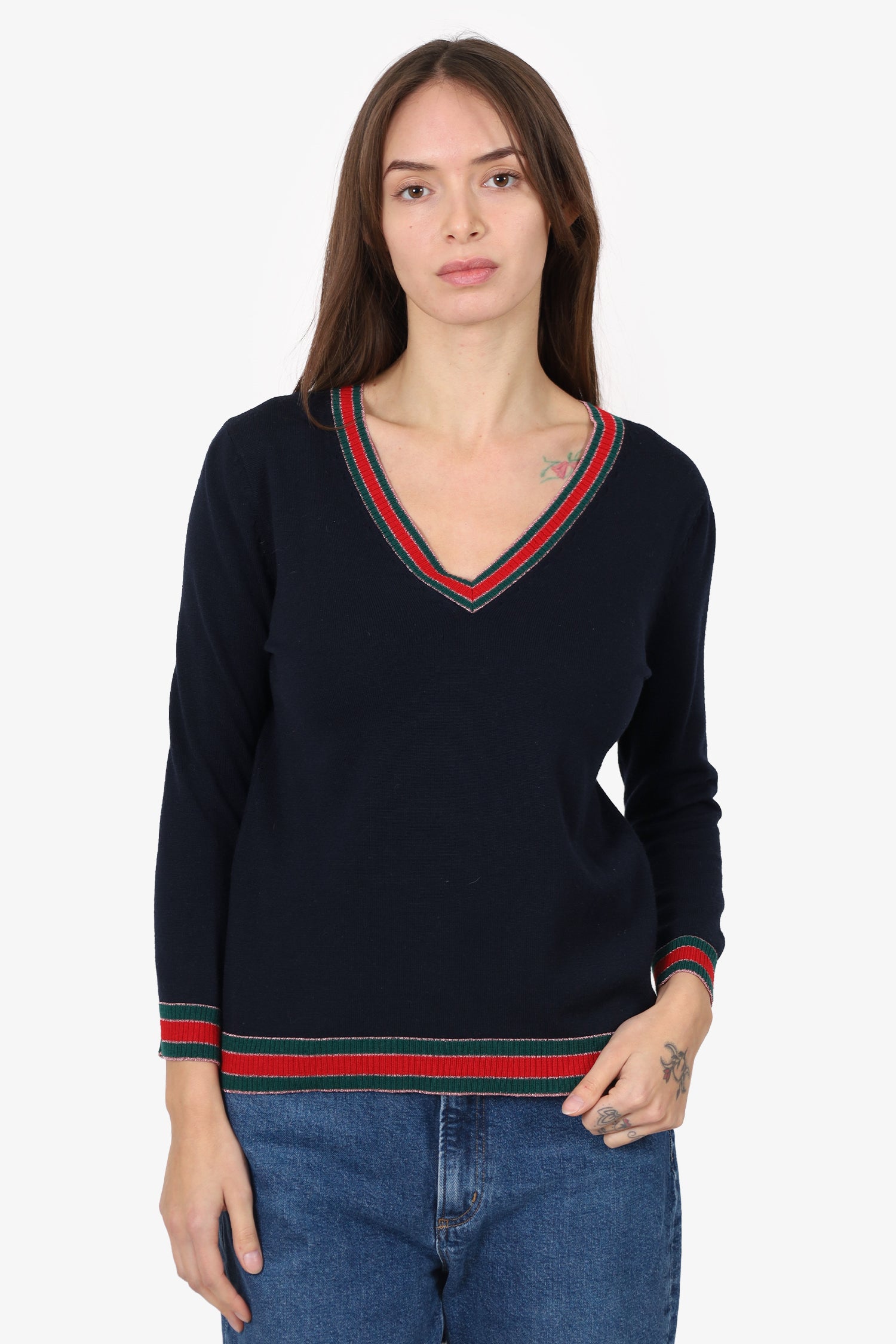 Refresh availabilityGucci Navy Wool Web Trim Sweater. Pull-on. V-neckline. Tonal stitching.