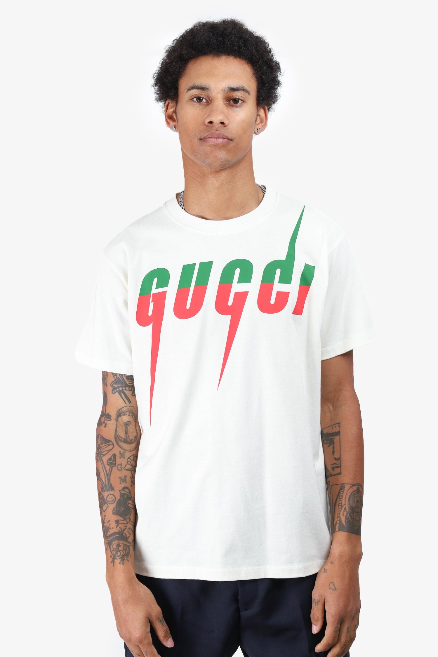 Refresh availabilityGucci Off White Cotton 'Blade' Print T-Shirt. Pull-on. Round neckline. Unlined. Tonal stitching.