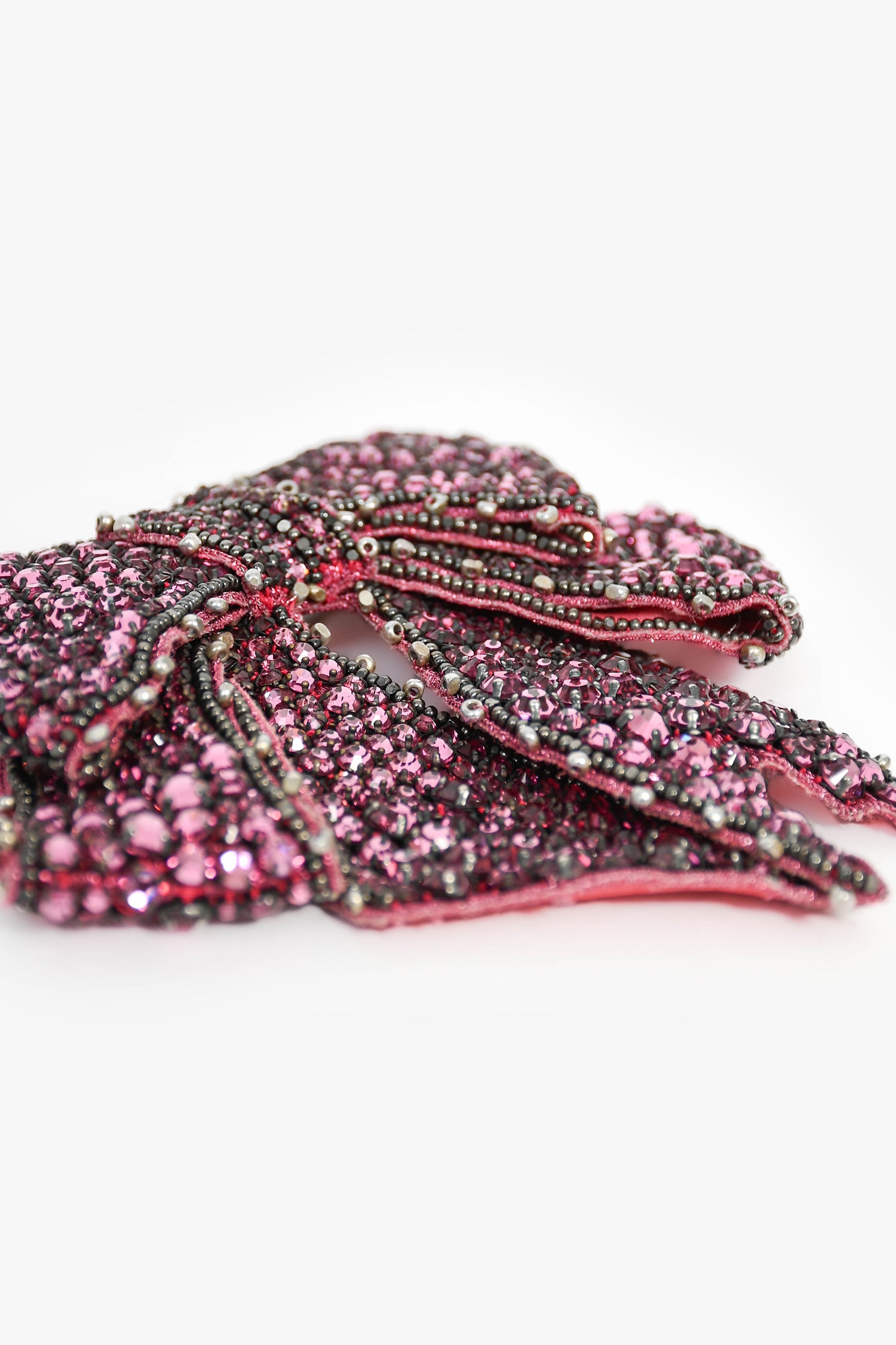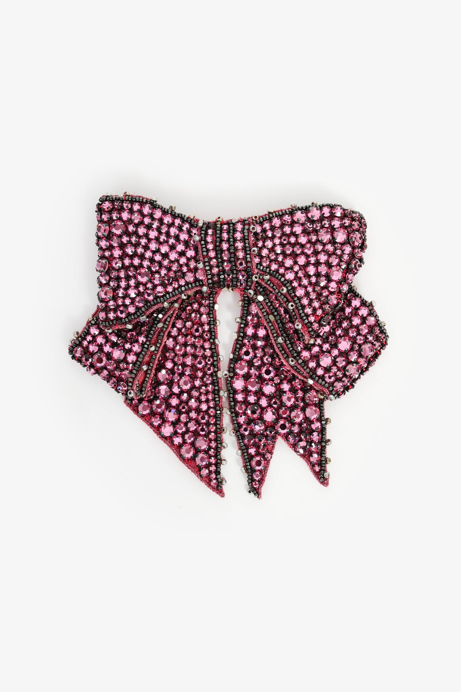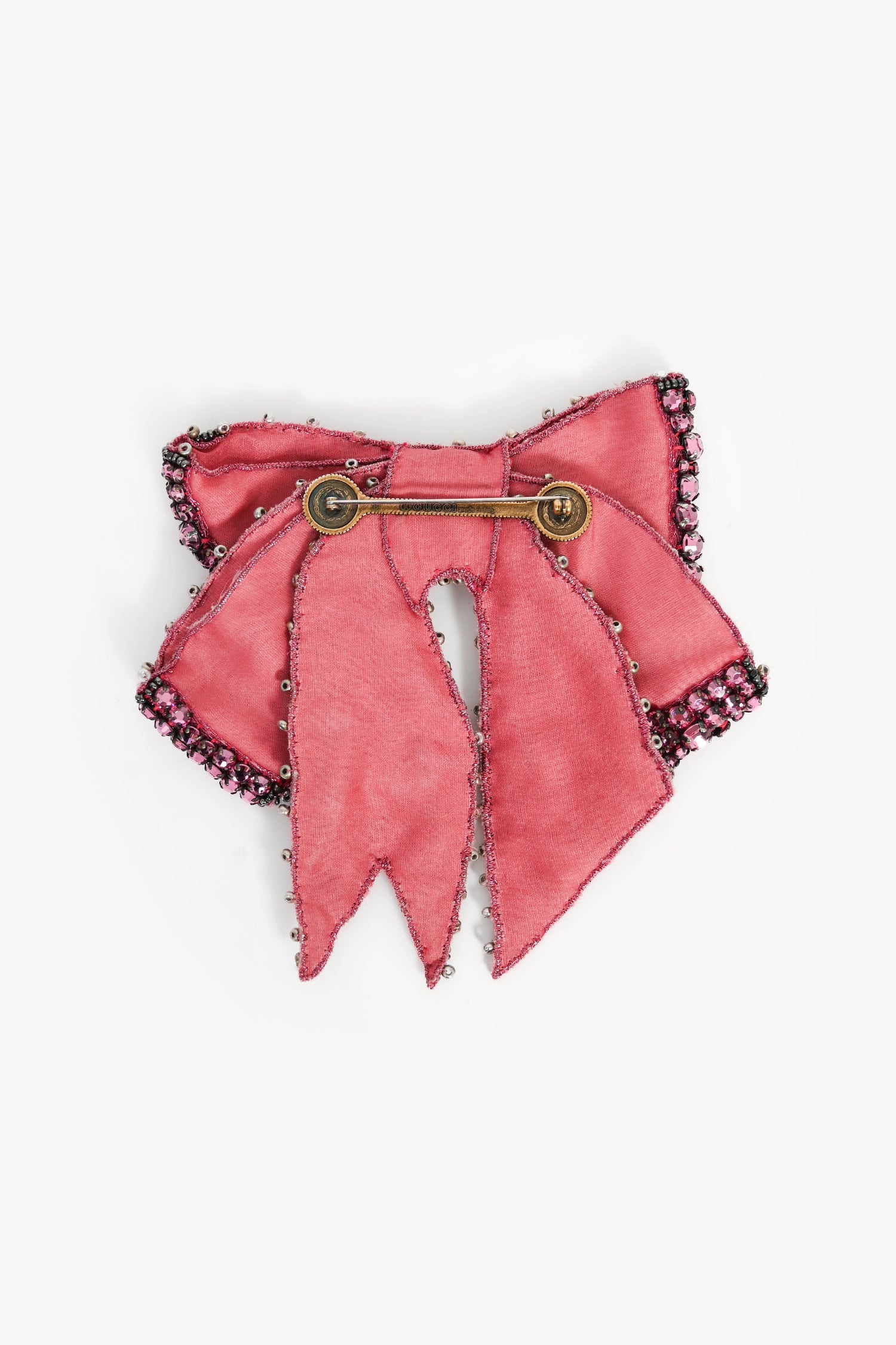 Refresh availabilityGucci Pink Crystal Bow Brooch Pin. Crystals. Gold and silver-tone pin closure. Silver-tone micro beads. Tonal stitching.