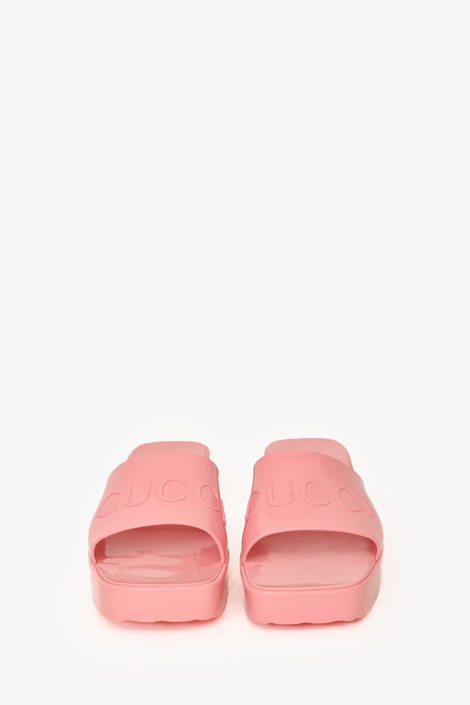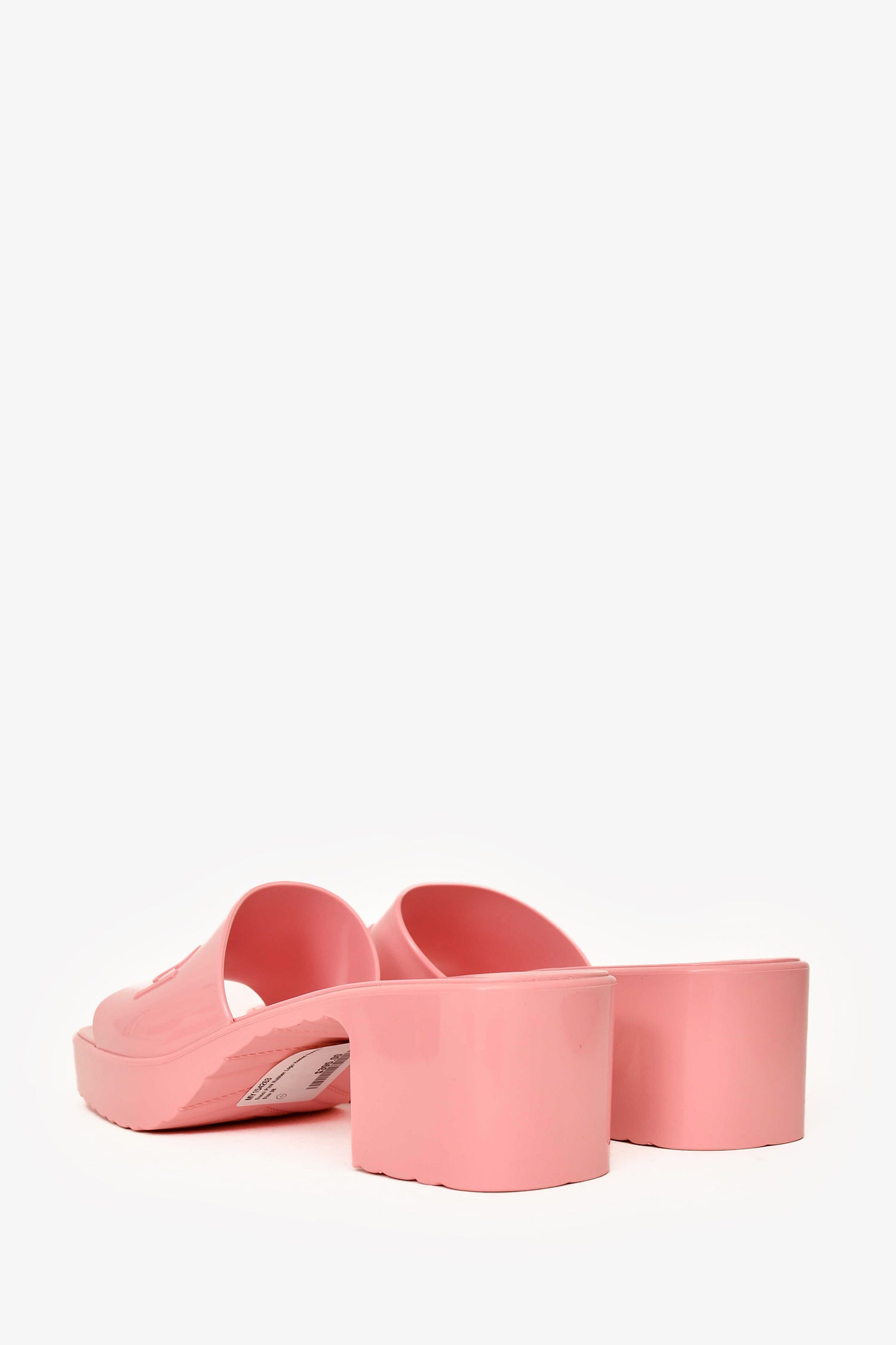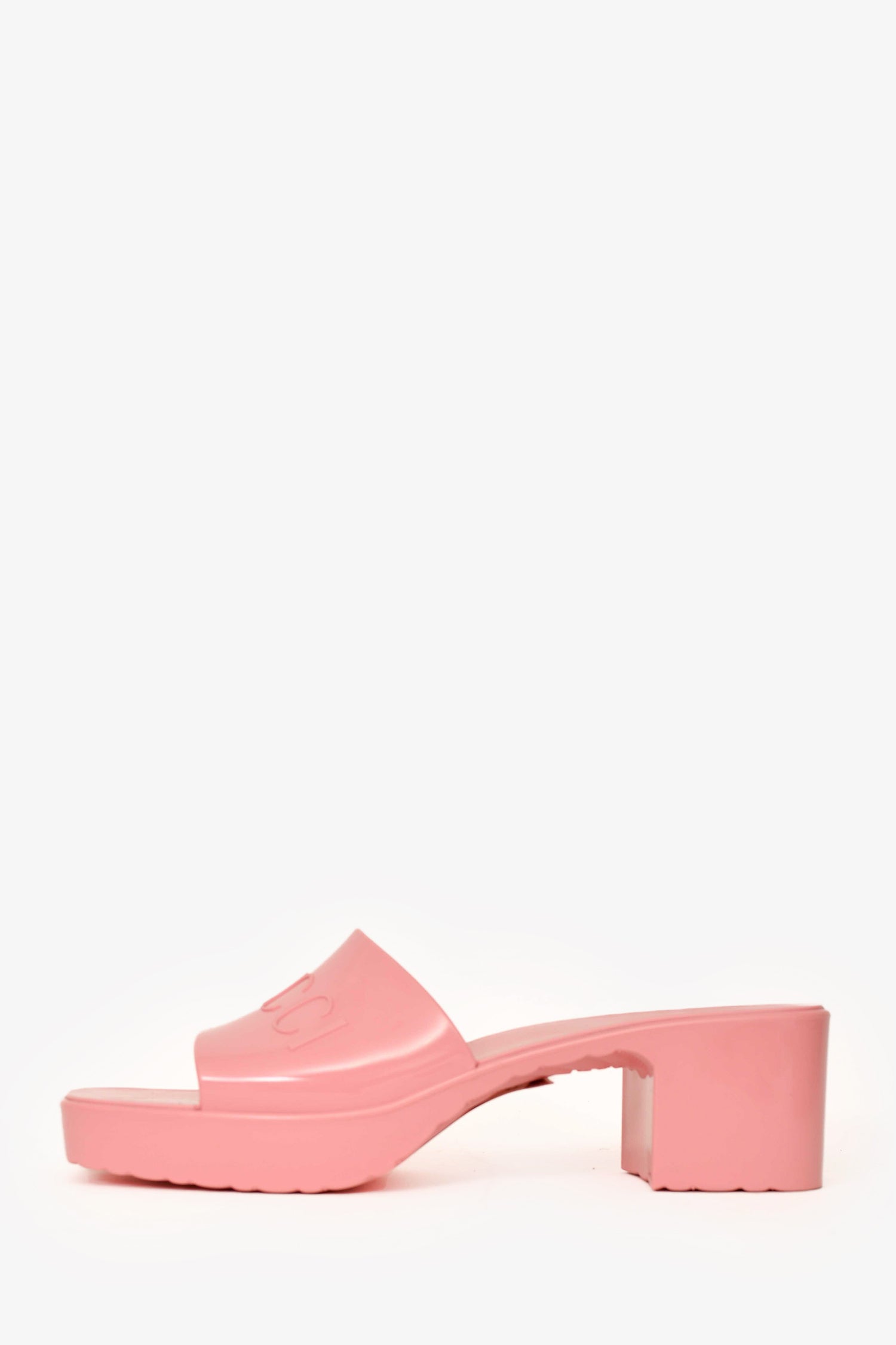 Refresh availabilityGucci Pink Rubber Logo Heeled Sandals. Slip-on. Open toe. Block heel. Tonal stitching.