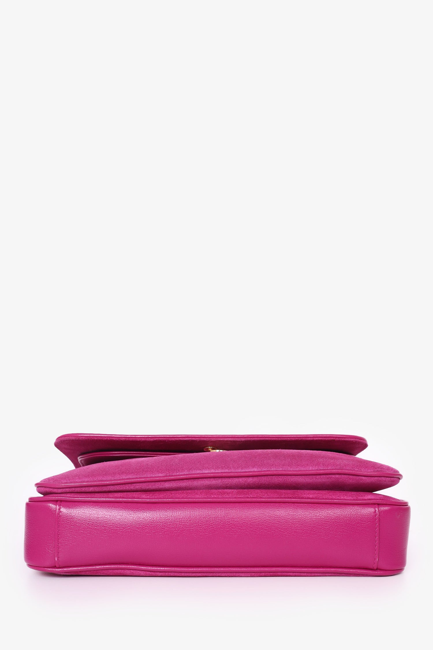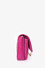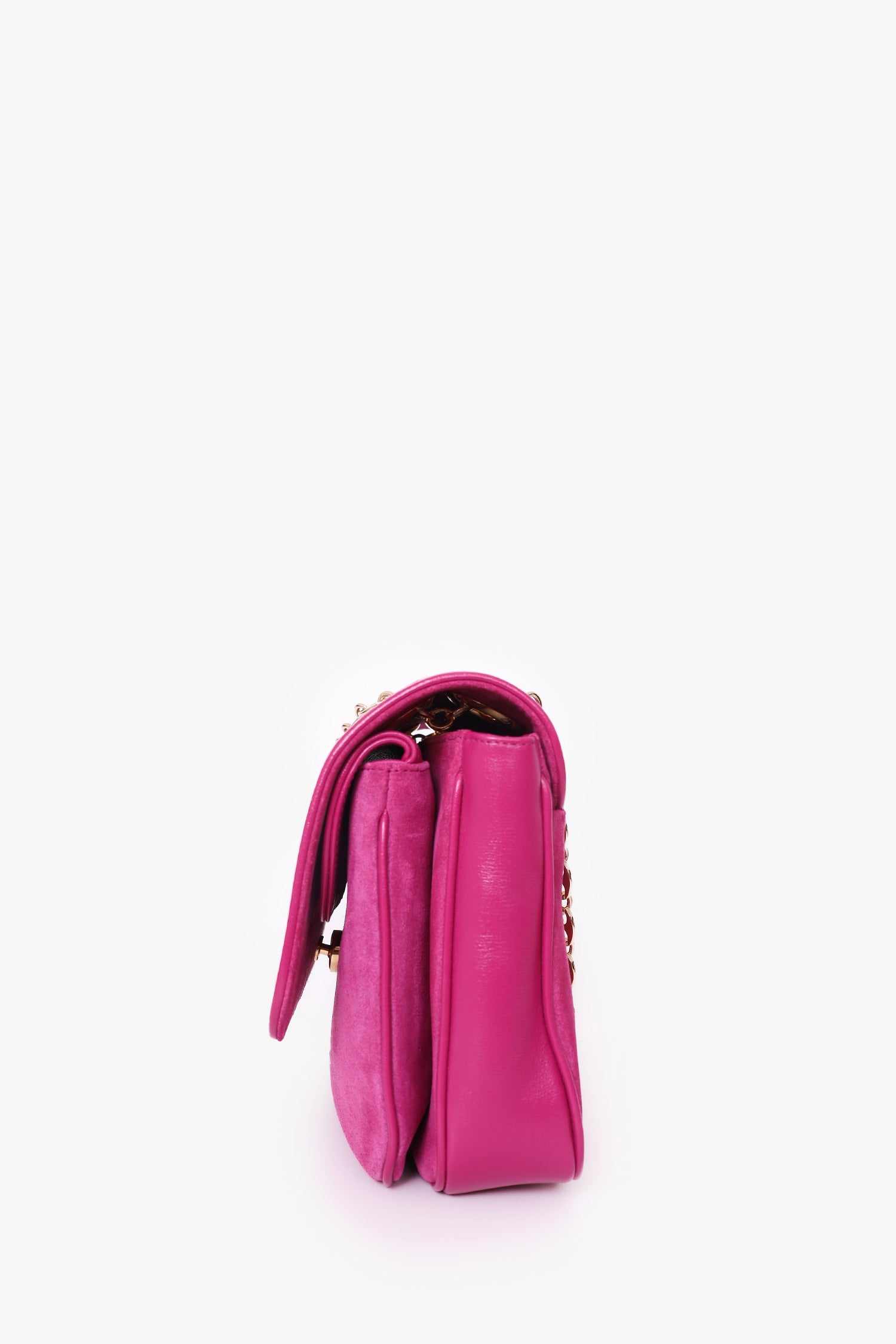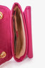 Gucci Pink Suede Marina Chain Shoulder Bag. Double chain shoulder straps. Front fold-over flap with snap button closure. Front interior pouch with fold-over flap and single wall slip pocket inside. Open suede interior with single wall zip pocket. Gold-tone hardware. Tonal stitching.