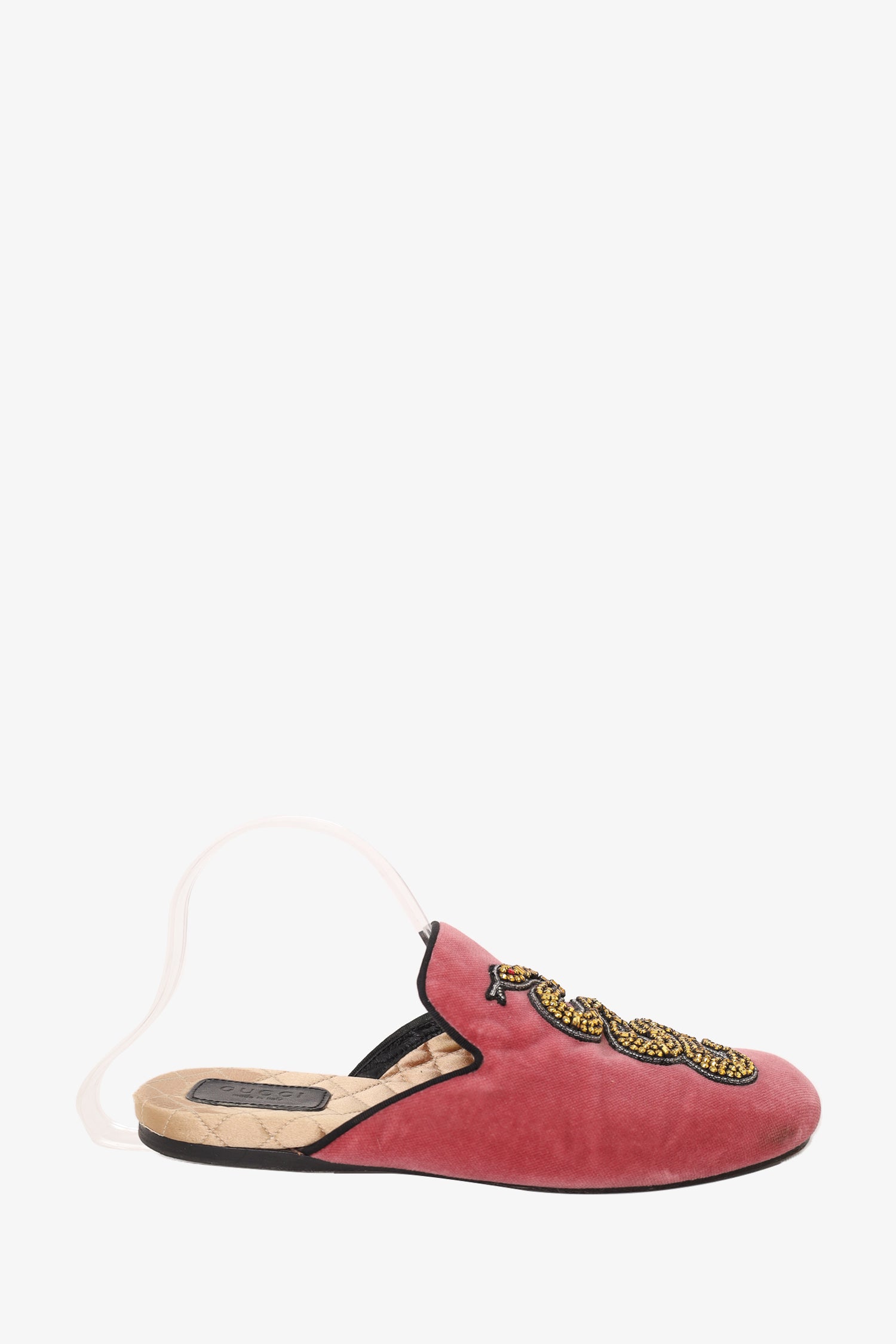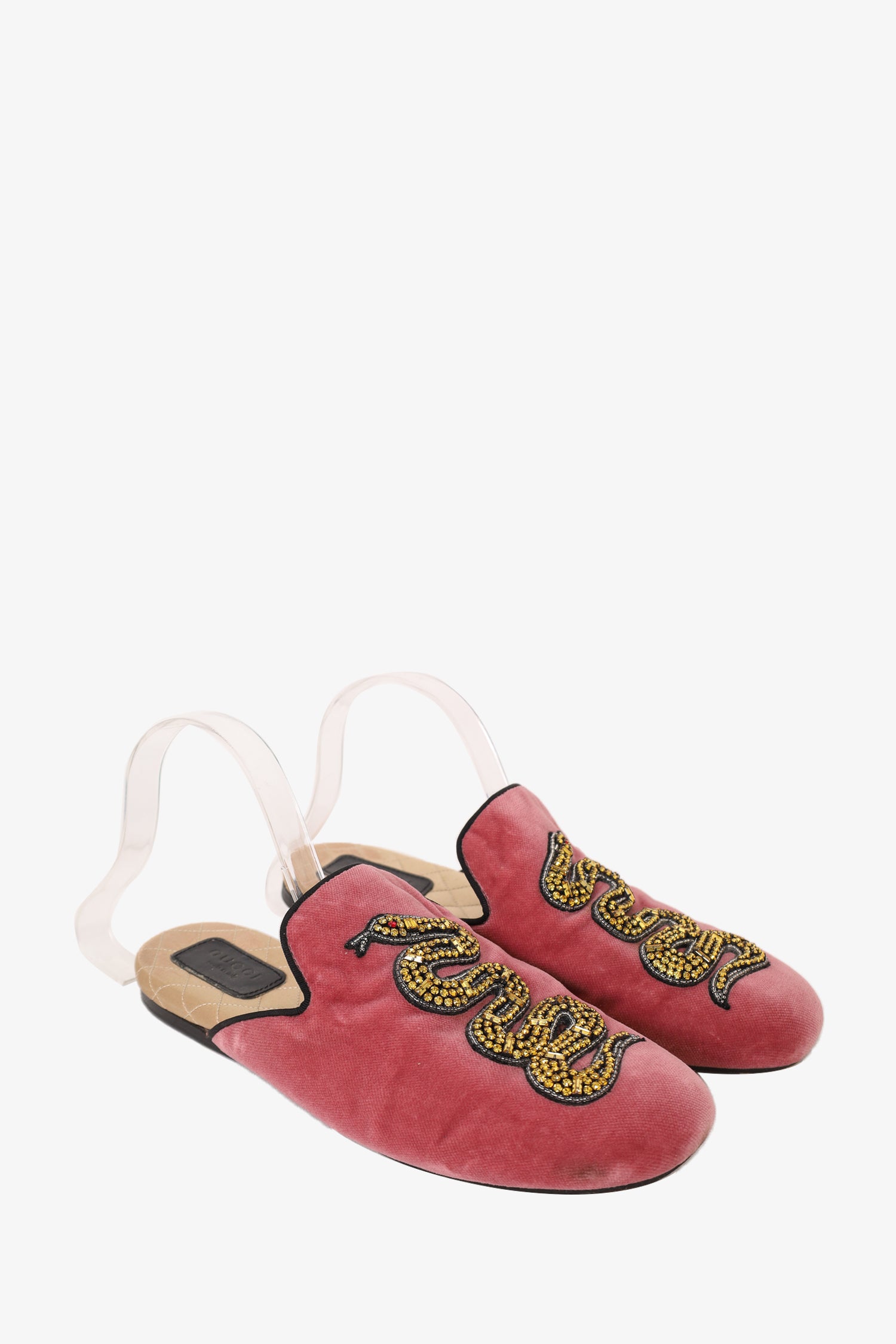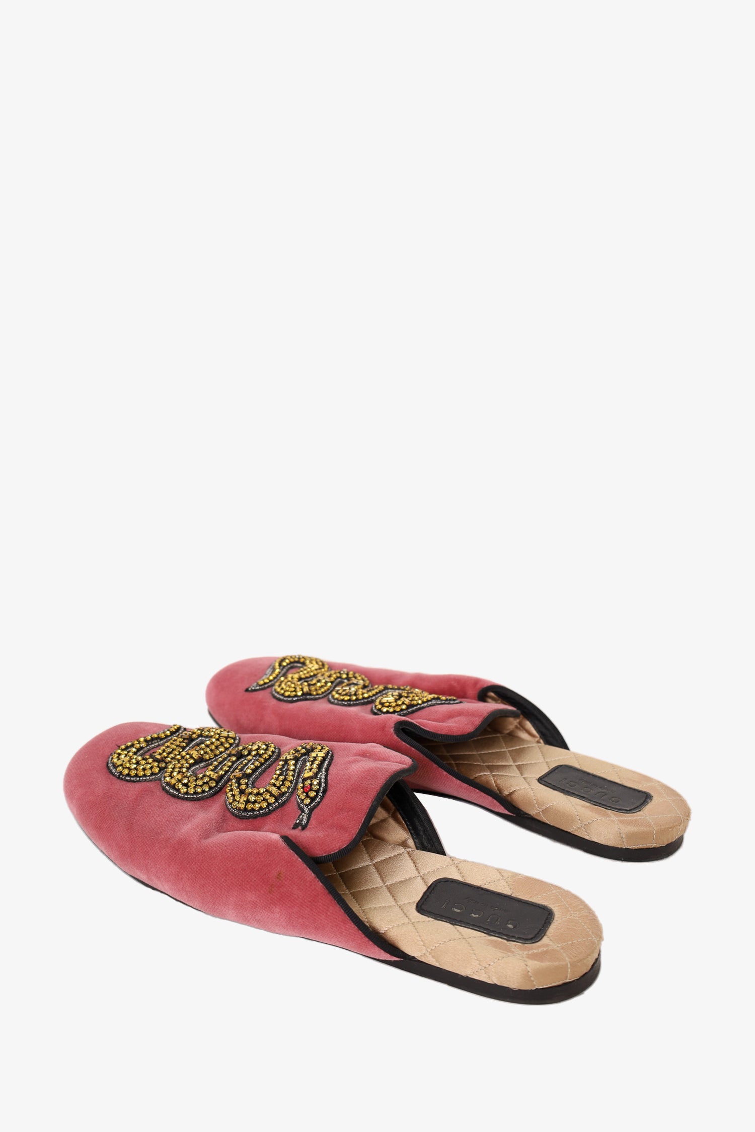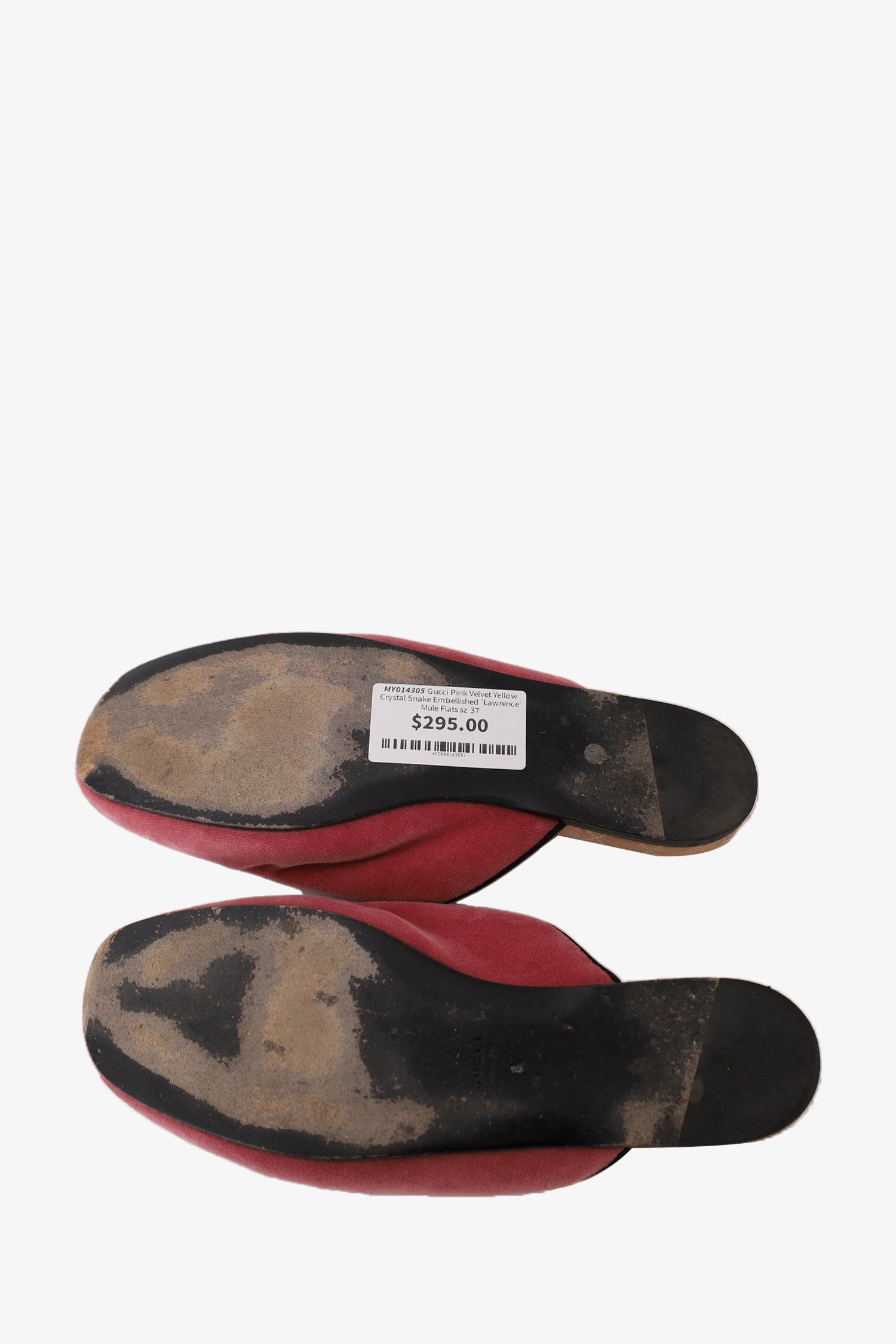 Refresh availabilityGucci Pink Velvet Yellow Crystal Snake Embellished 'Lawrence' Mule Flats. Round toe. Slip-on. Tonal stitching.