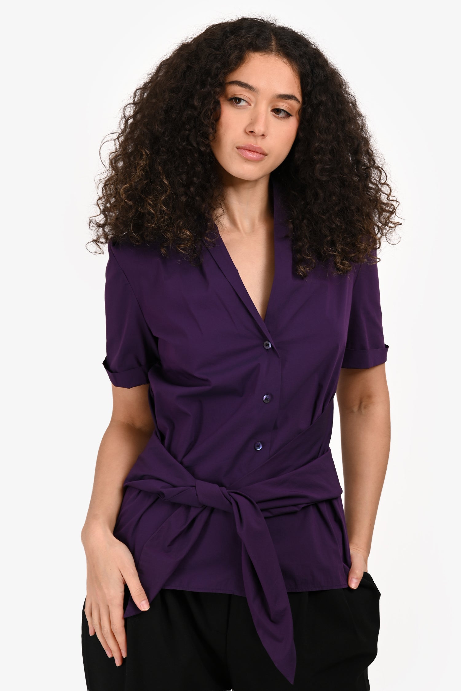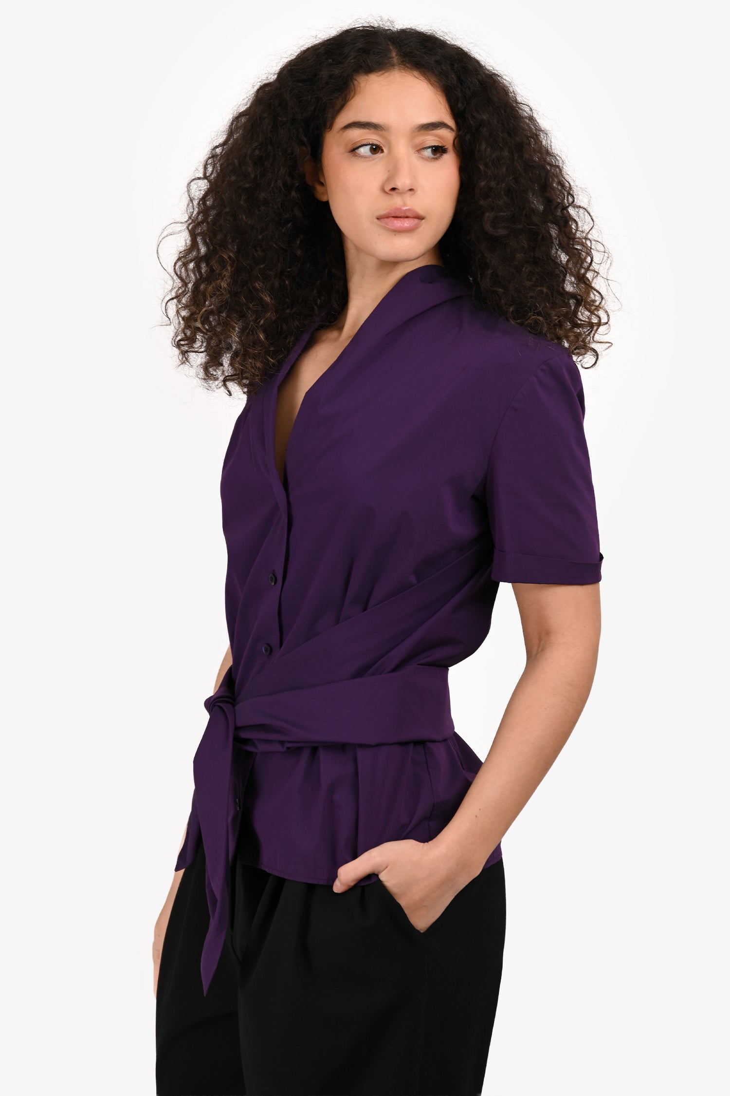 Refresh availabilityGucci Purple Cotton Wrap Buttoned Shirt. Slip-on. V-neckline. Wrap-style front with button closure. Finished sleeve hems. Tonal stitching.