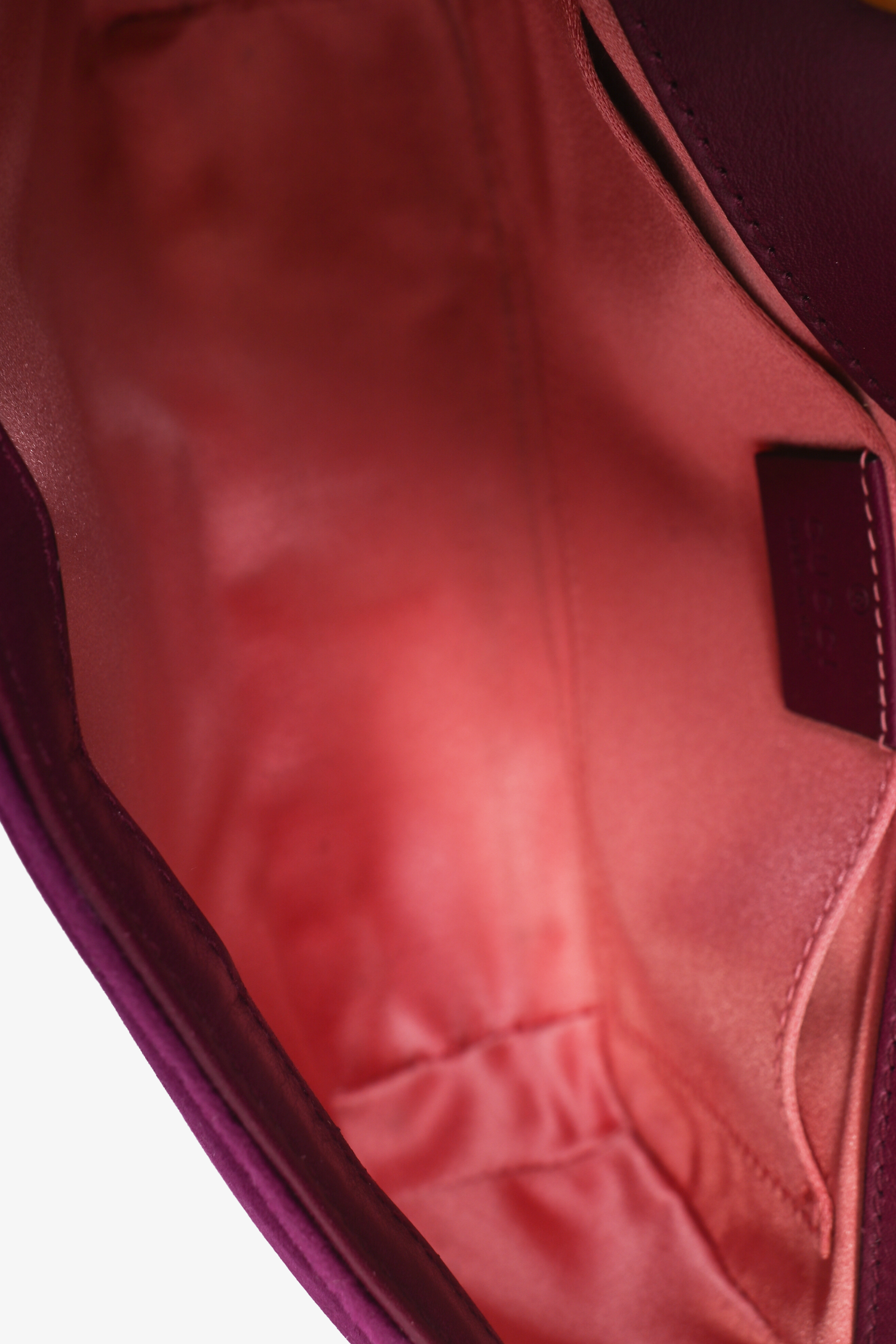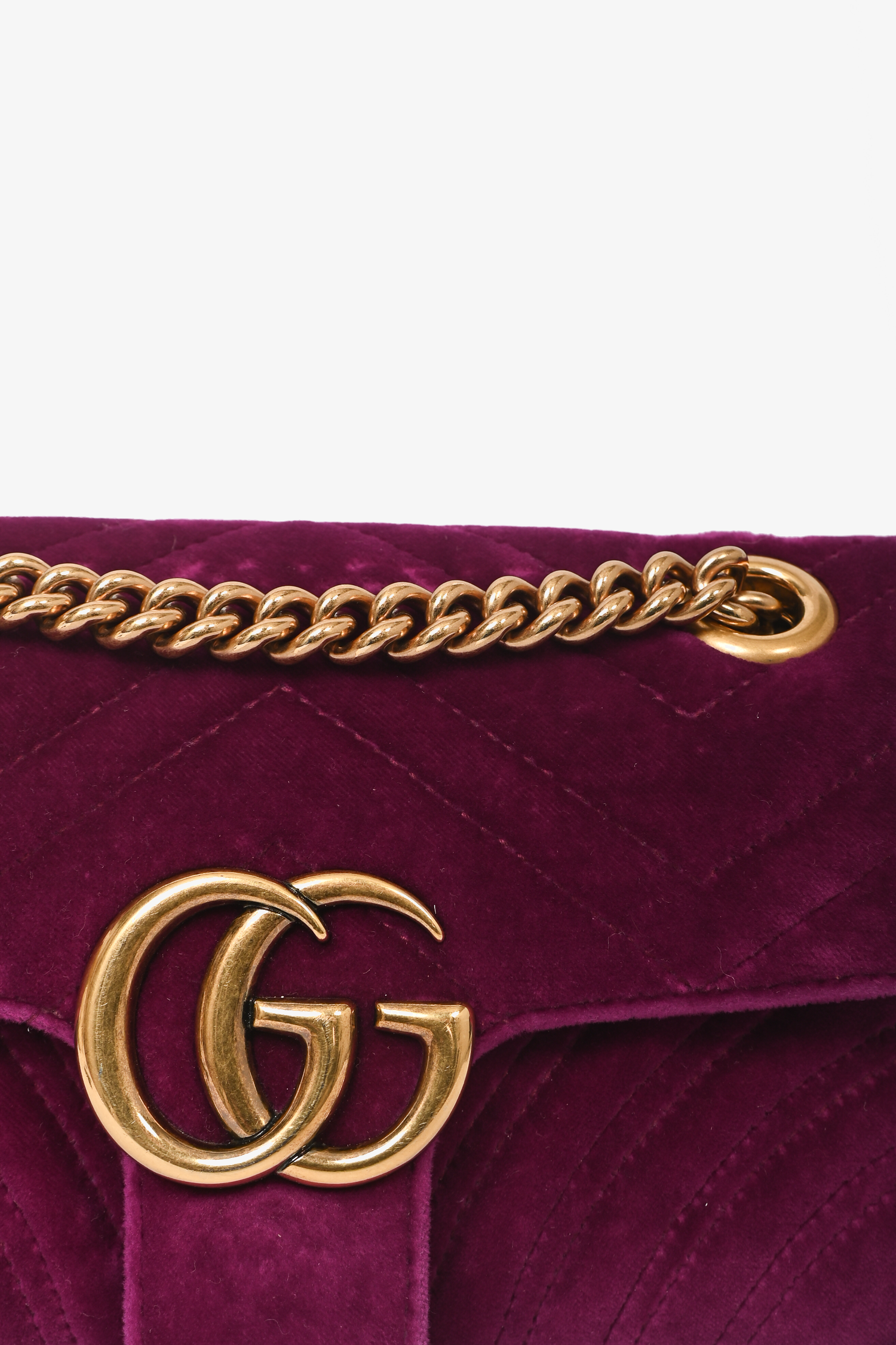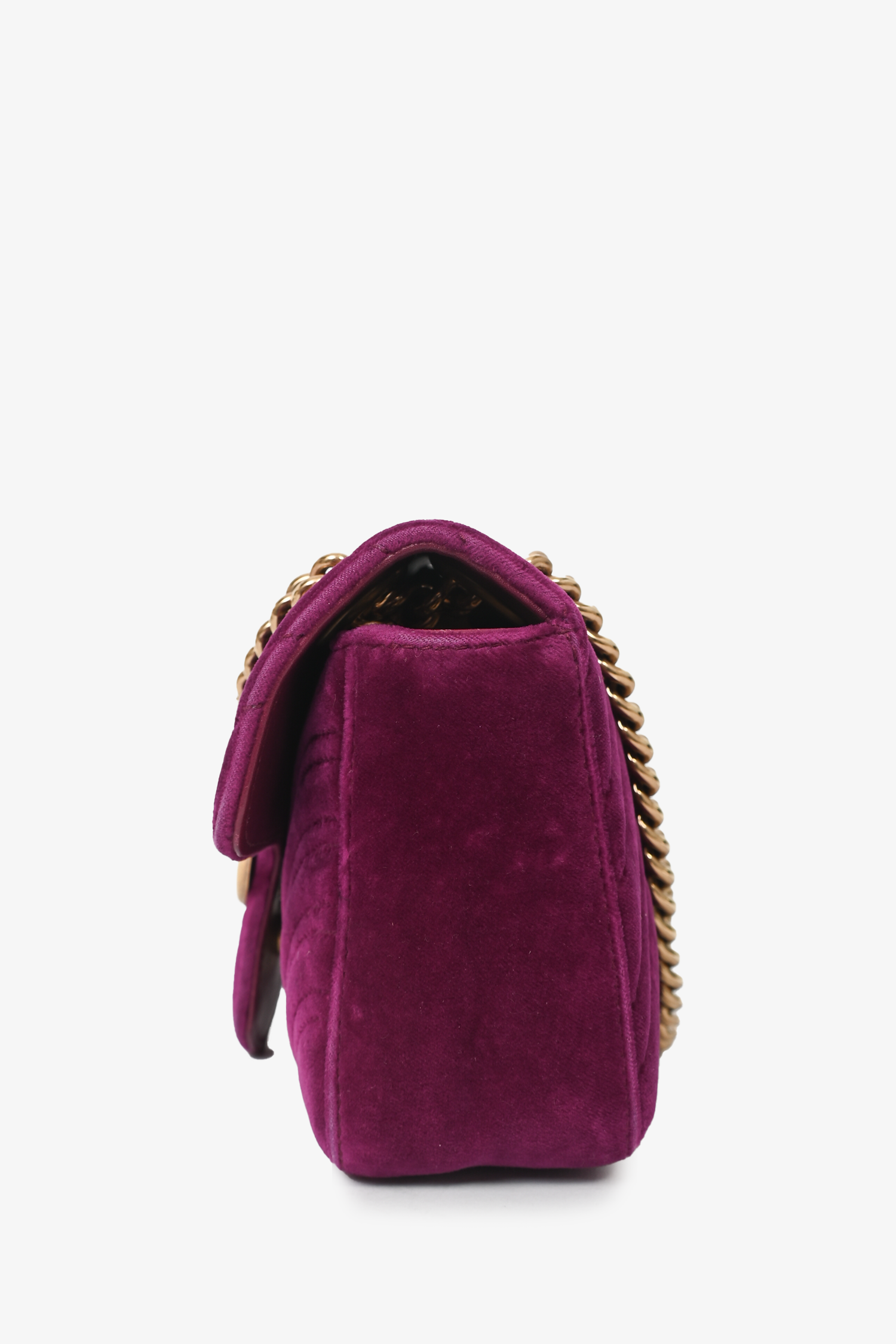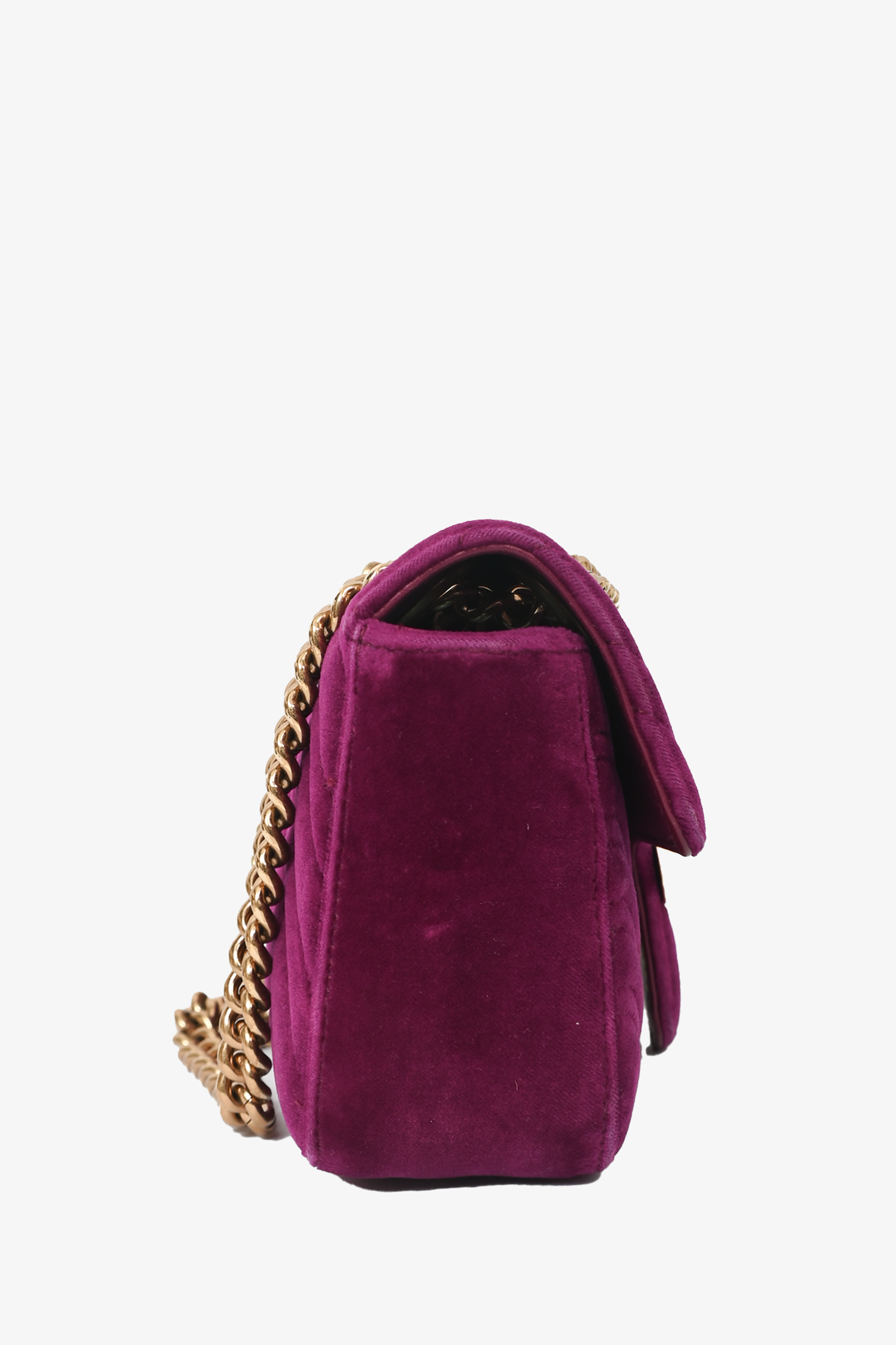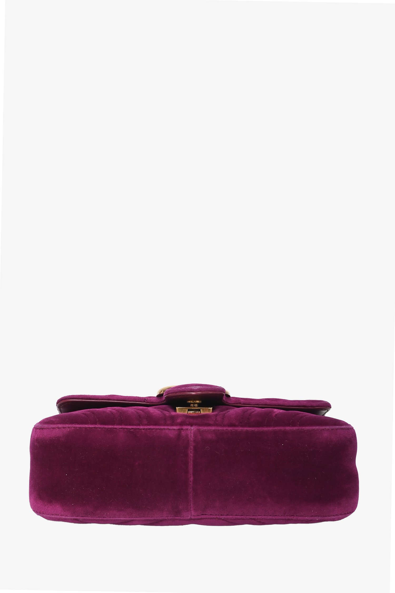 Refresh availabilityGucci Purple Velvet Mini 'Marmont' Shoulder Bag. Fold over flap with button closure. 1 interior slip pocket. Gold-tone hardware. Tonal stitching.