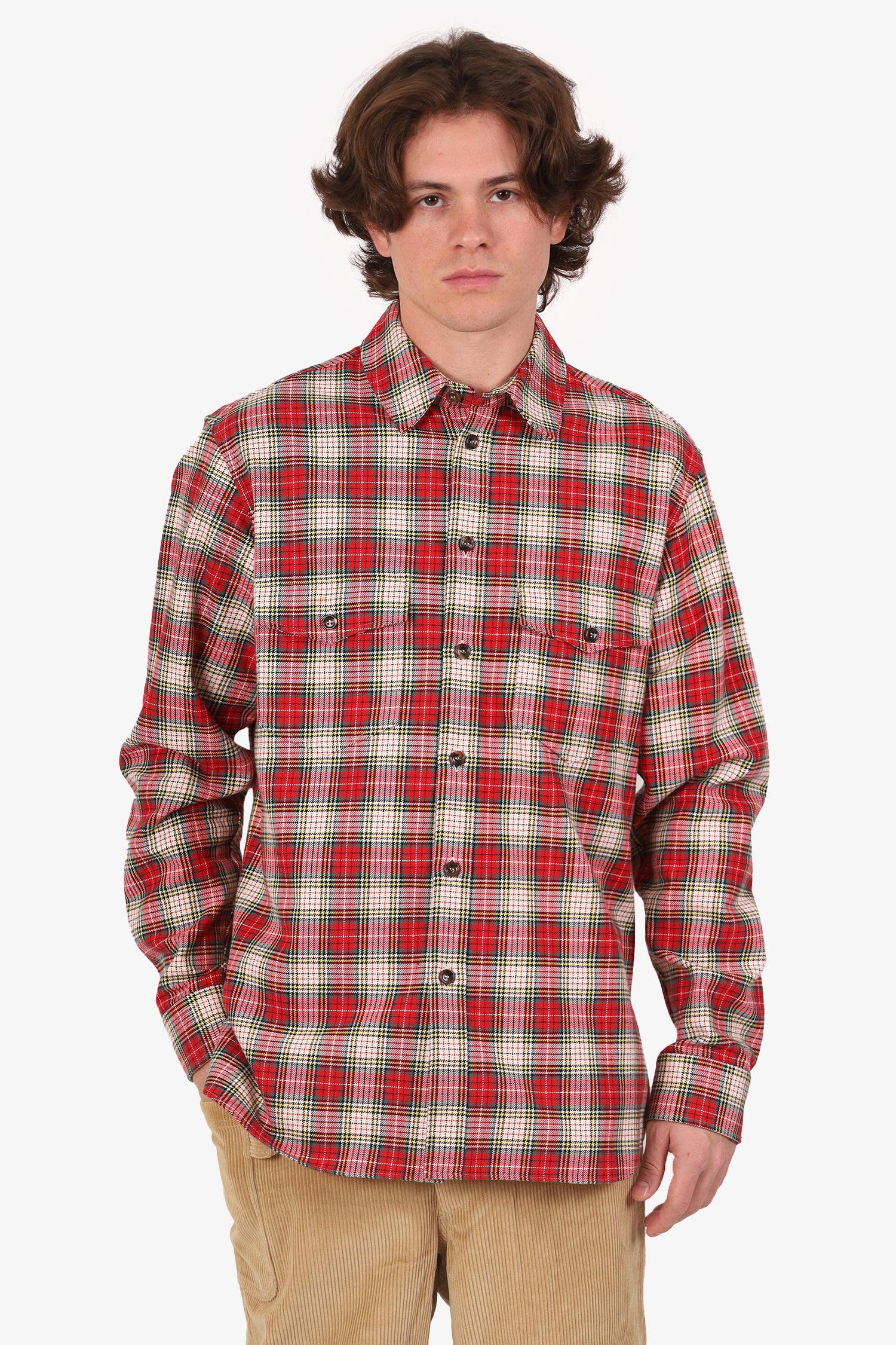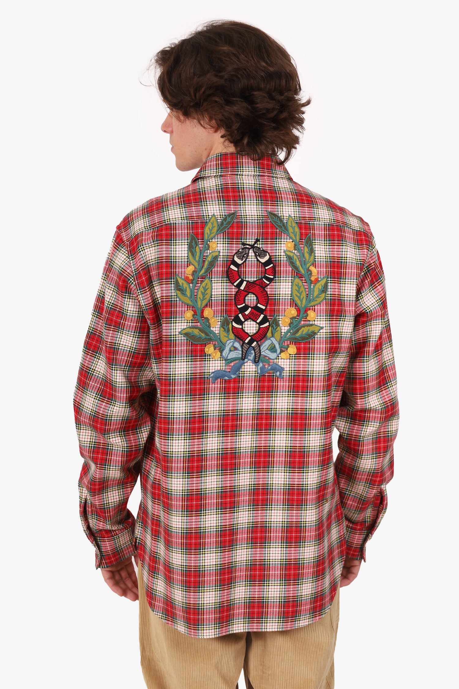Refresh availabilityGucci Red Embroidered Snake Checked Shirt. Pull-on. Collared-neckline. Front button-up closure. Sleeve cuffs with button-up closure. 2 front exterior flap pockets with button-up closure. Rear embroidered graphic. Tonal stitching.