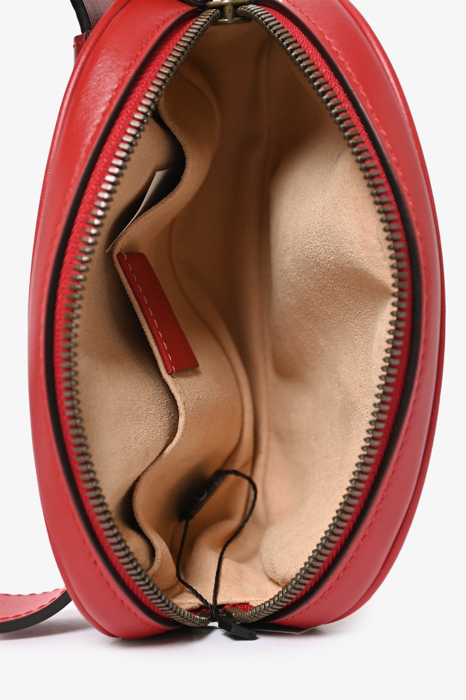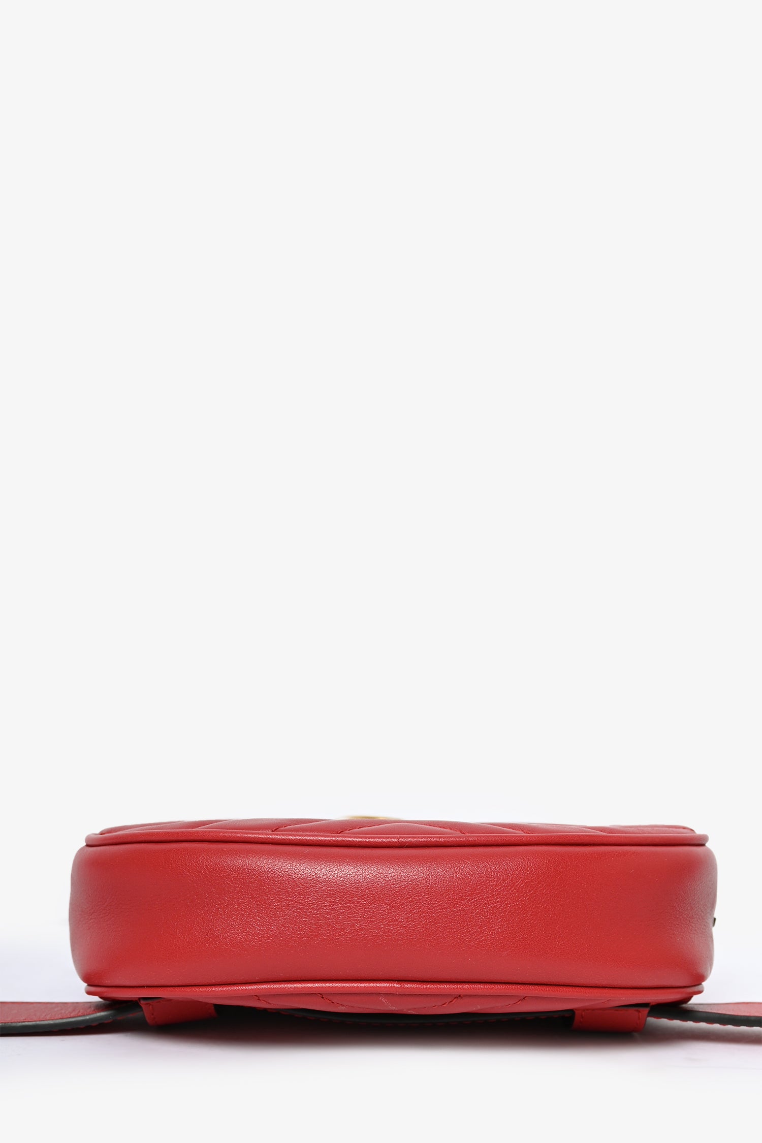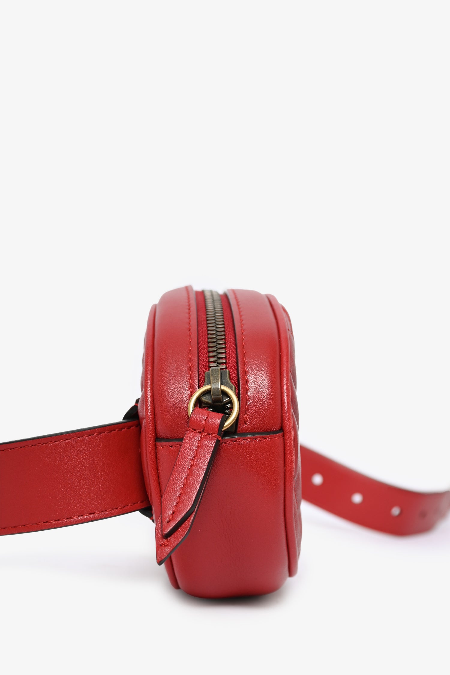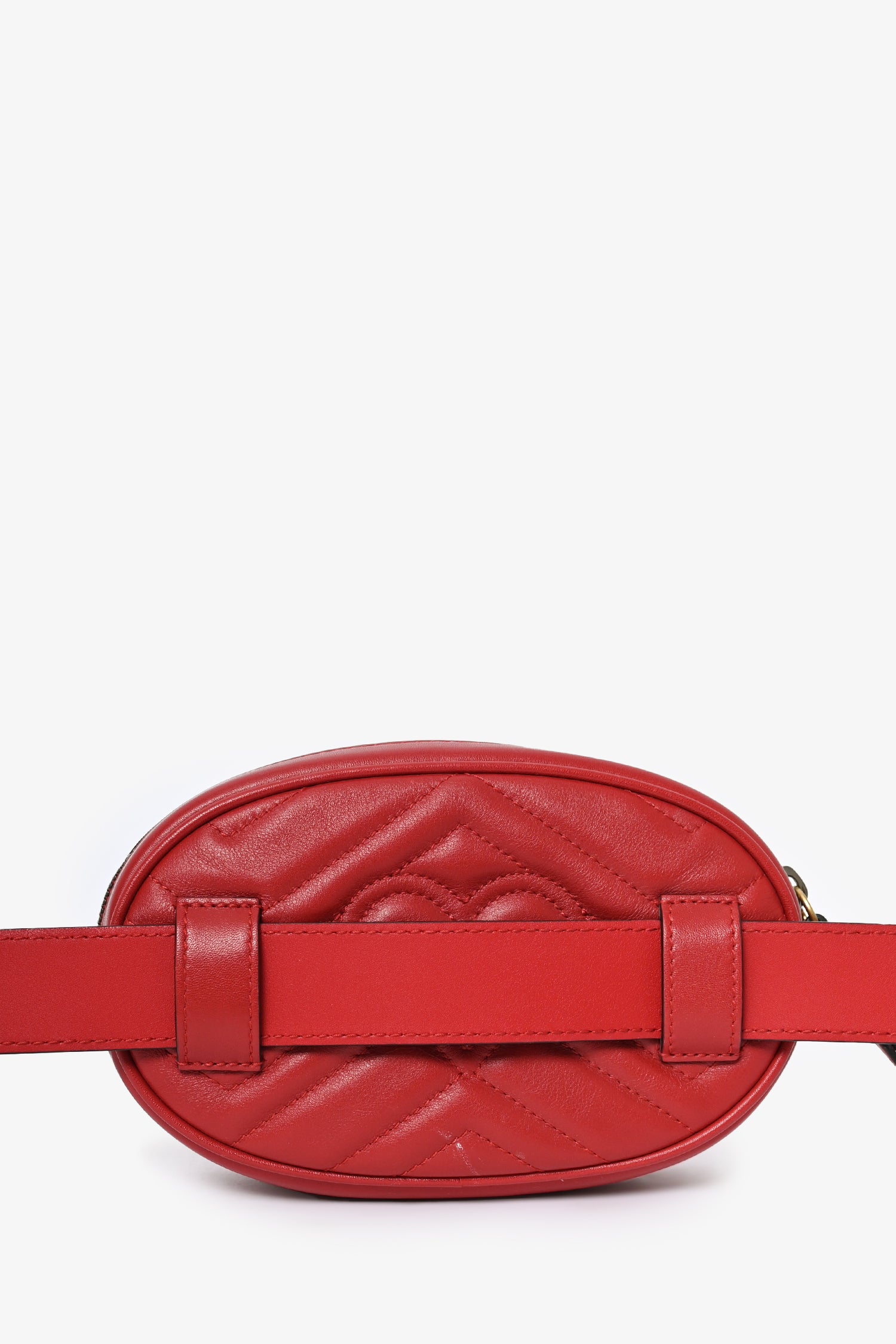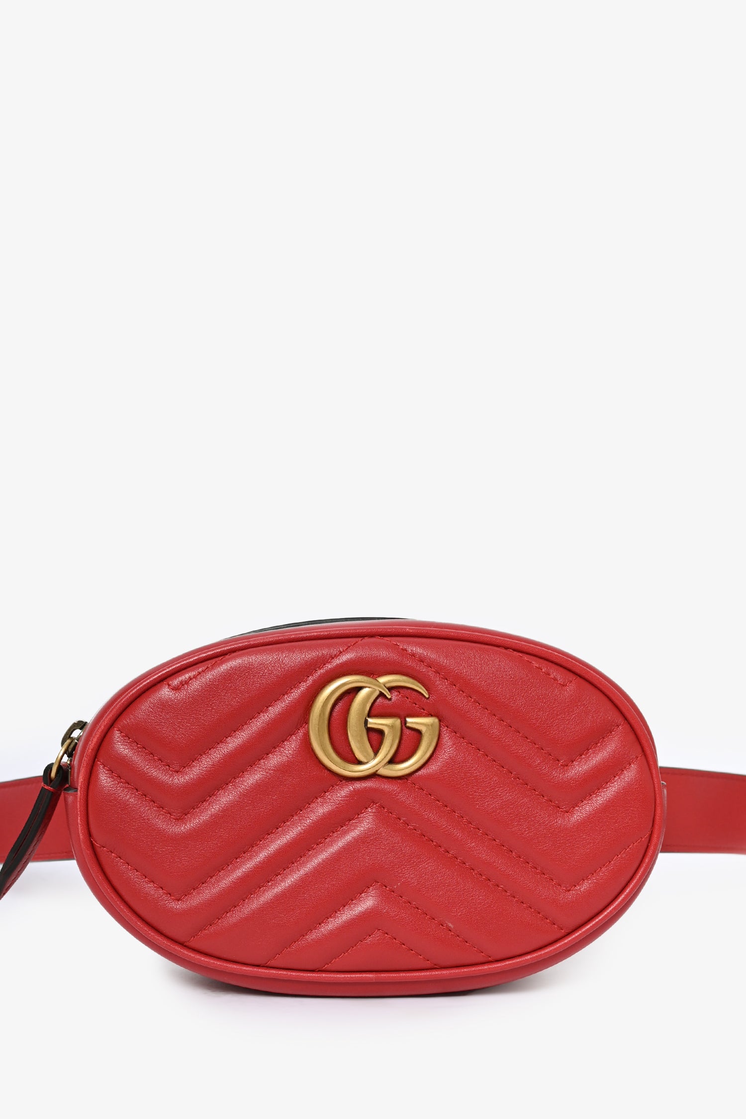 Refresh availabilityGucci Red GG Marmont Belt Bag. Tonal stitching. Antiqued gold-toned hardware. Leather trimming. Suede-lined interior with back pocket. Adjustable belt.