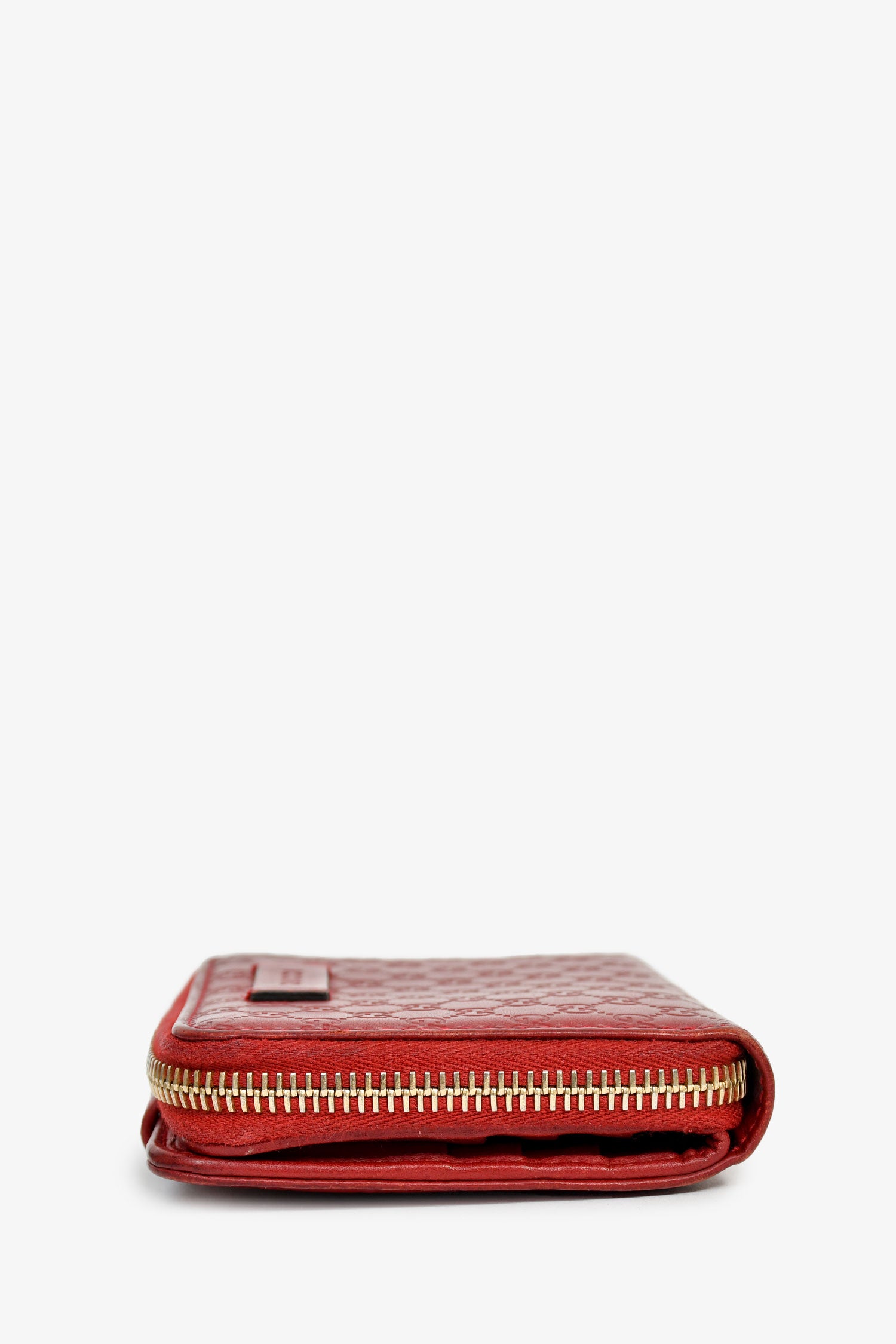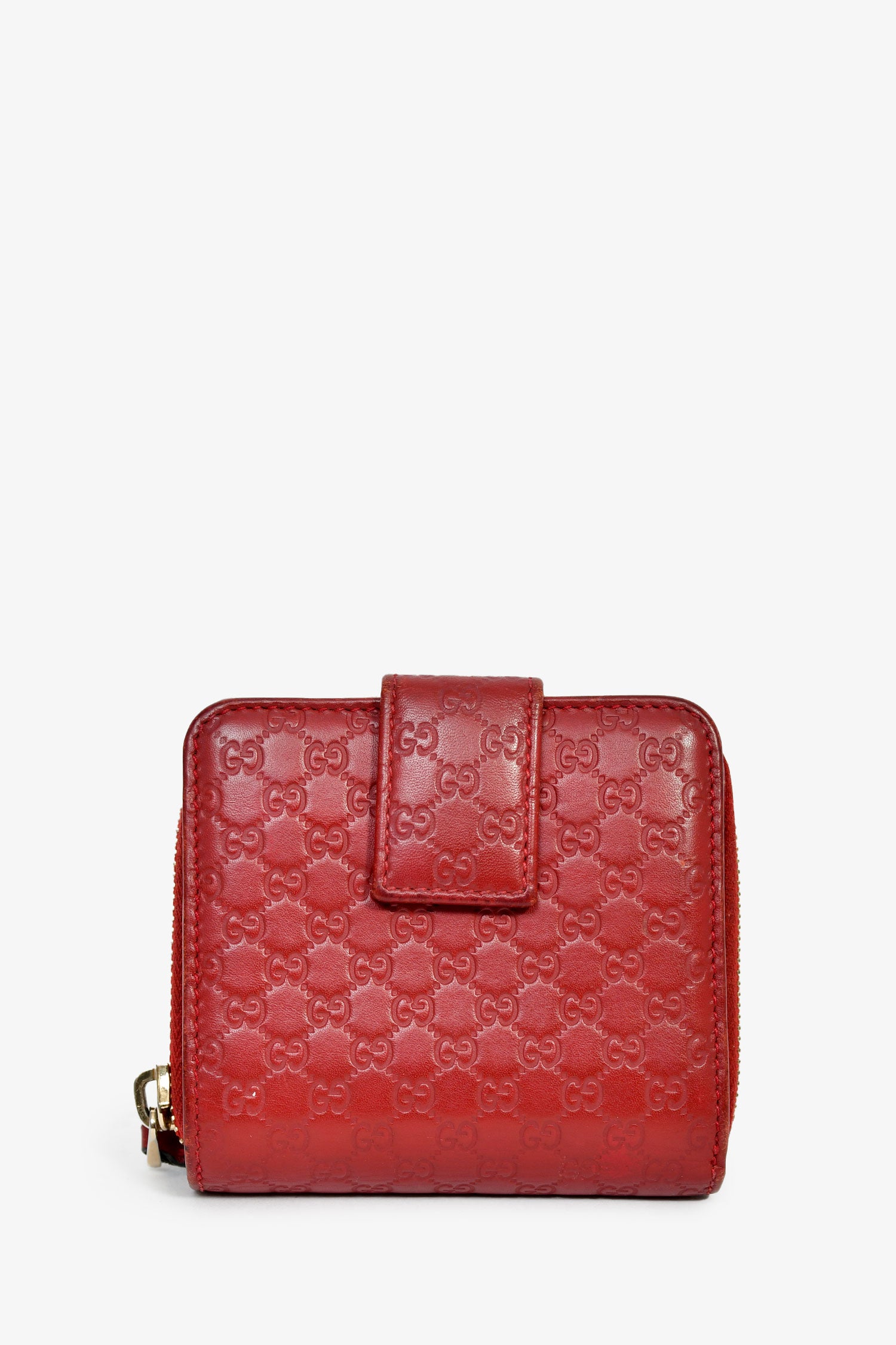 Refresh availabilityGucci Red Guccissima Embossed Leather Compact Wallet. Front fold-over strap with snap-button closure. 8 card slots. 1 billfold compartment. 1 zippered coin compartment. Gold-tone hardware. Tonal stitching.