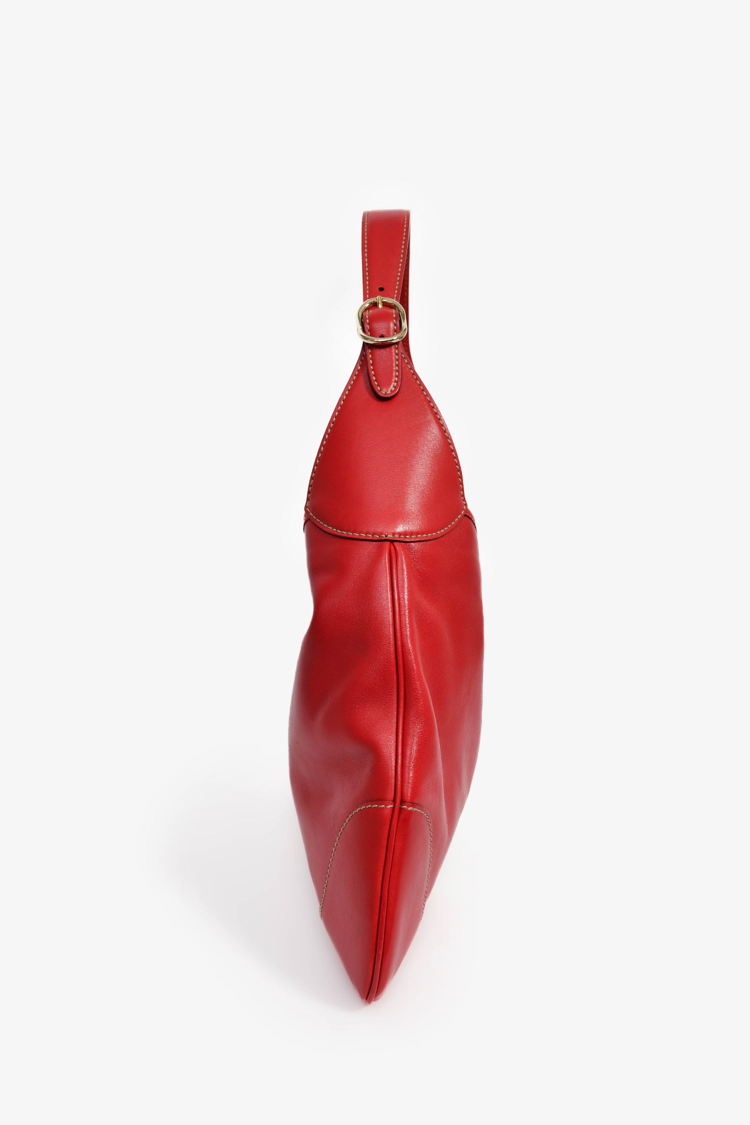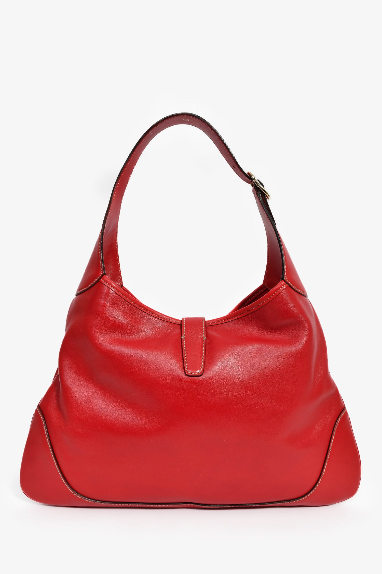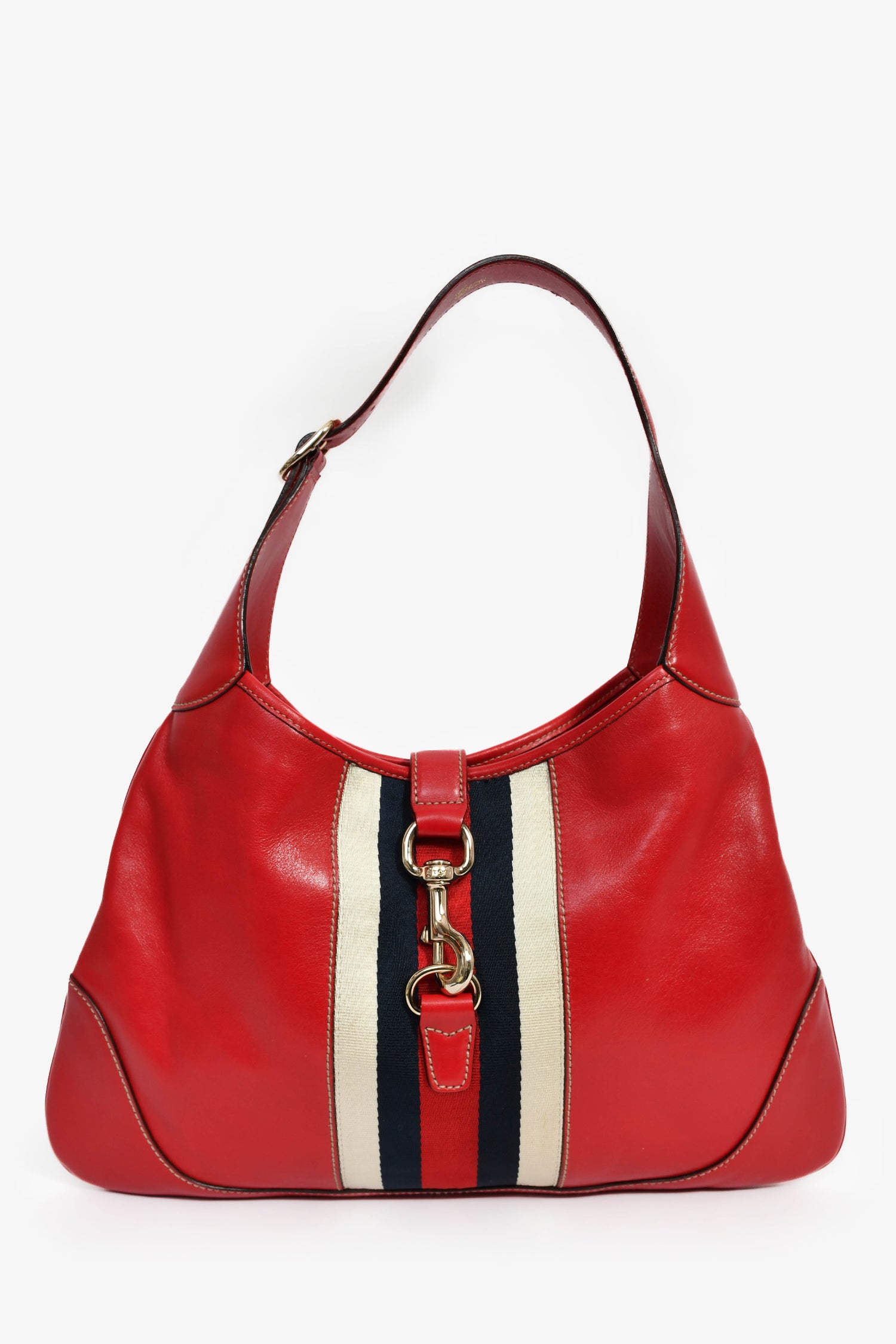 Refresh availabilityGucci Red Leather Canvas Stripe Medium Jackie Bag. Front fold-over strap with a lobster clasp closure. Single shoulder strap with buckle fastening. Lined canvas interior with 2 pockets; 1 zip and 1 slip. Gold-tone hardware. Tonal stitching.