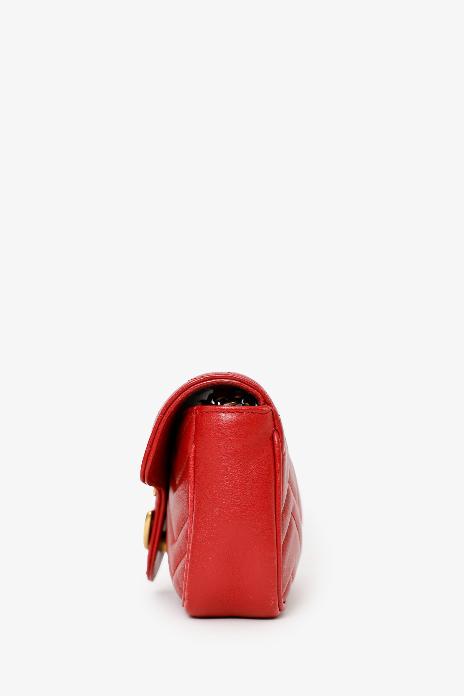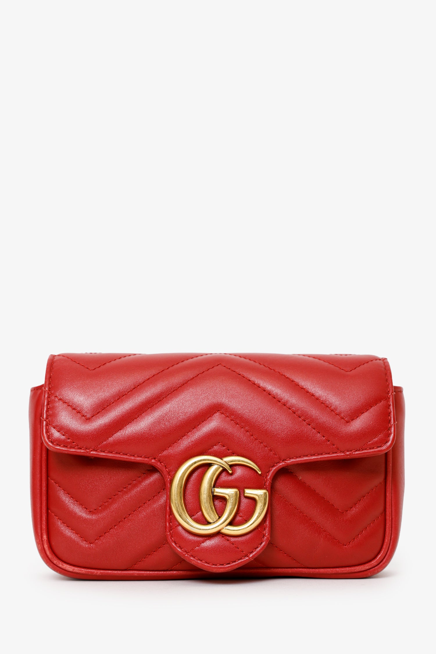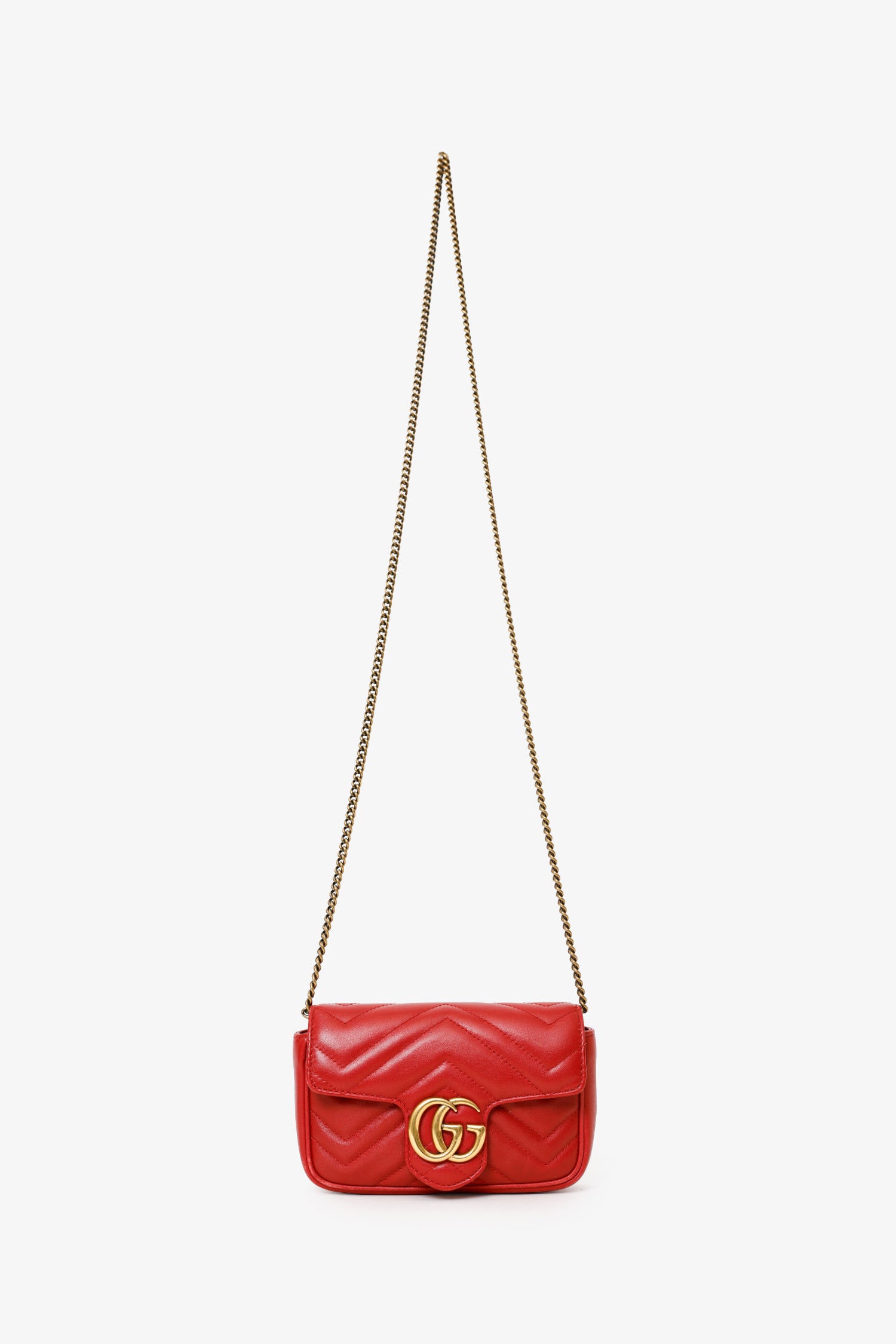 Refresh availabilityGucci Red Leather GG Marmont Super Mini Crossbody Bag. Front fold-over flap with snap button closure. Crossbody chainlink strap. Open suede-lined interior. Gold-tone hardware. Tonal stitching.