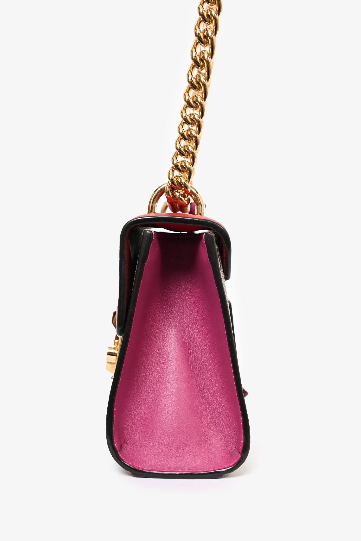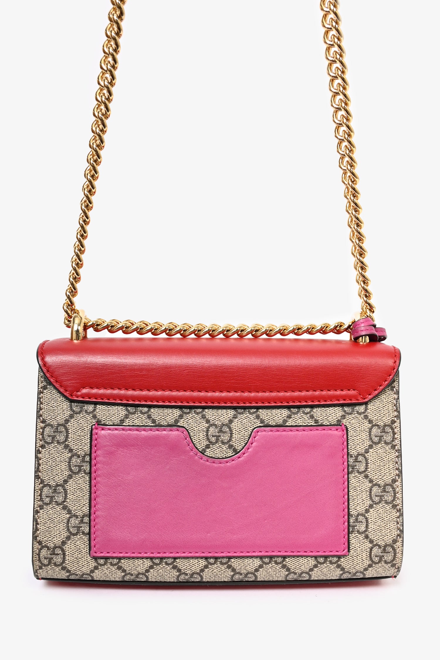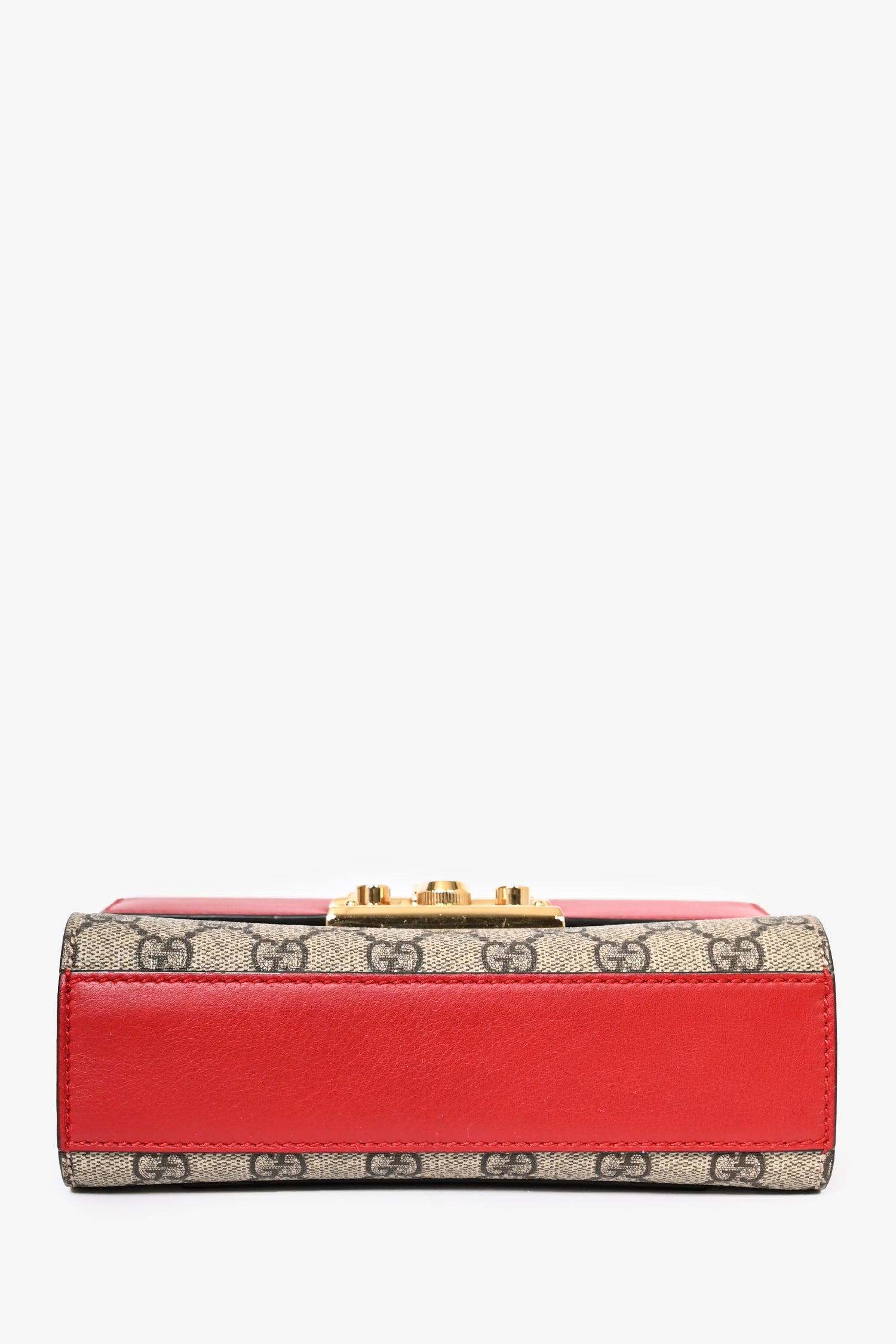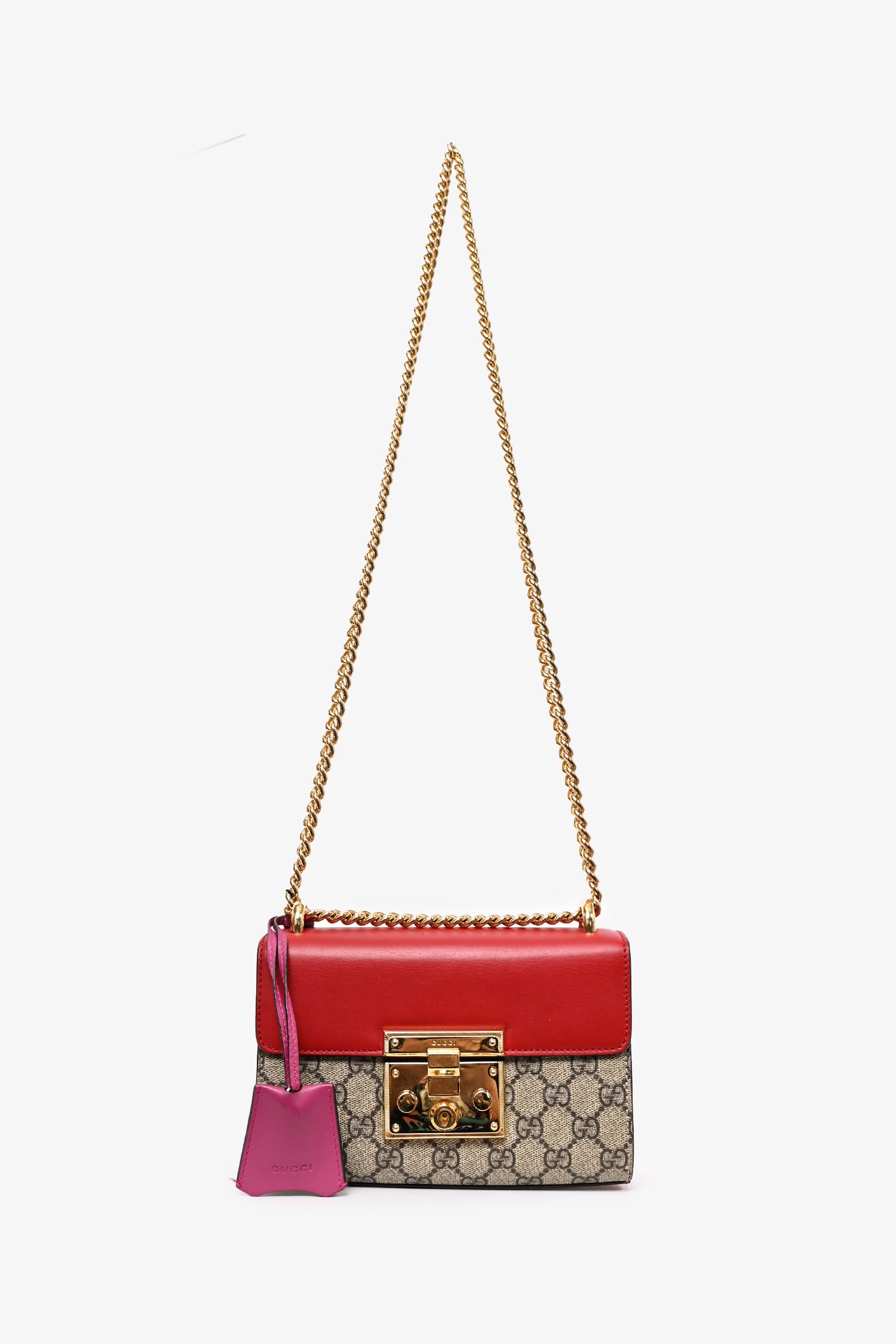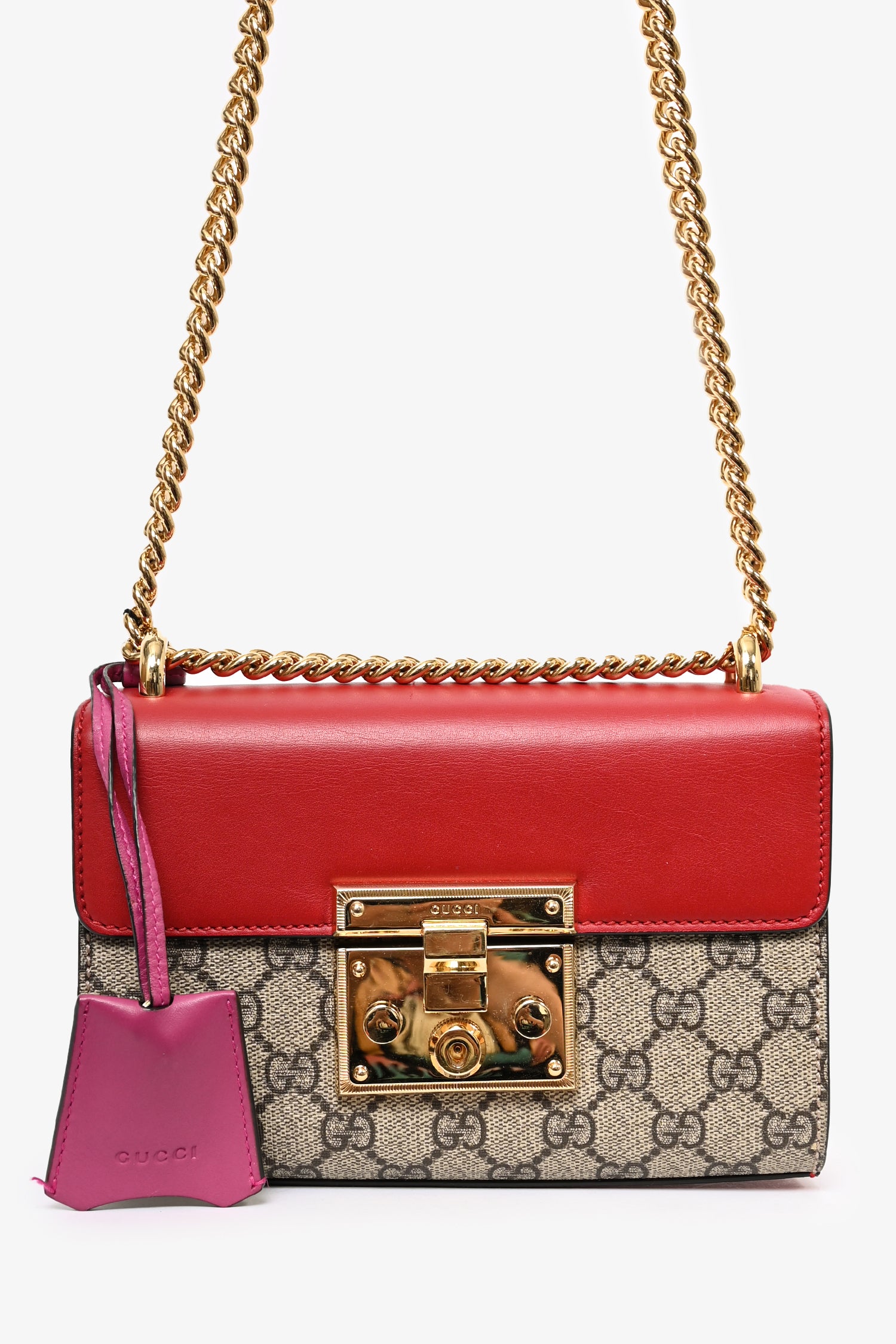 Refresh availabilityGucci Red Leather GG Supreme Small Padlock Bag. Gold-tone hardware. Tonal stitching. Fold-over flap. Push-open closure. Chain-link crossbody strap. Attached clochette. Suede lined interior with a single interior compartment.